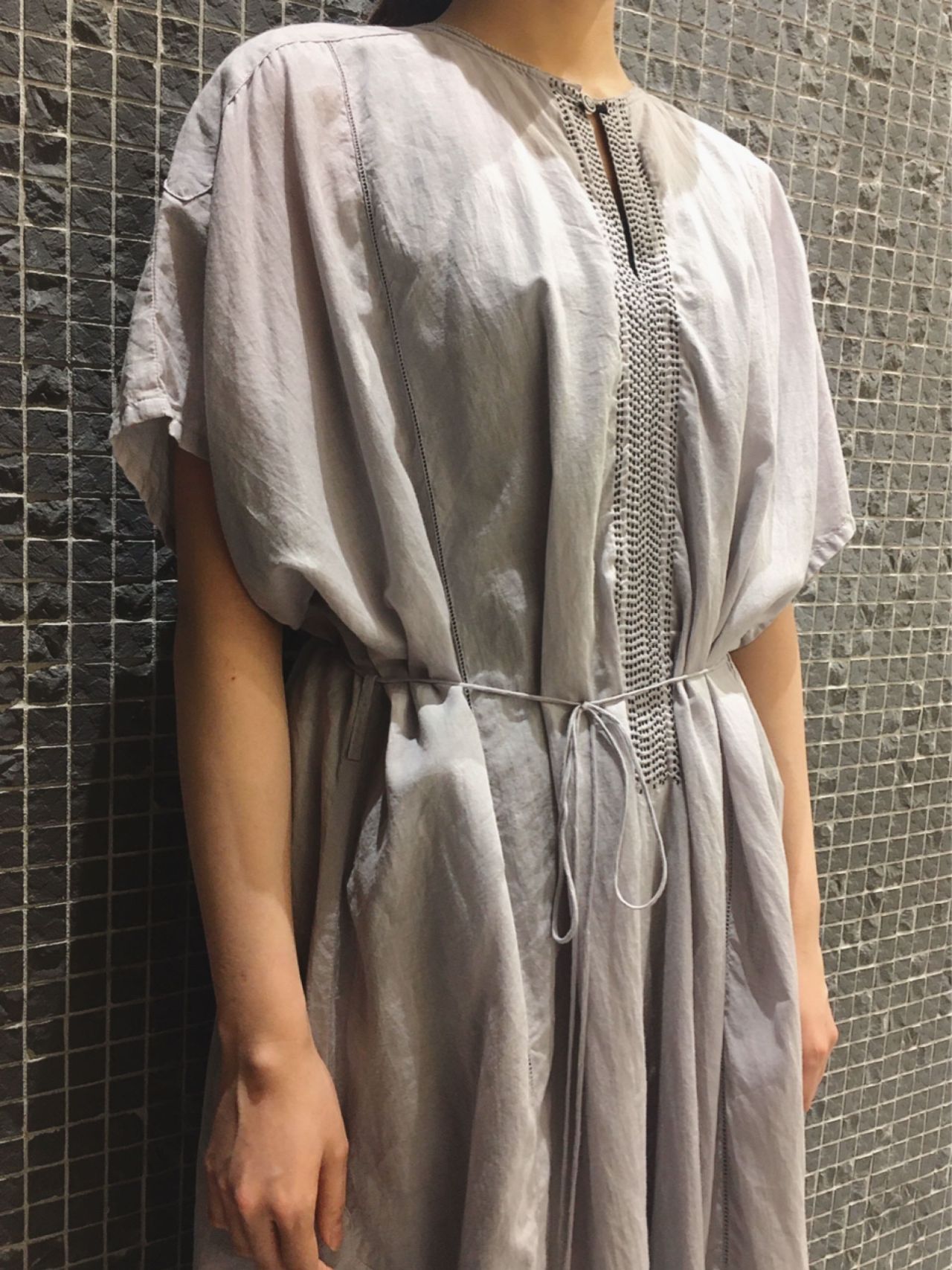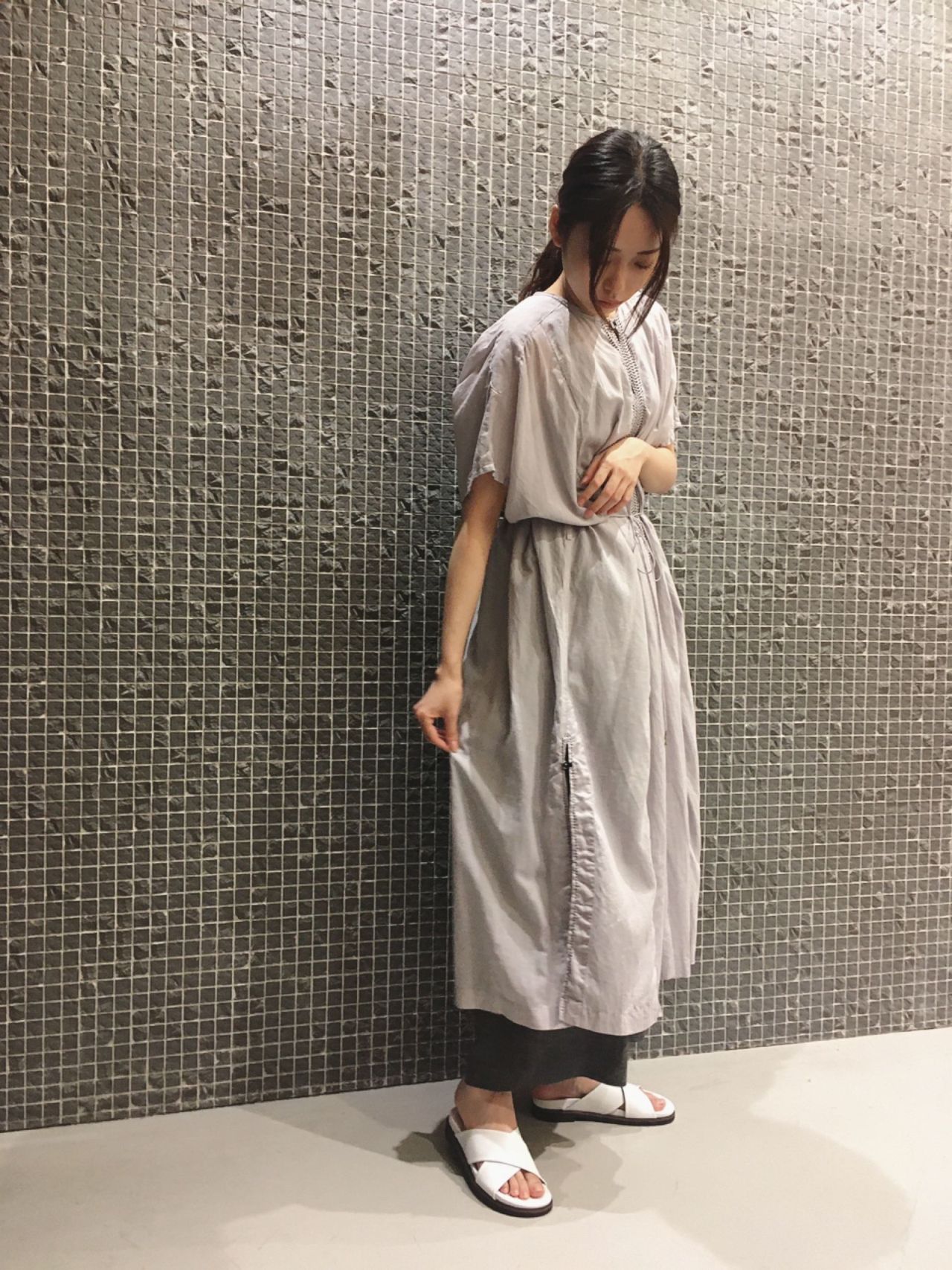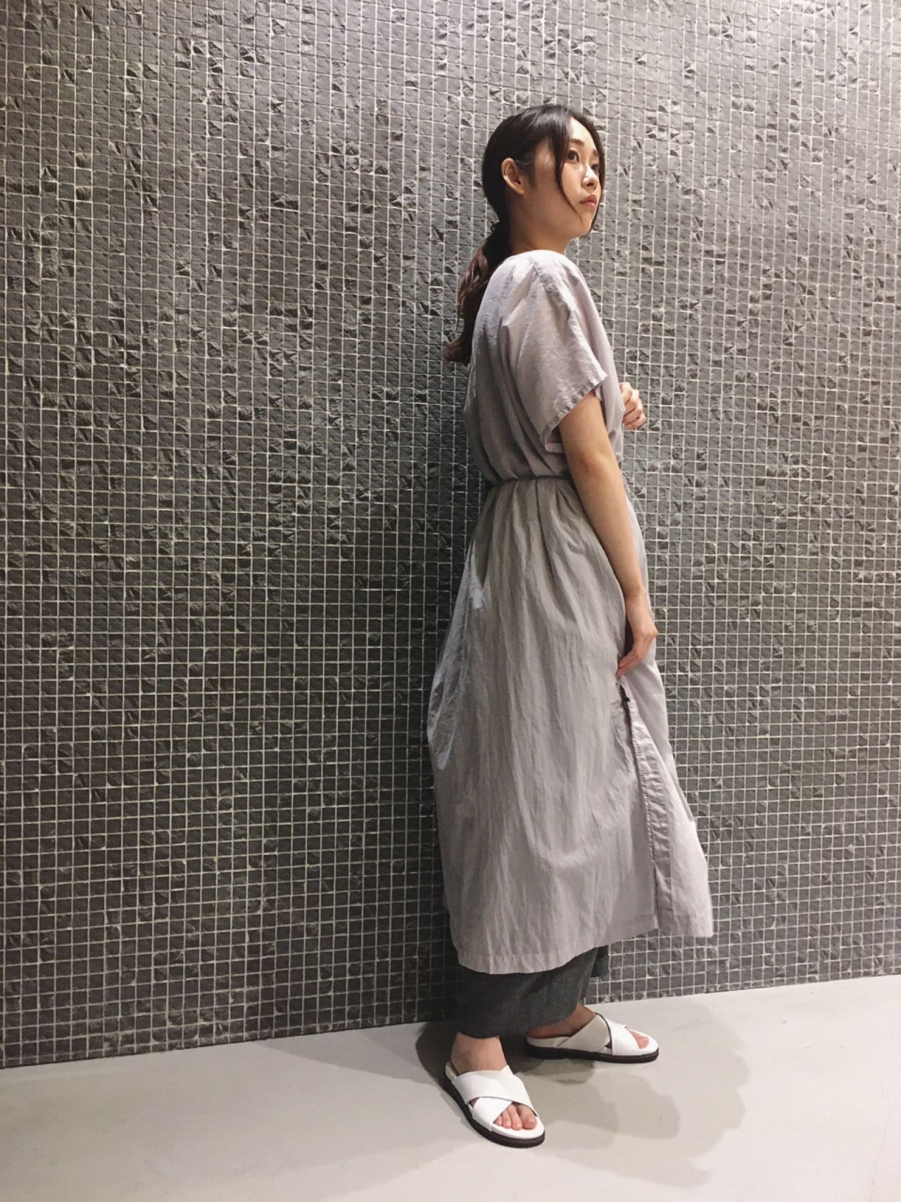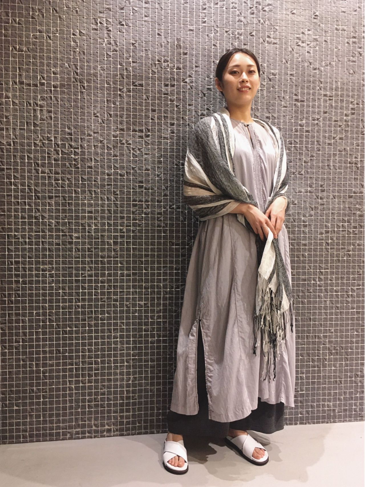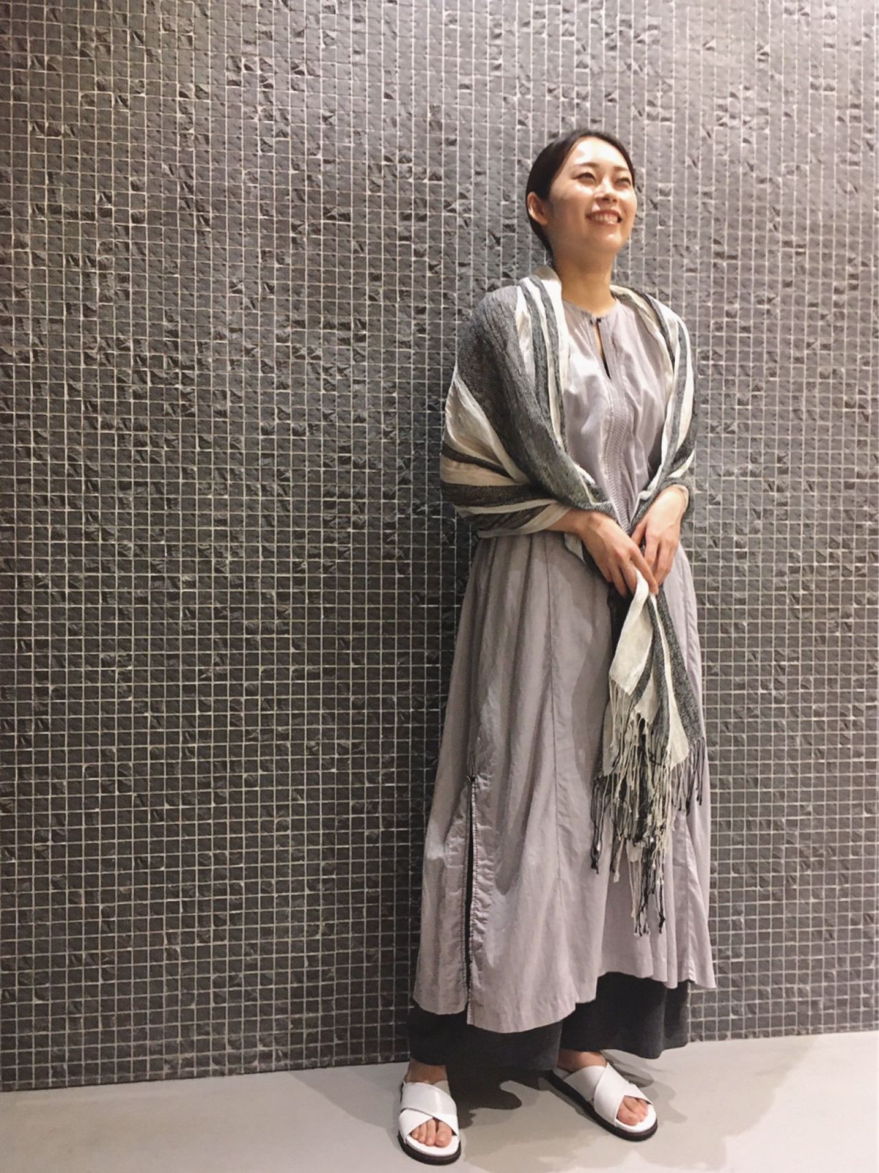 グレーのワントーンコーディネートはサンダルとストールの白をアクセントに。