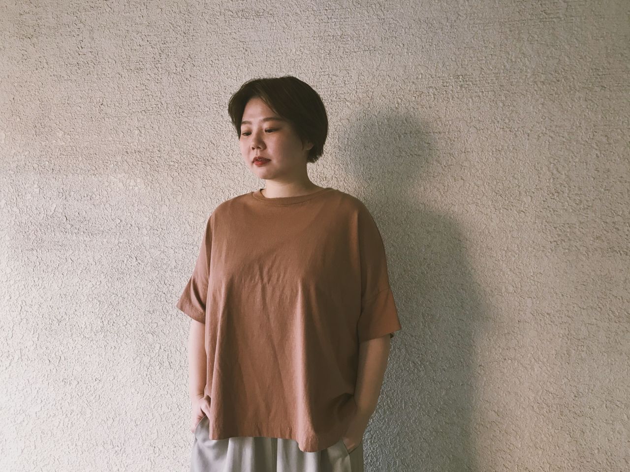 合わせたのは2019年のカゴ染めのカットソー、パンツは2018年のもので毎年人気のストレッチパンツです。とても履きやすいので、色違いでカーキも持っています。