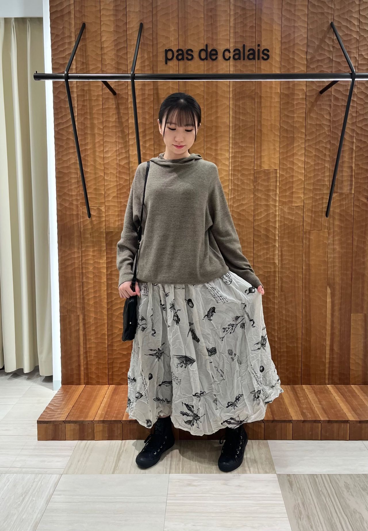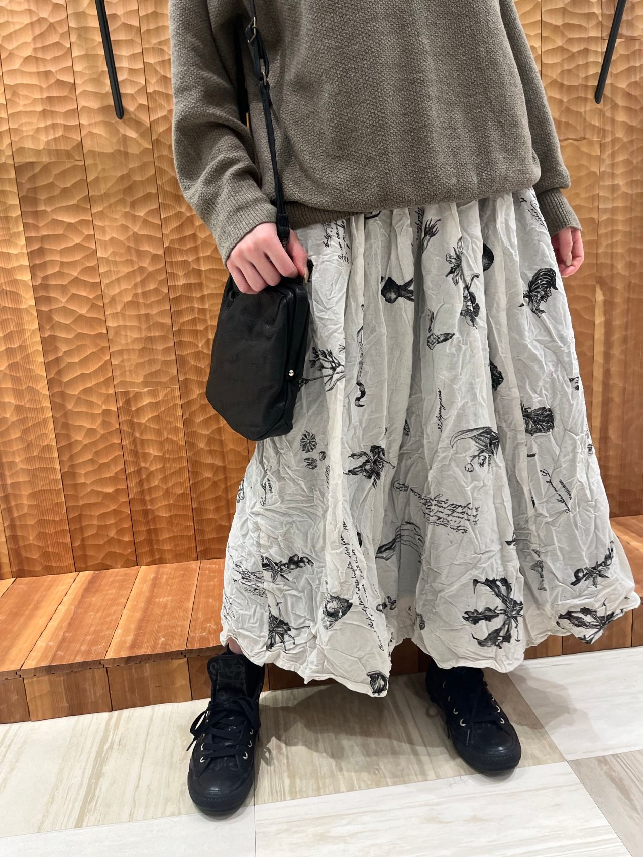 丈感はふくらはぎあたりで、まち付きのポケットがポイント。