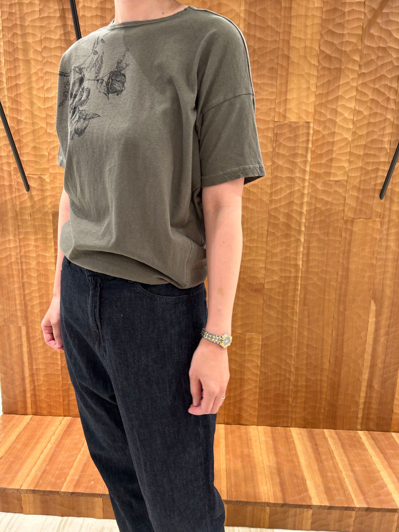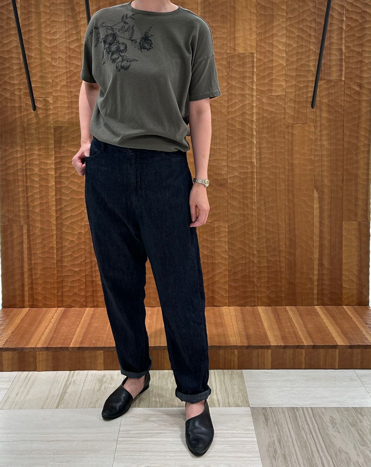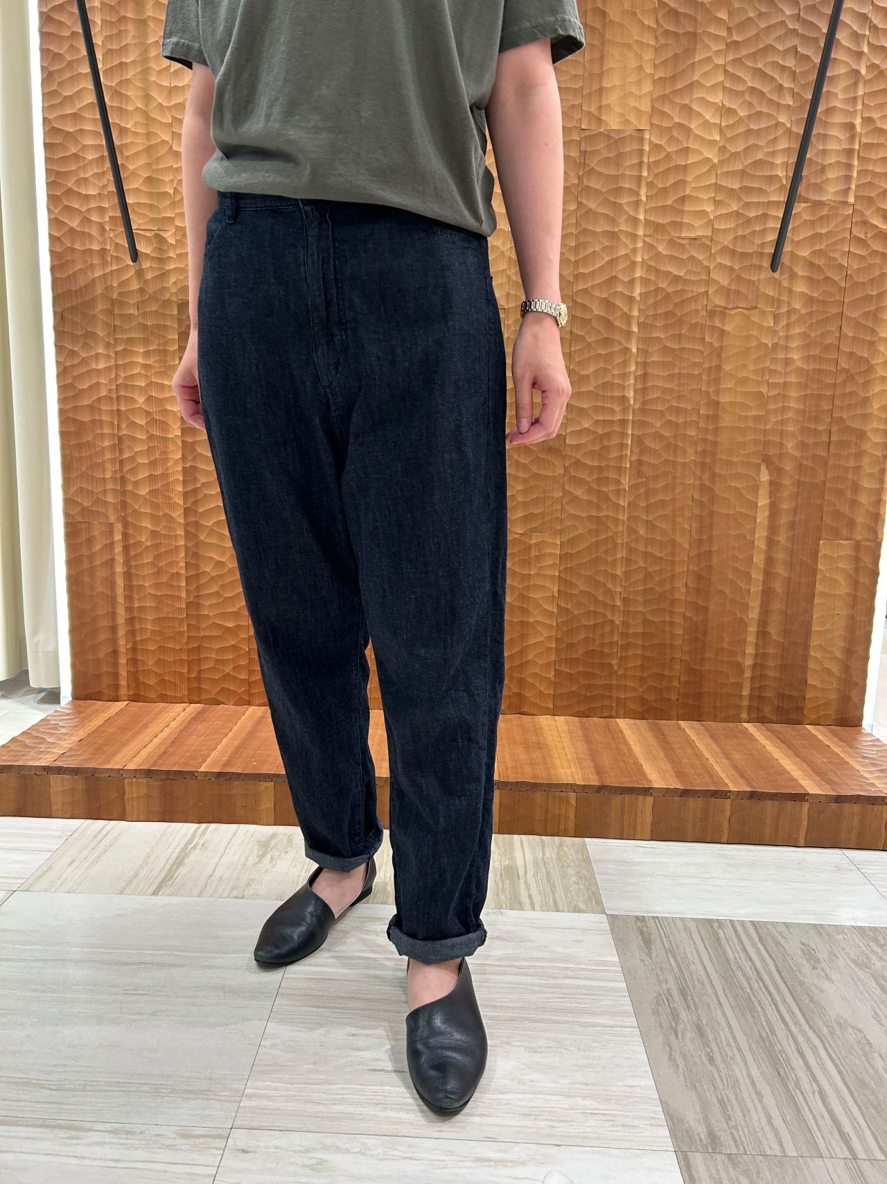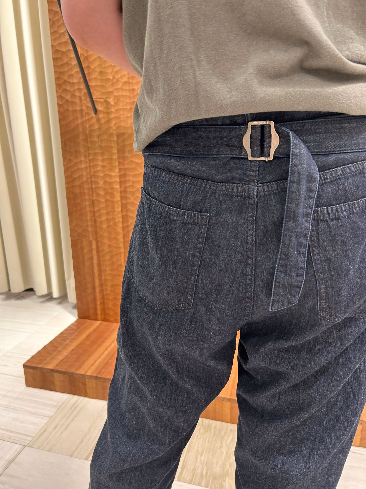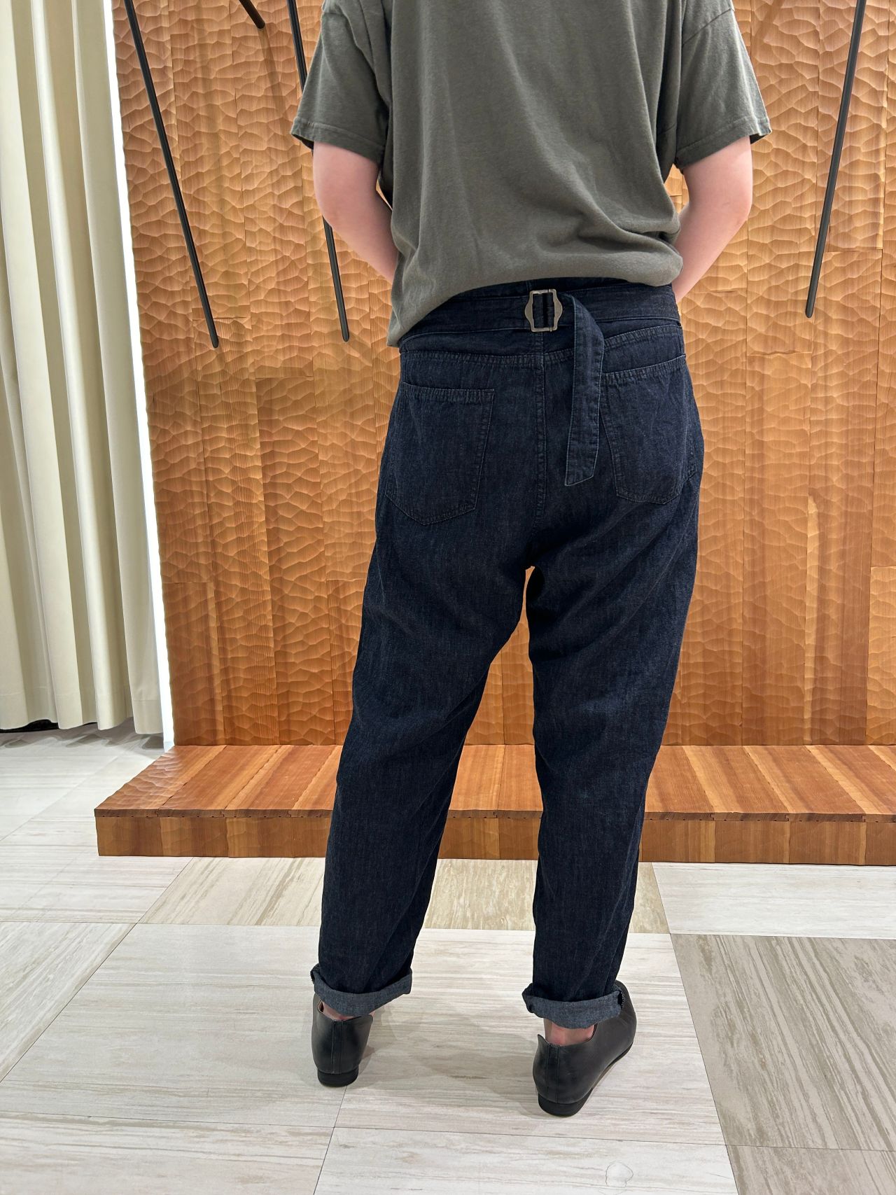 股上はやや深めのリラックス感のあるテーパードパンツです。後ろの飾りベルトの送りカンを絞ればハイウエスト テーパードデニムとしても着用できます。