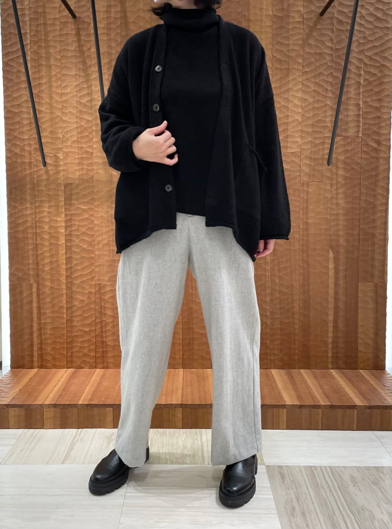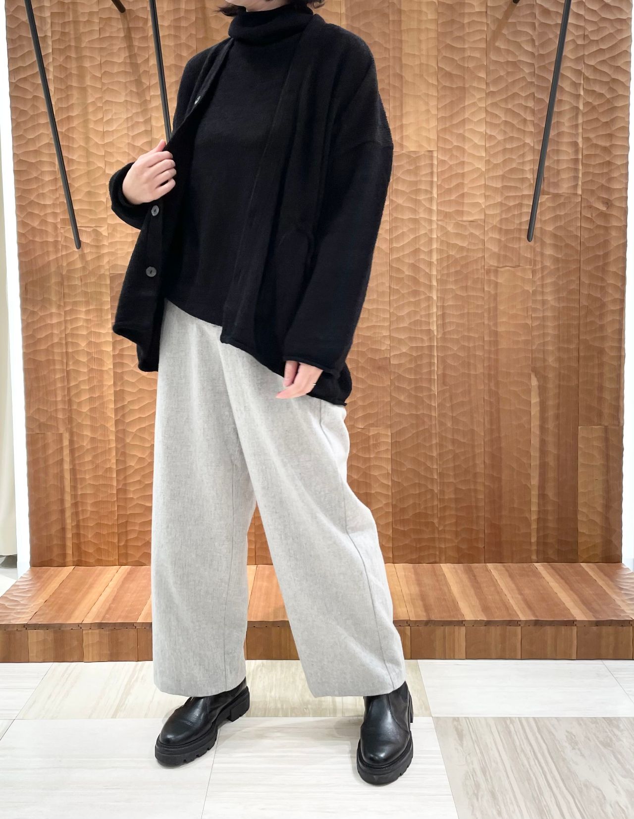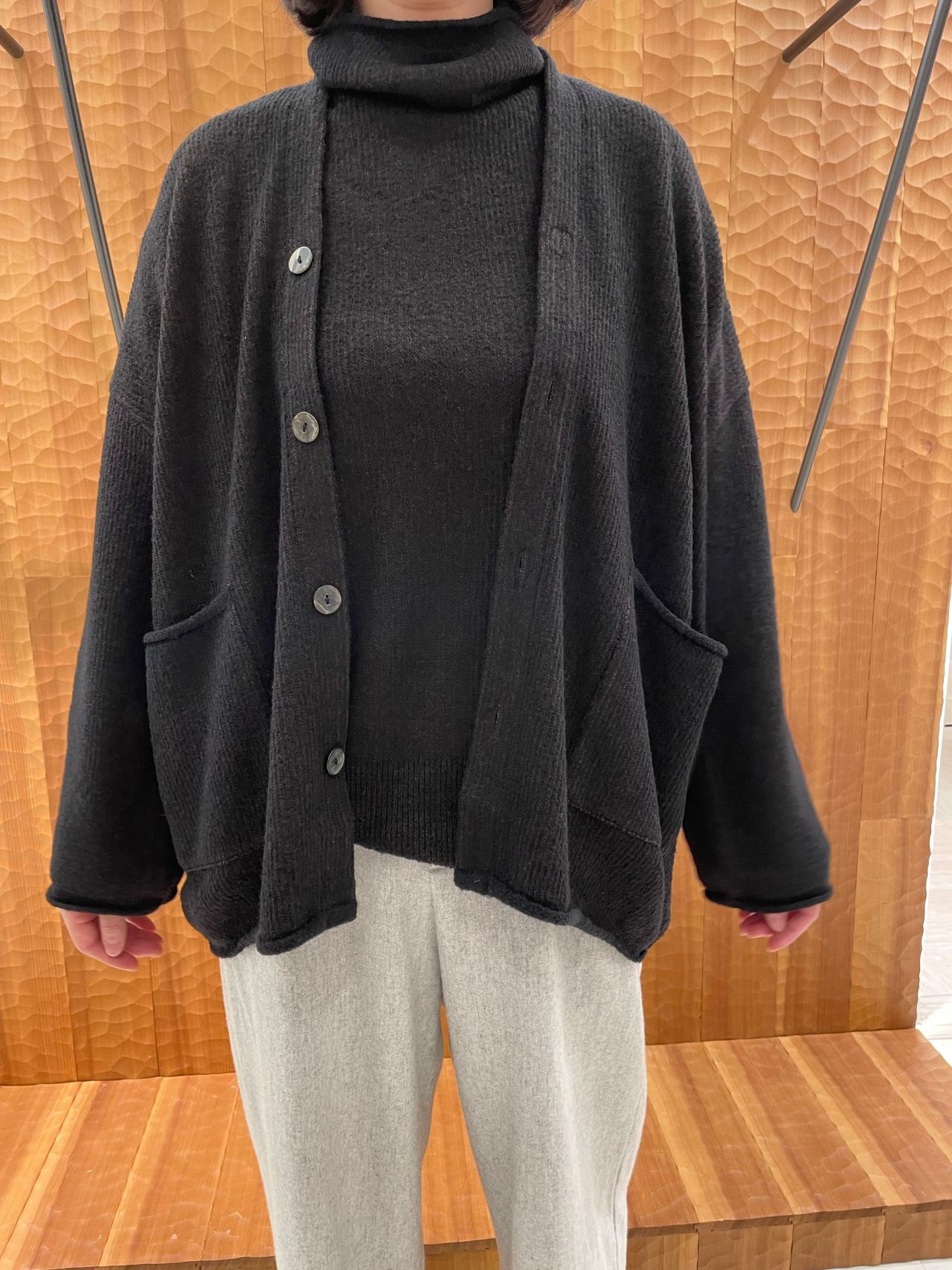 たっぷりとした横長シルエットのカーディガンを重ね着することでより暖かく着られます。