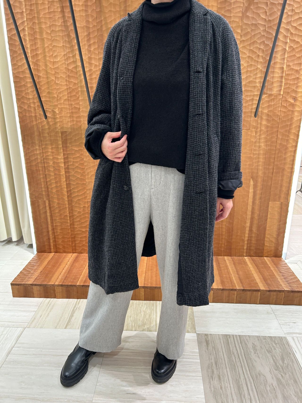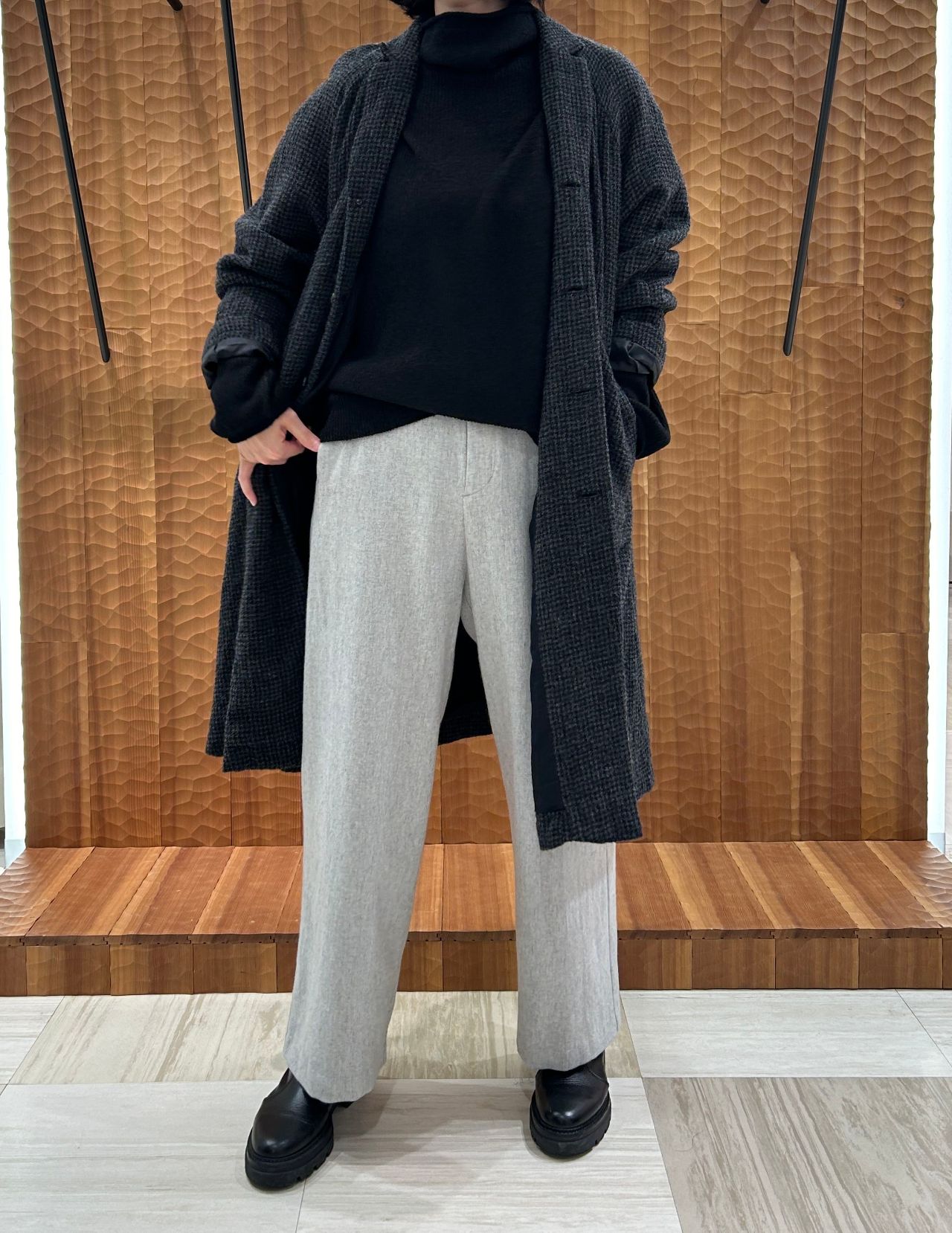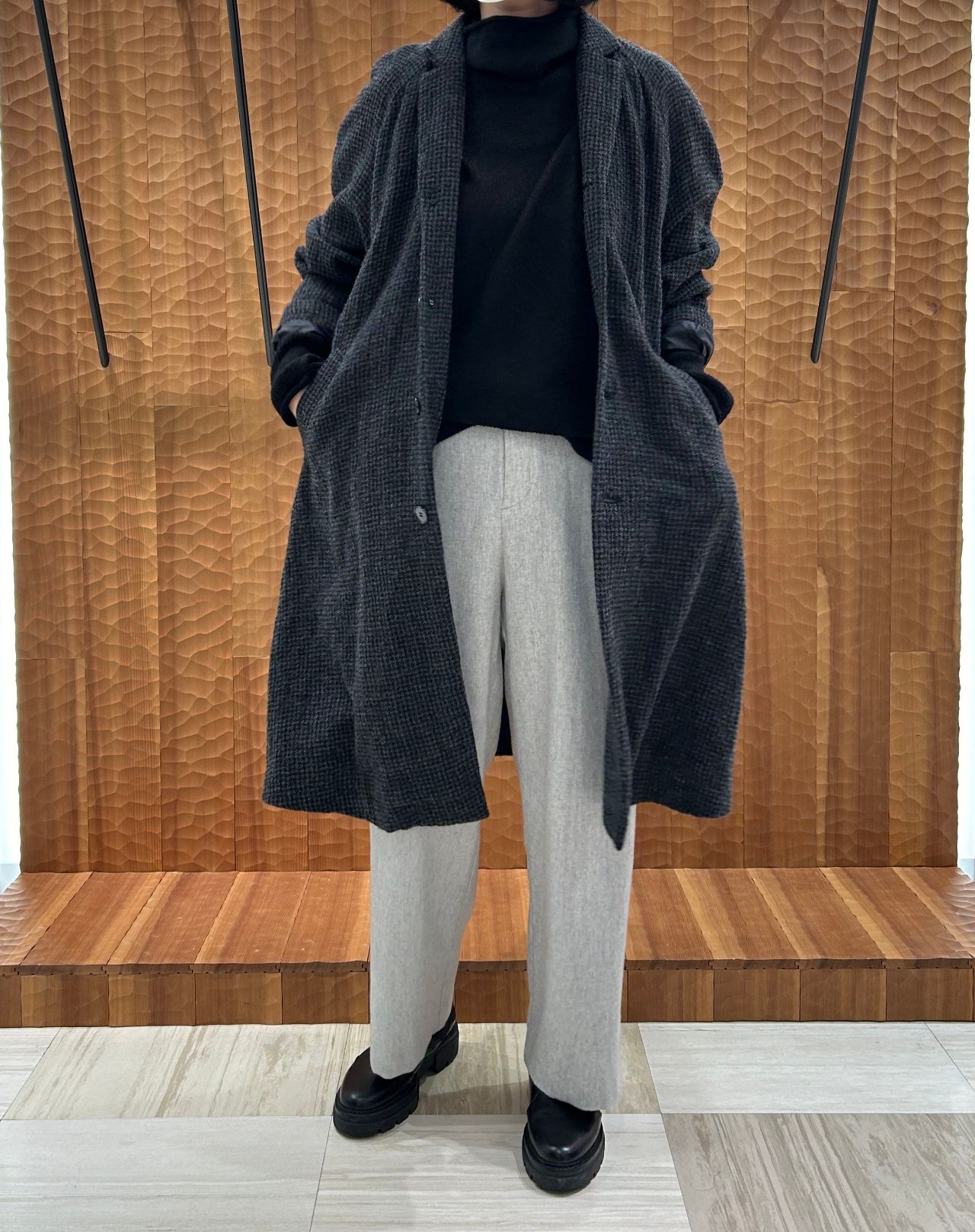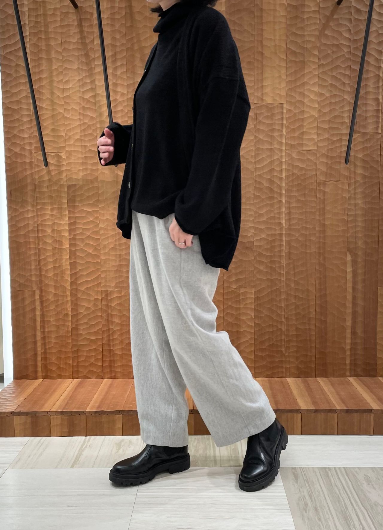 たっぷりとした横長シルエットのカーディガンを重ね着することでより暖かく着られます。