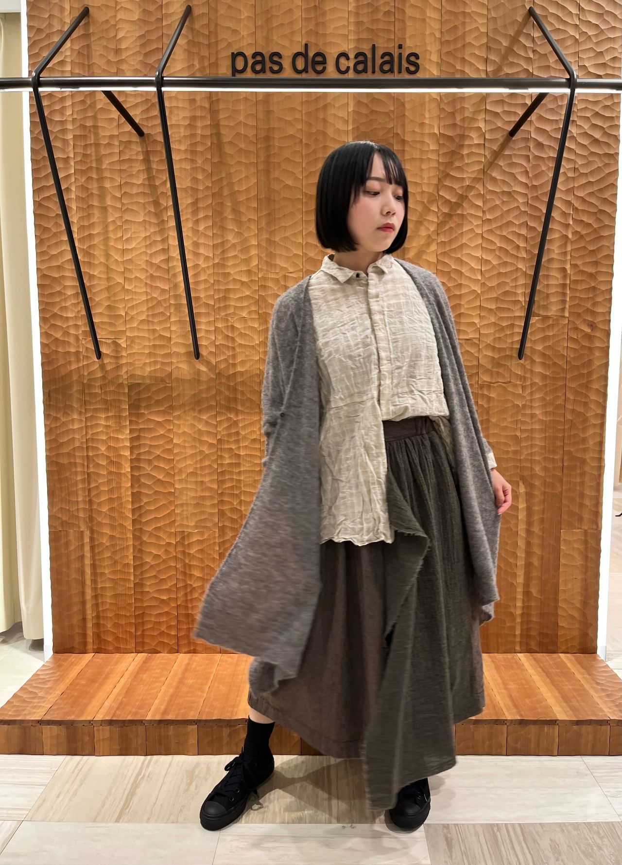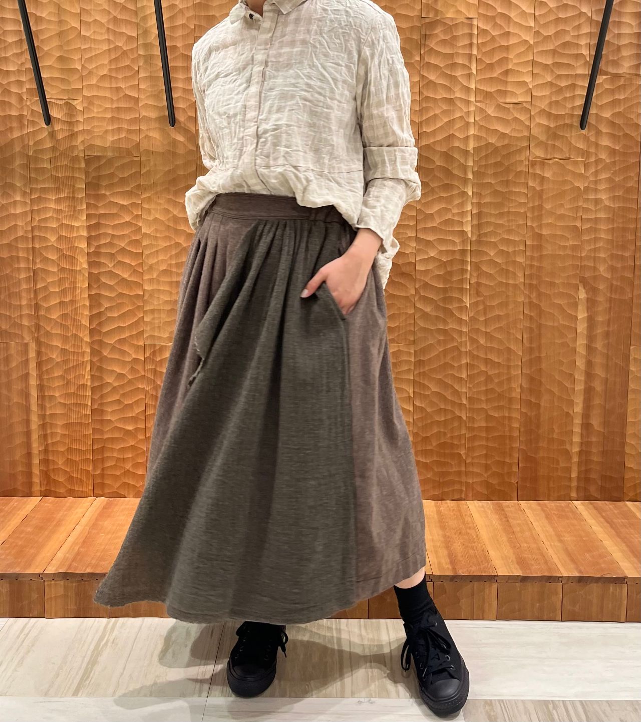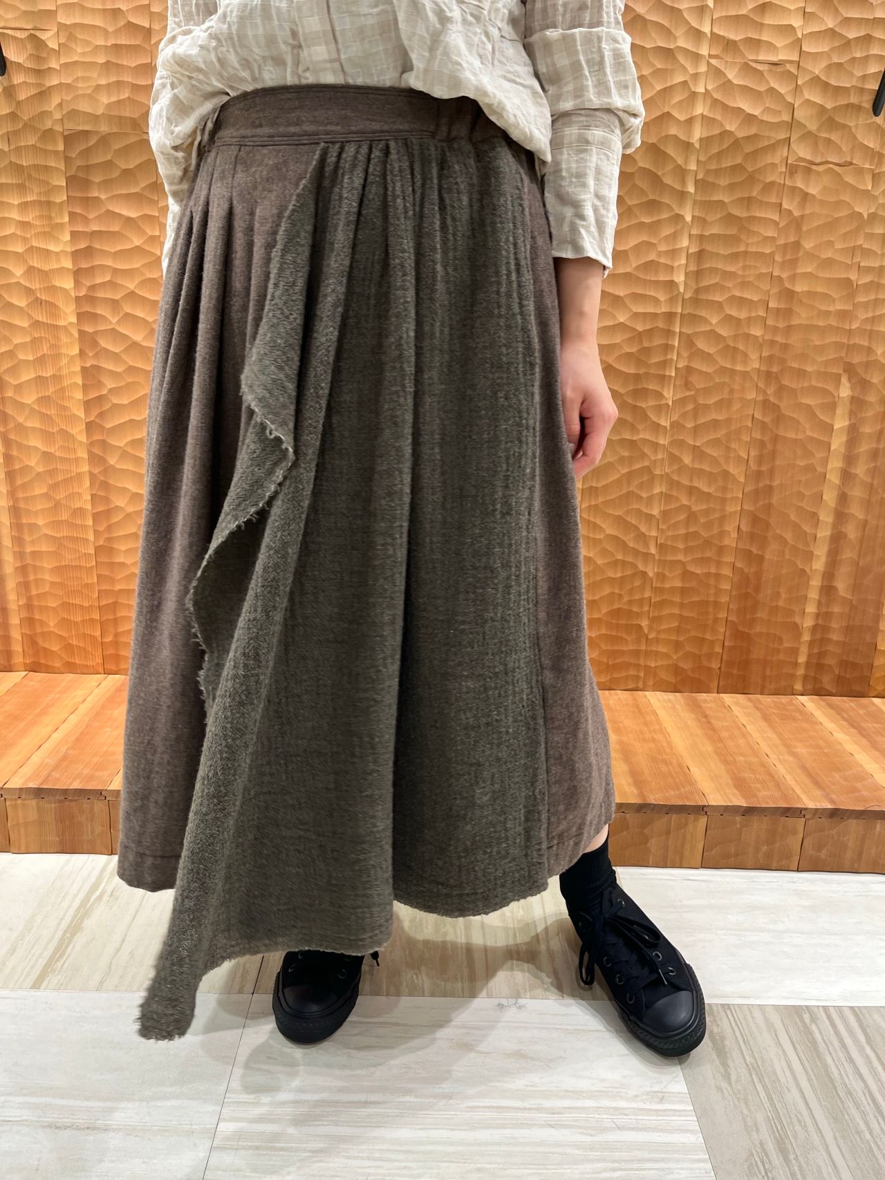 メインのECOウール生地に軽やかなウールガーゼ素材をドッキングさせたタックギャザースカート。
