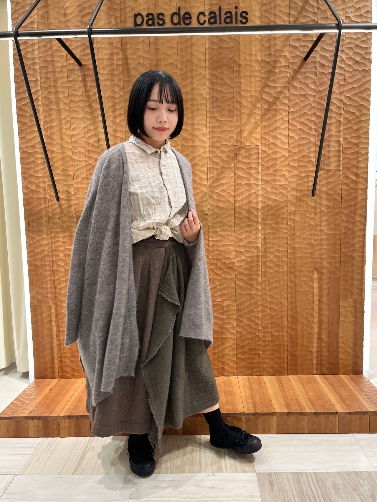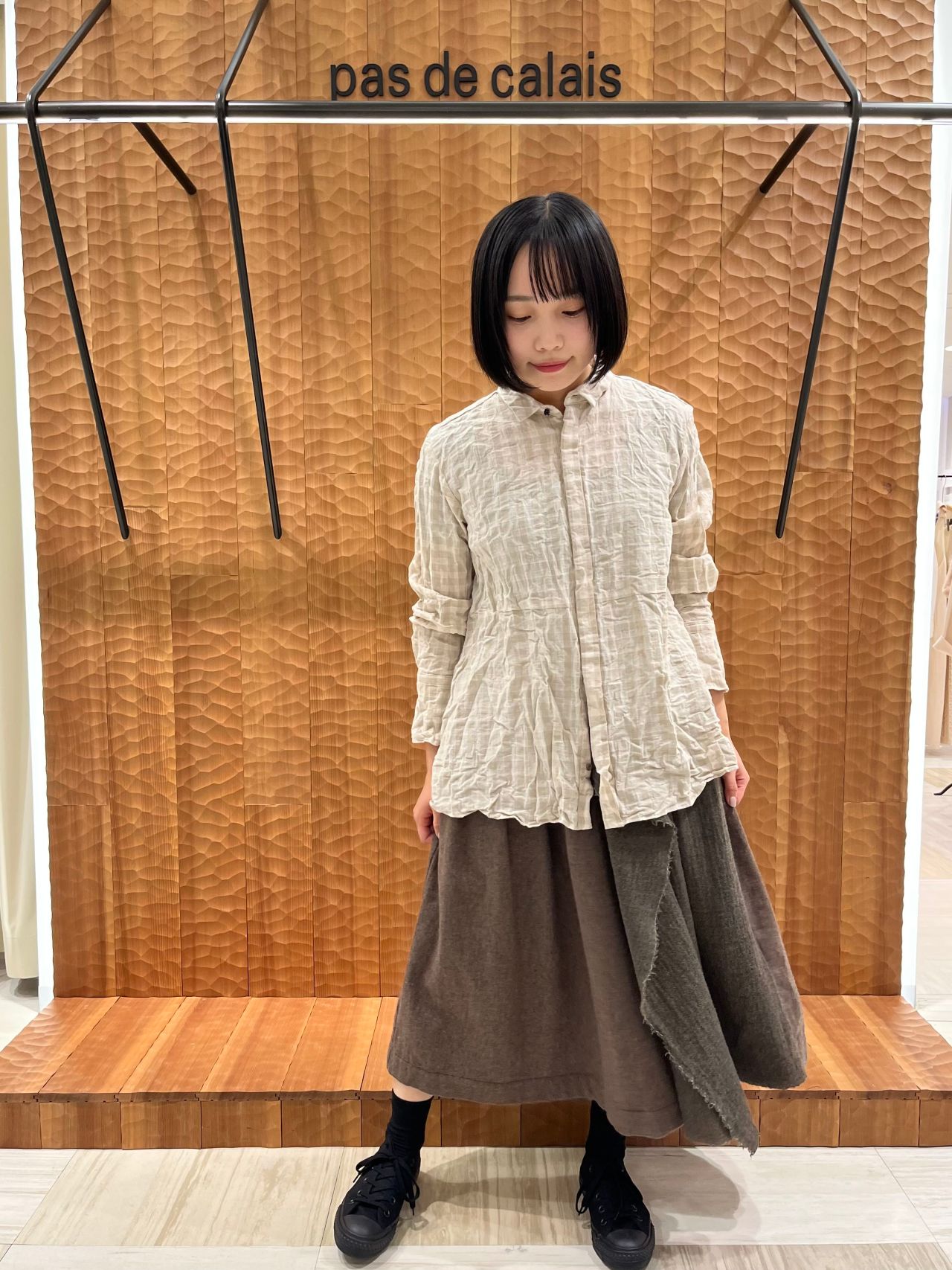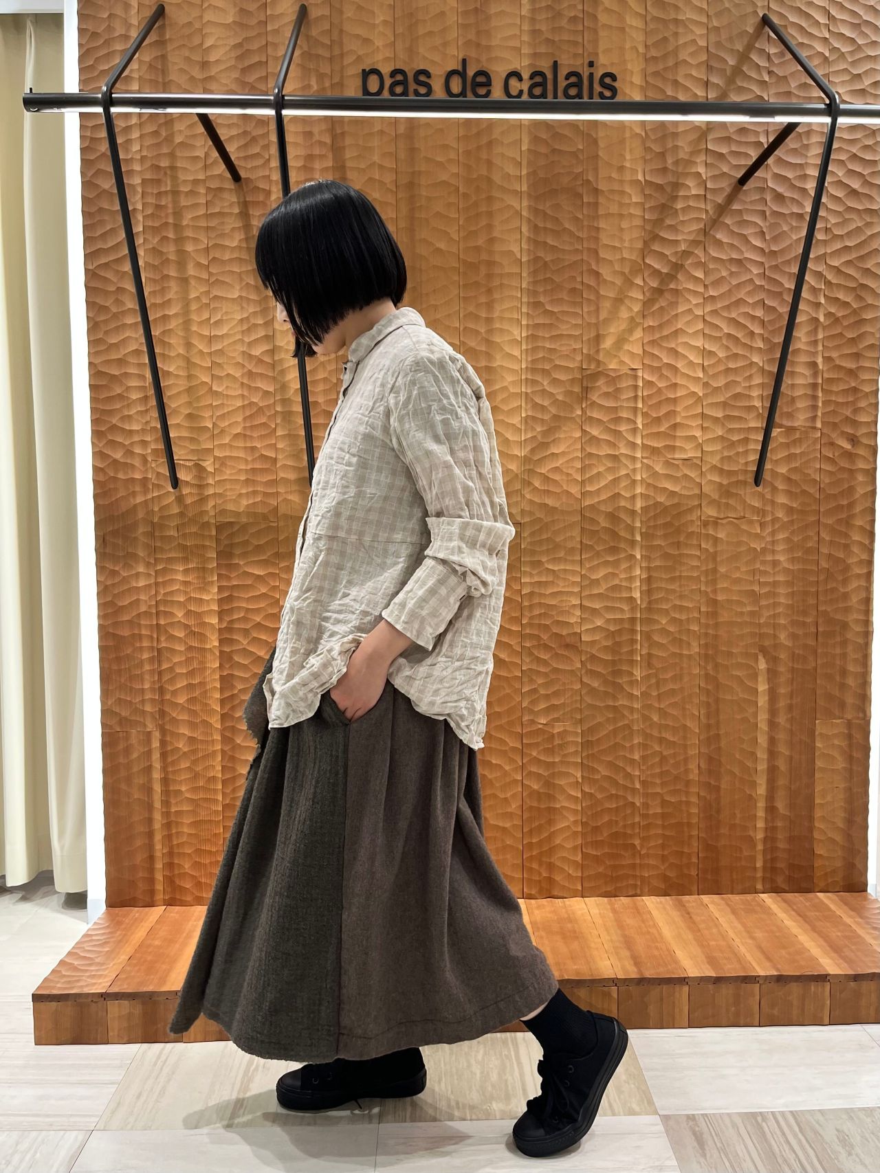 メインのECOウール生地に軽やかなウールガーゼ素材をドッキングさせたタックギャザースカート。