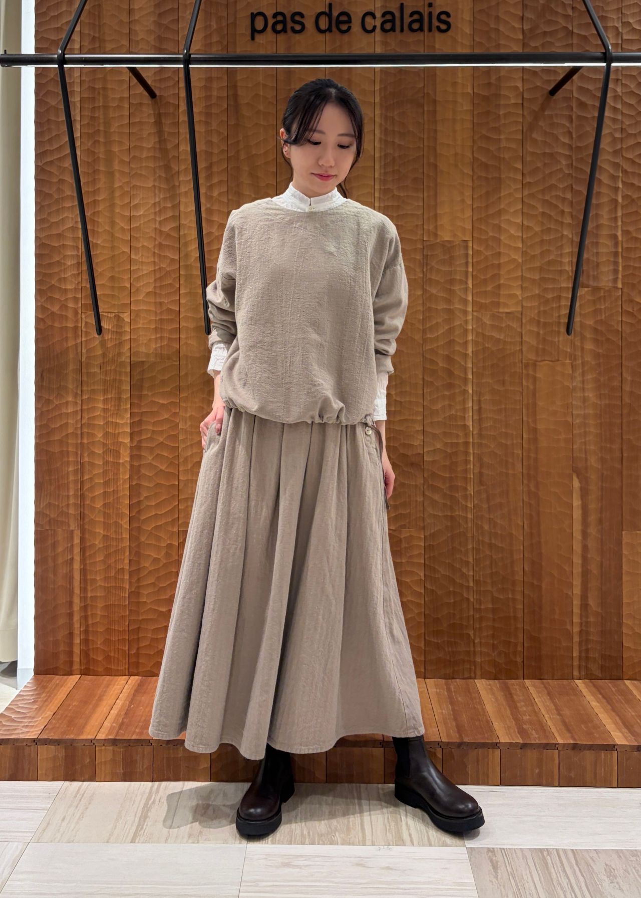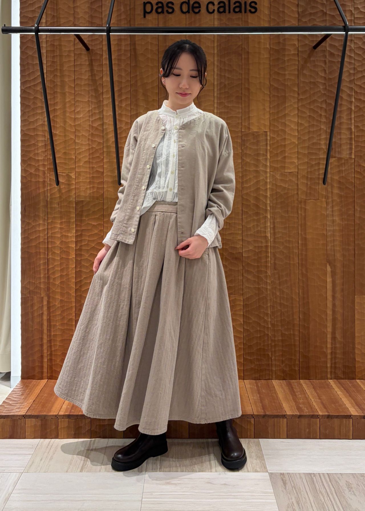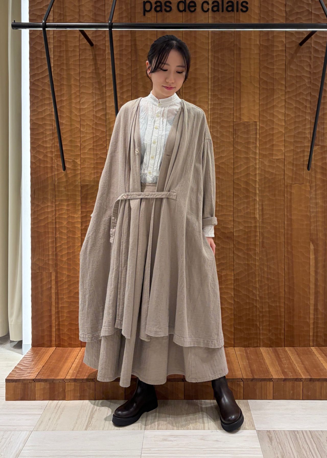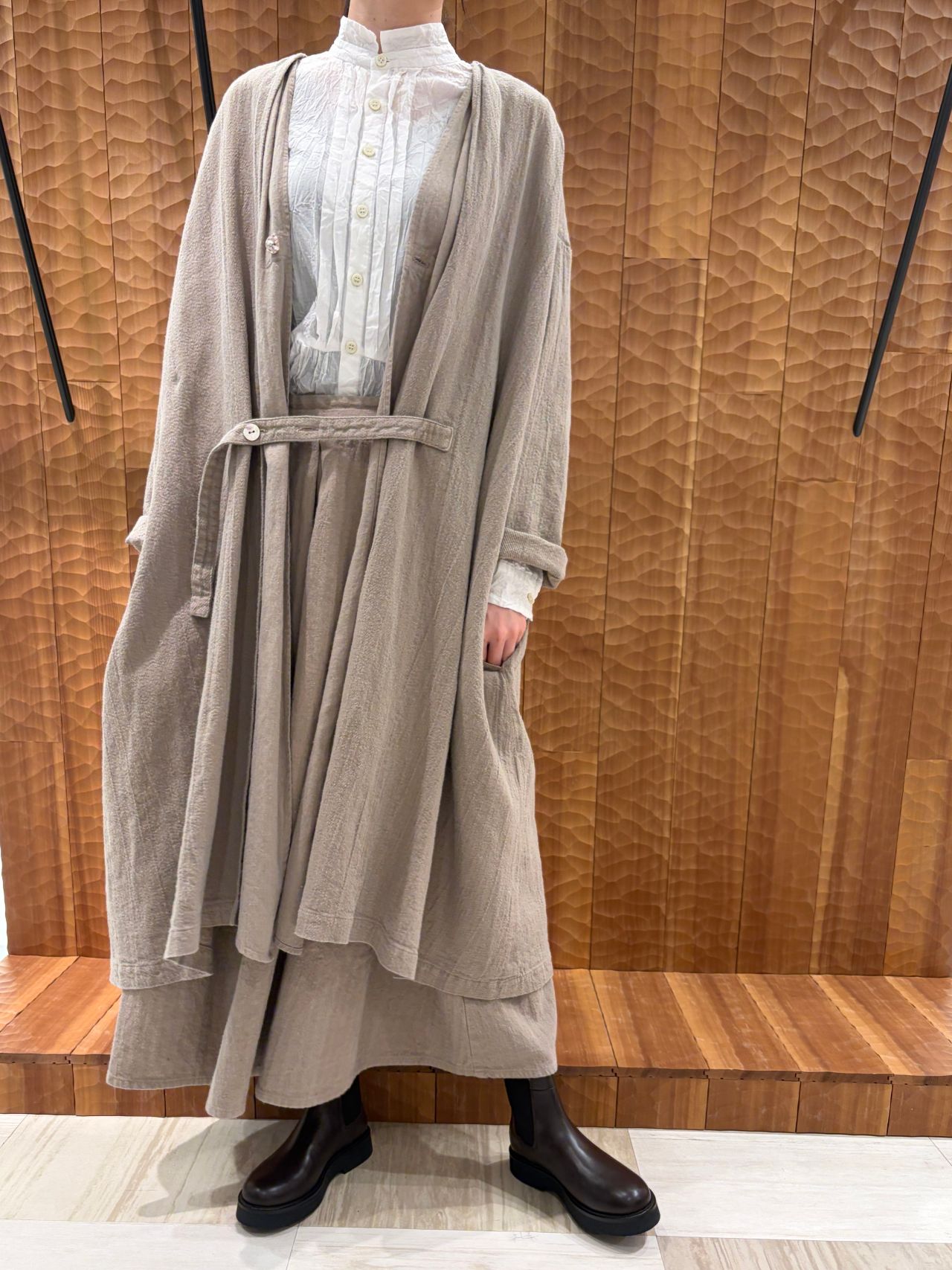 コートはVネックのAラインコートでフロント部分は2枚仕立てになっています。2wayブラウスは前後どちらでも着ていただけるので2通りの着方を楽しんでいただけます。