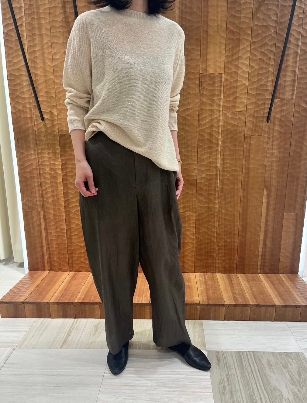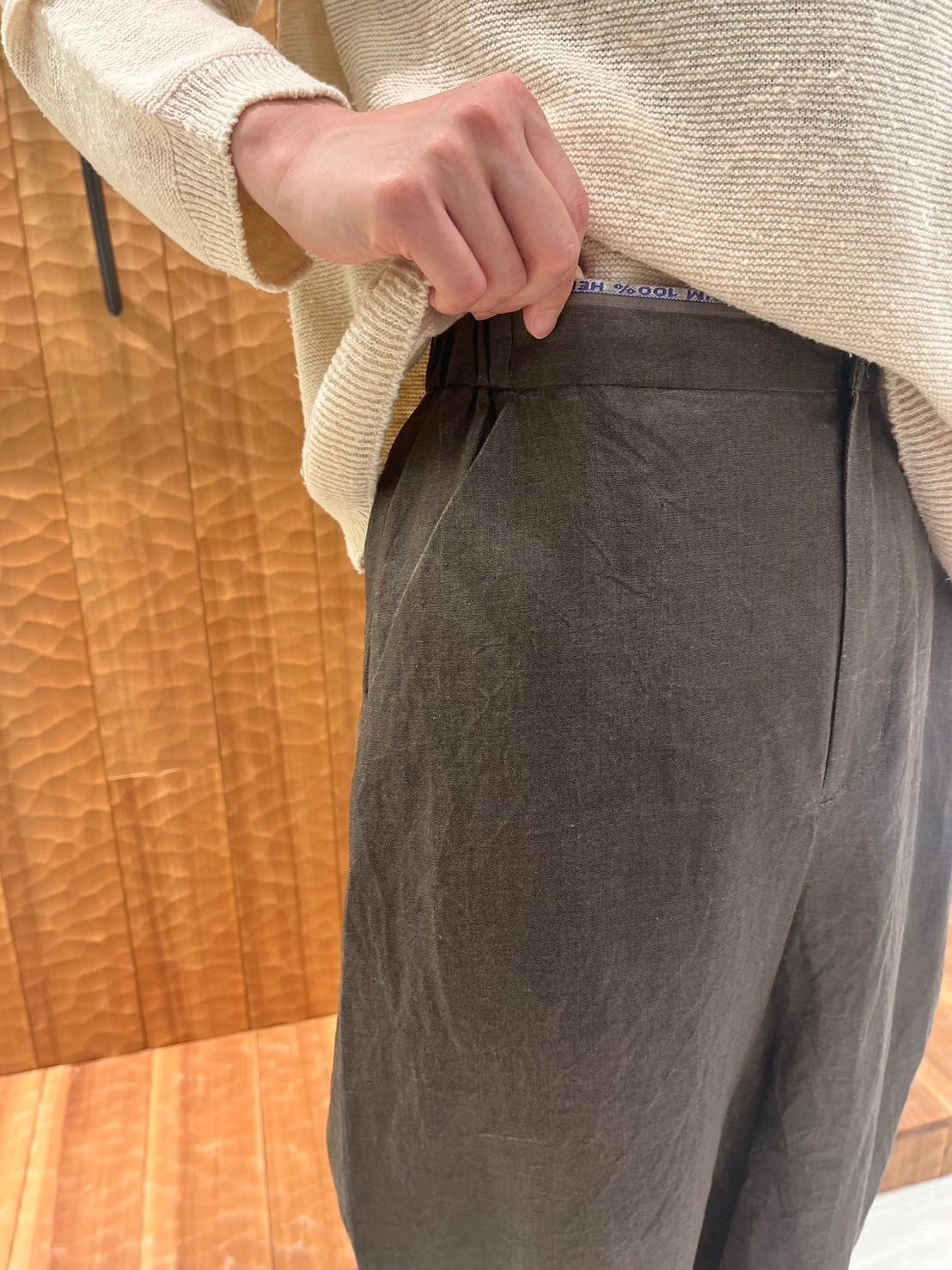 フルレングスのワイドパンツは、前ファスナーでフロントお腹周りもスッキリした印象で、ヘンプならではのシャリ感も楽しめます。内側にテープありで、サイズ調整も可能です◎