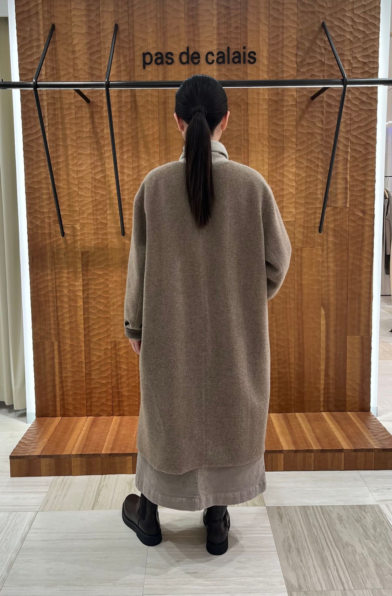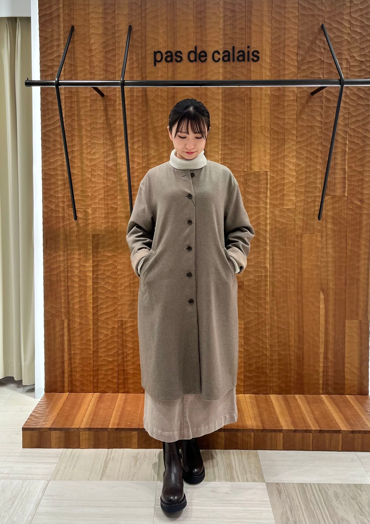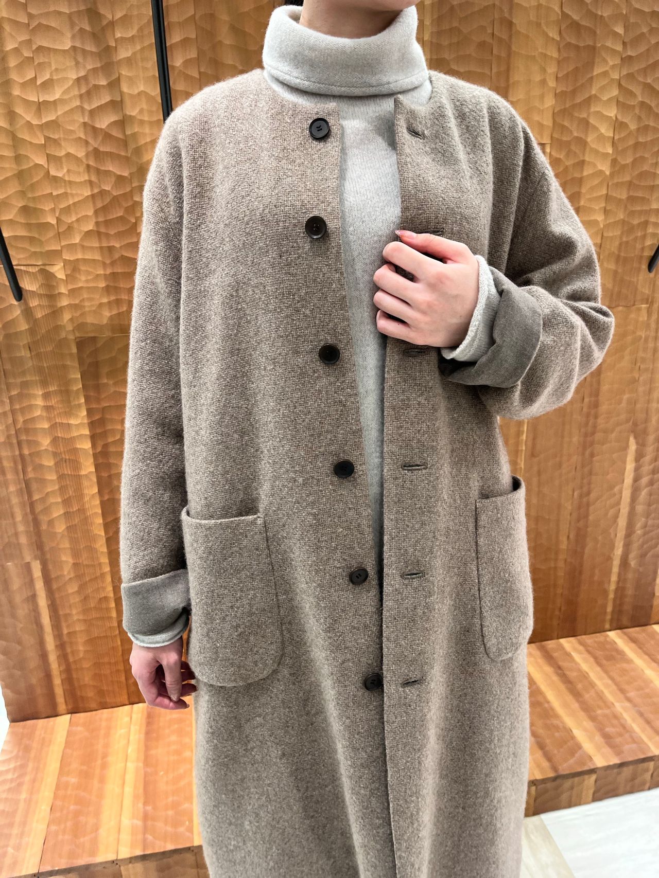 クルーネックのクラシックコートでスッキリとしたシルエットです。