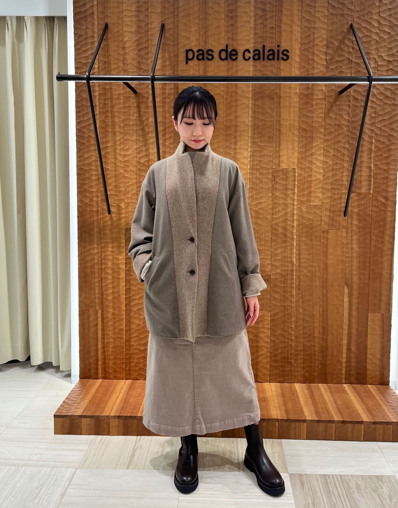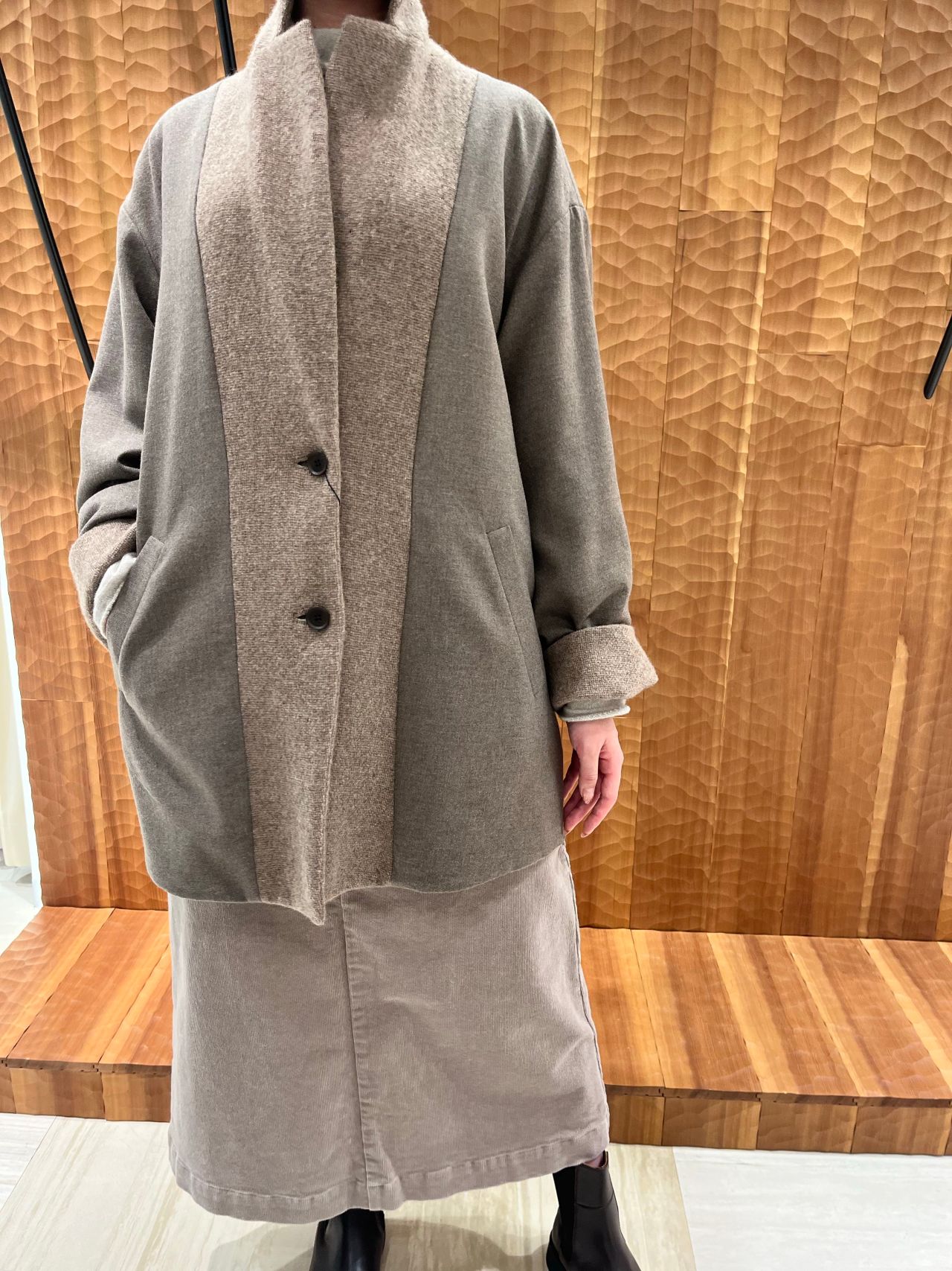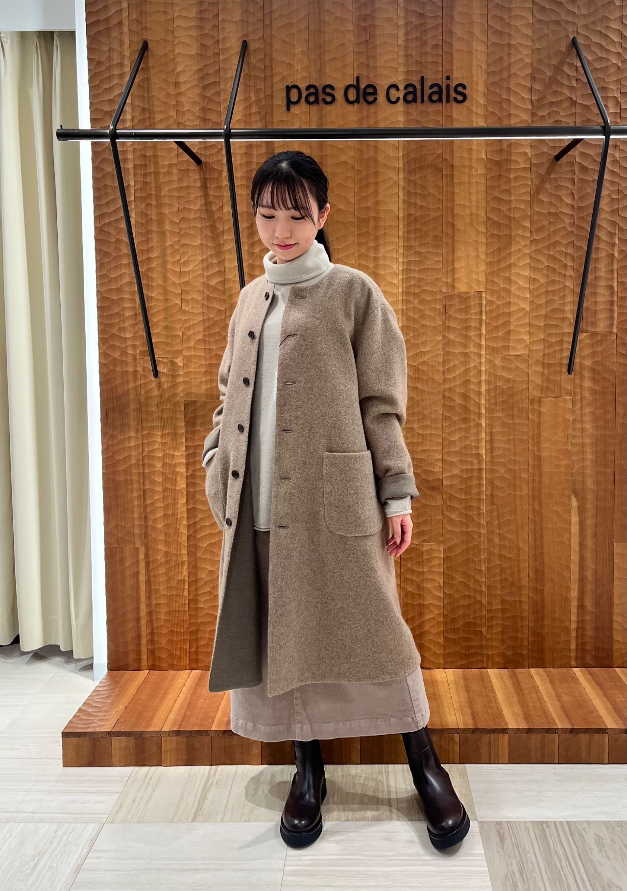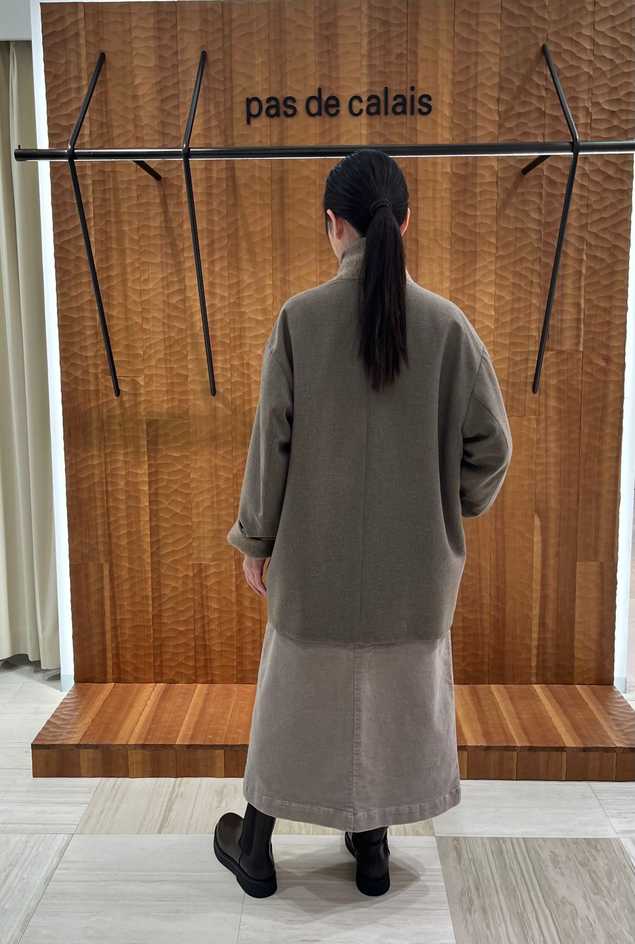 クルーネックのクラシックコートでスッキリとしたシルエットです。