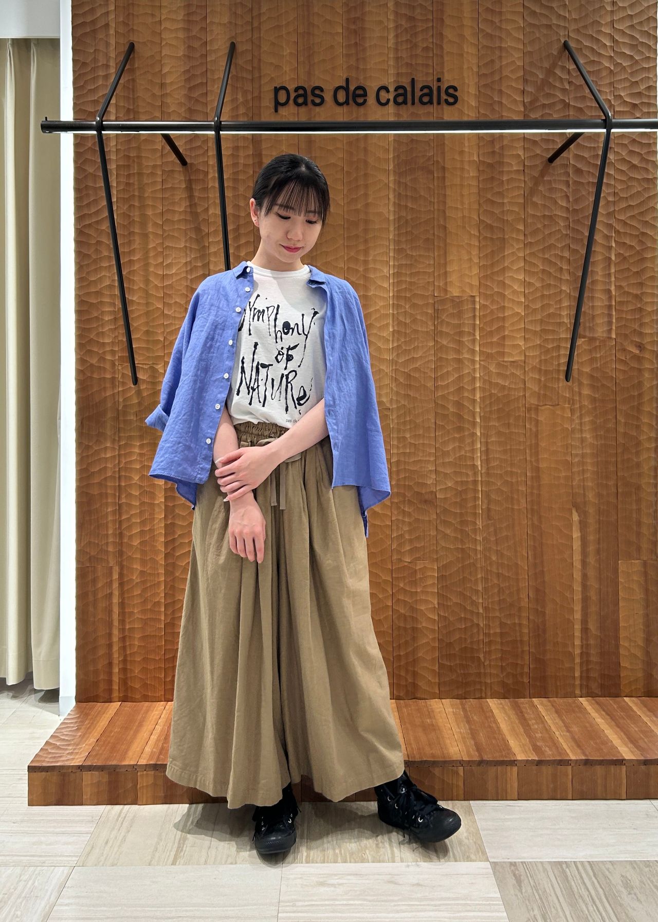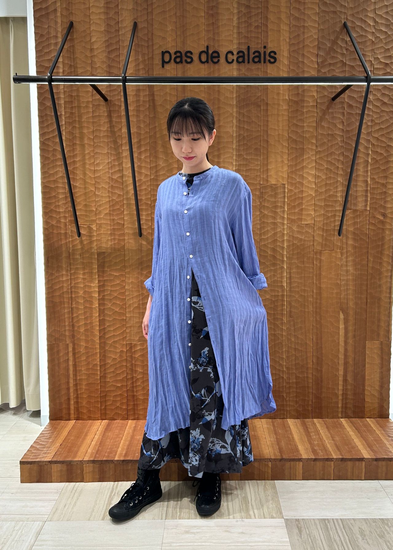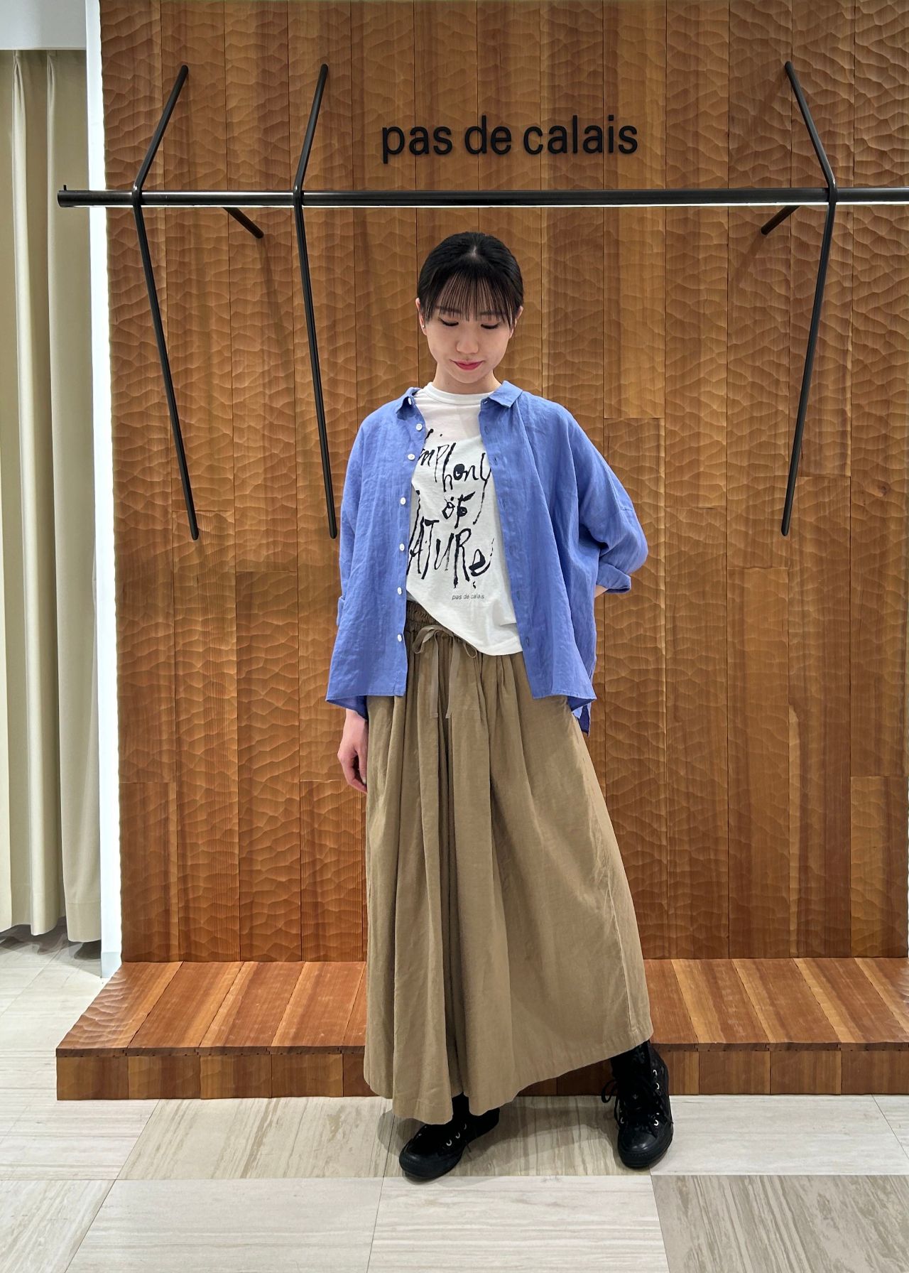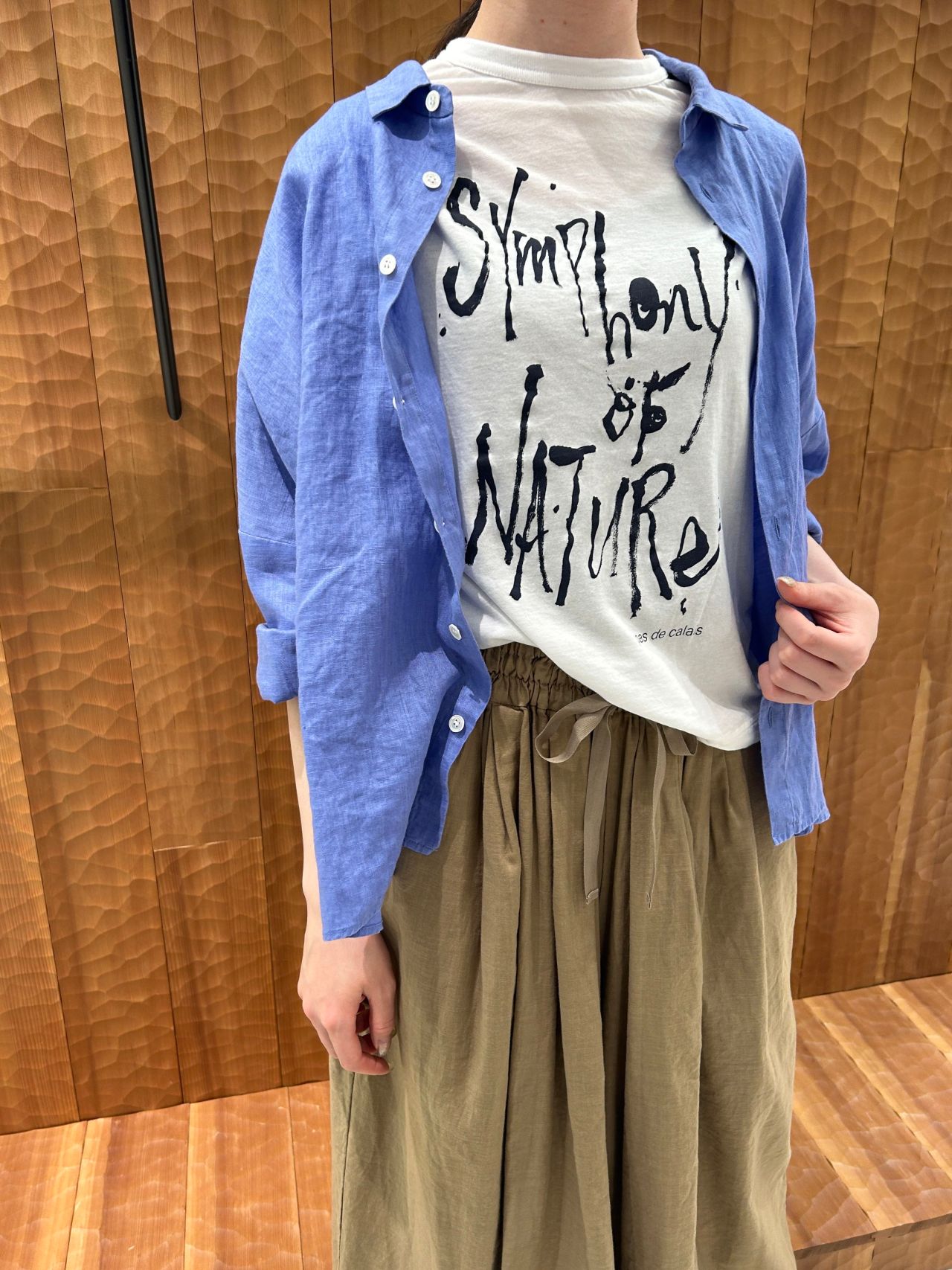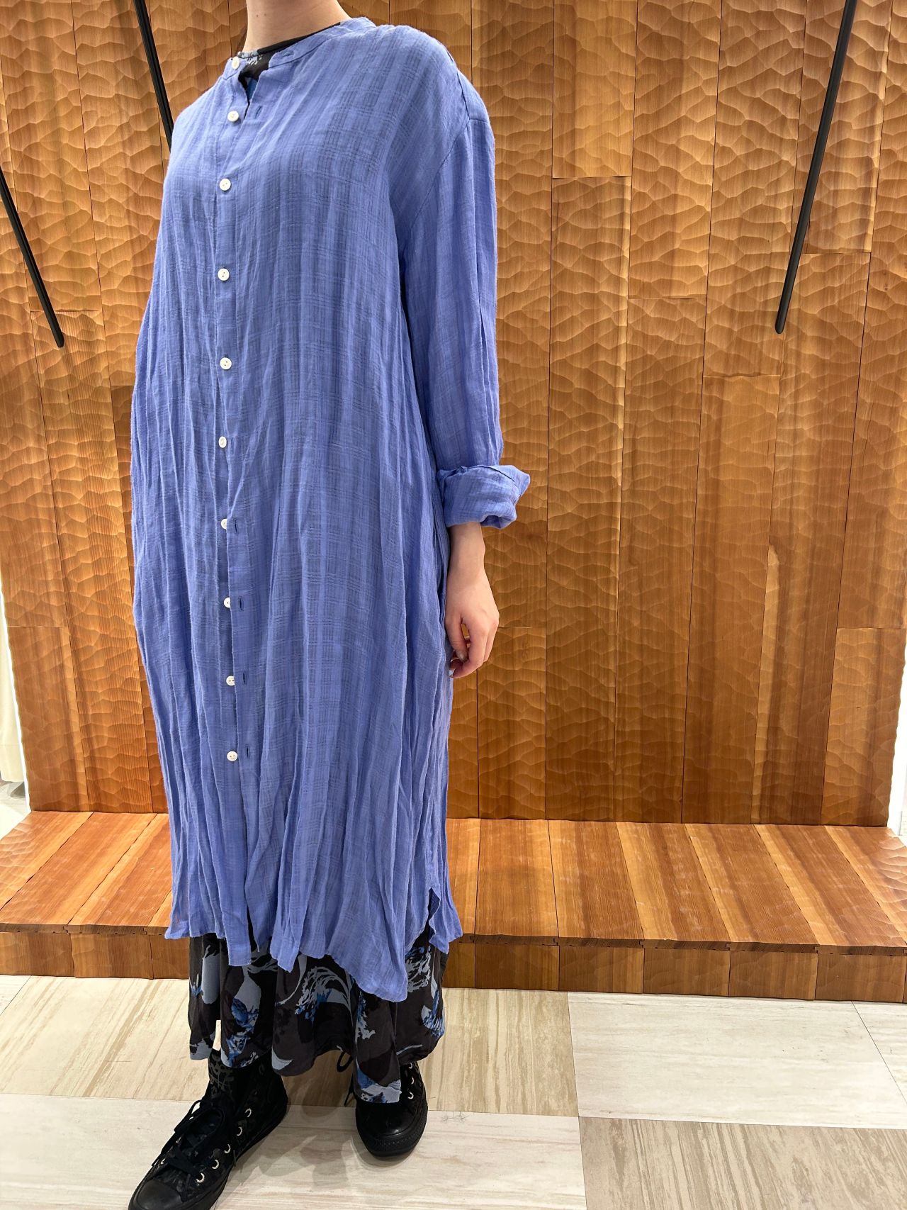 ラミーの光沢感が綺麗なチェック素材のワンピースと清涼感のあるフレンチリネン素材のブラウスは、どちらも自然のシンフォニーのテーマから身近にある植物である露草をイメージした綺麗なブルーで製品染めを施しています。