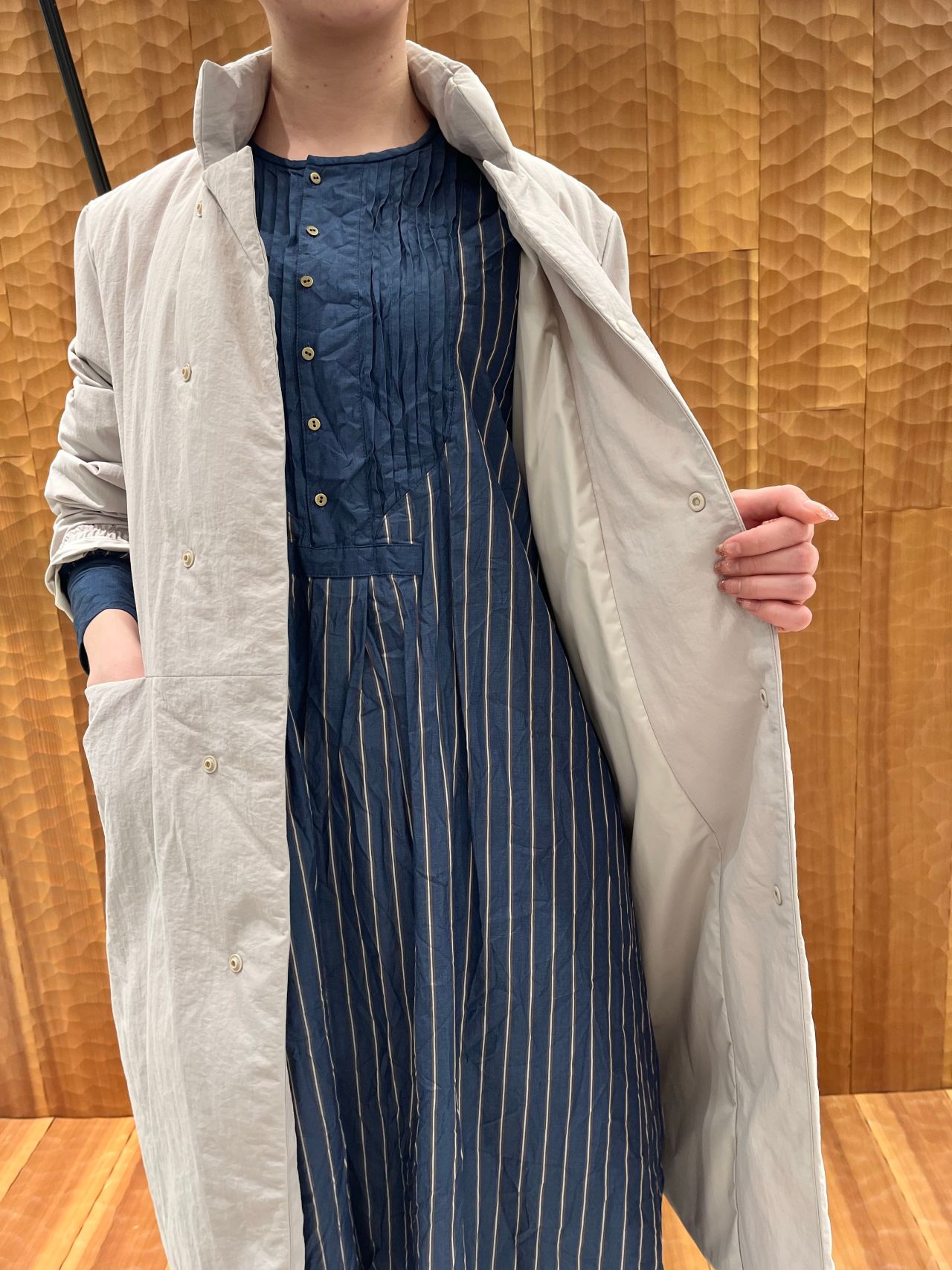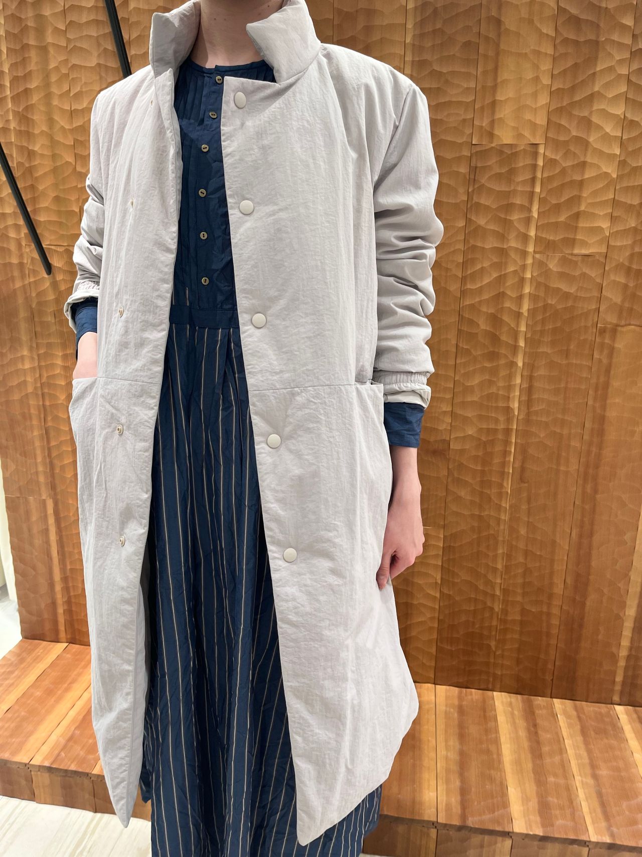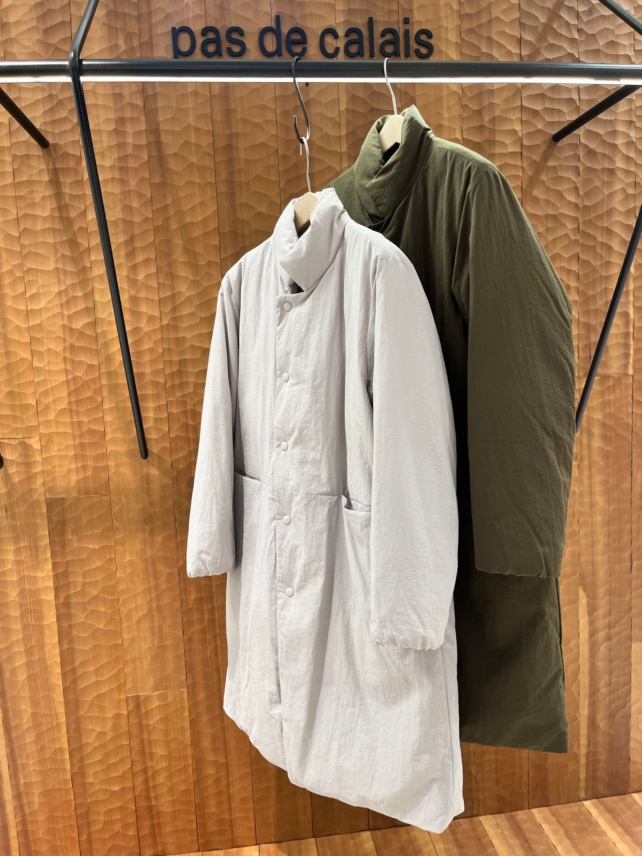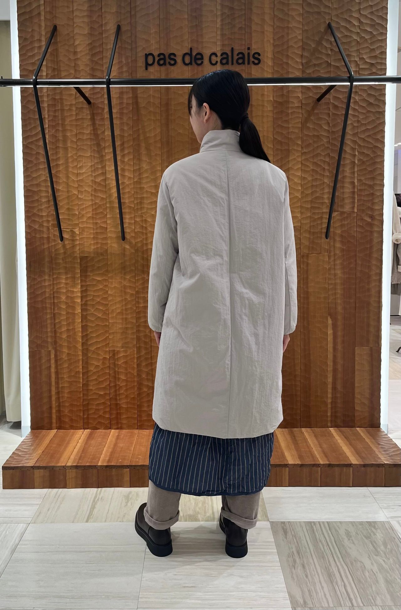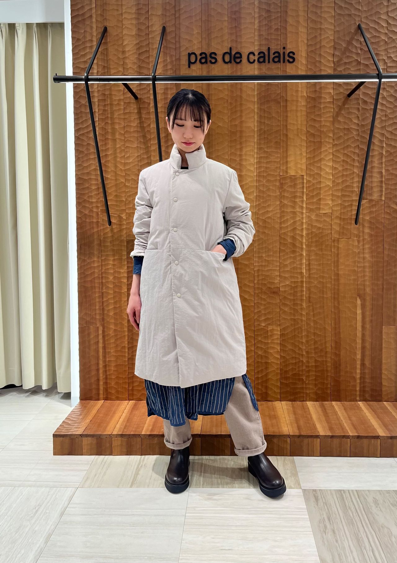 今期の新作ダウン、ロングタイプはスタンドの襟がマニッシュな印象。