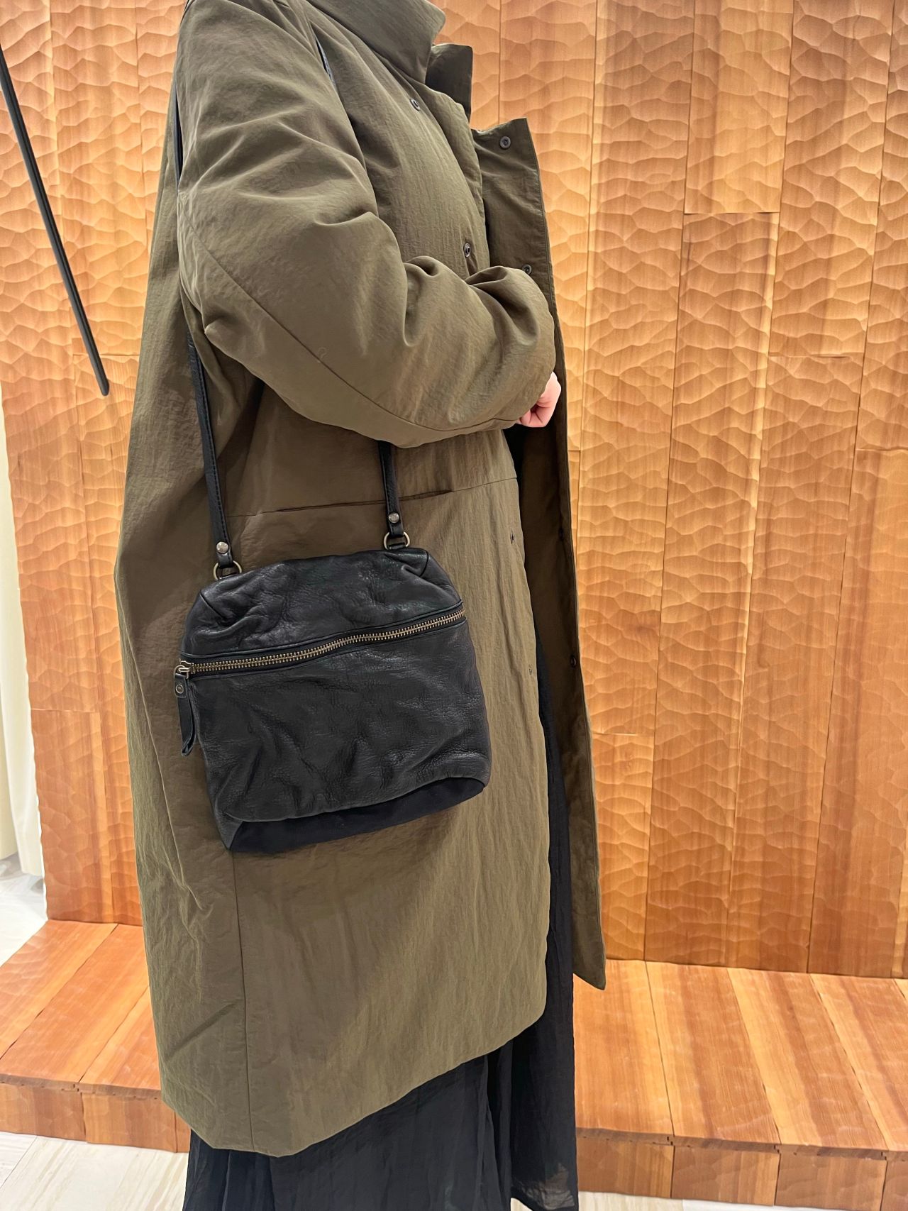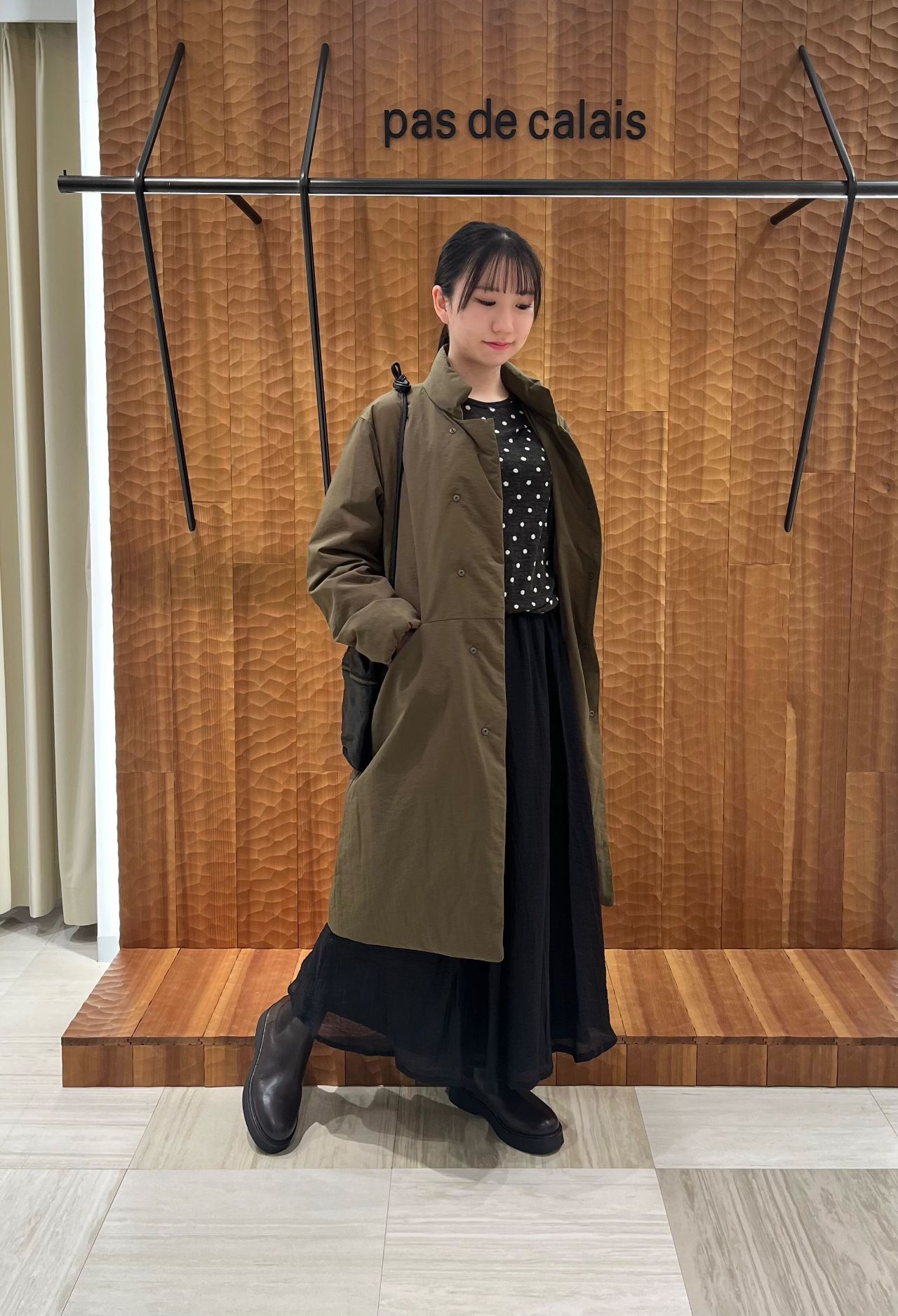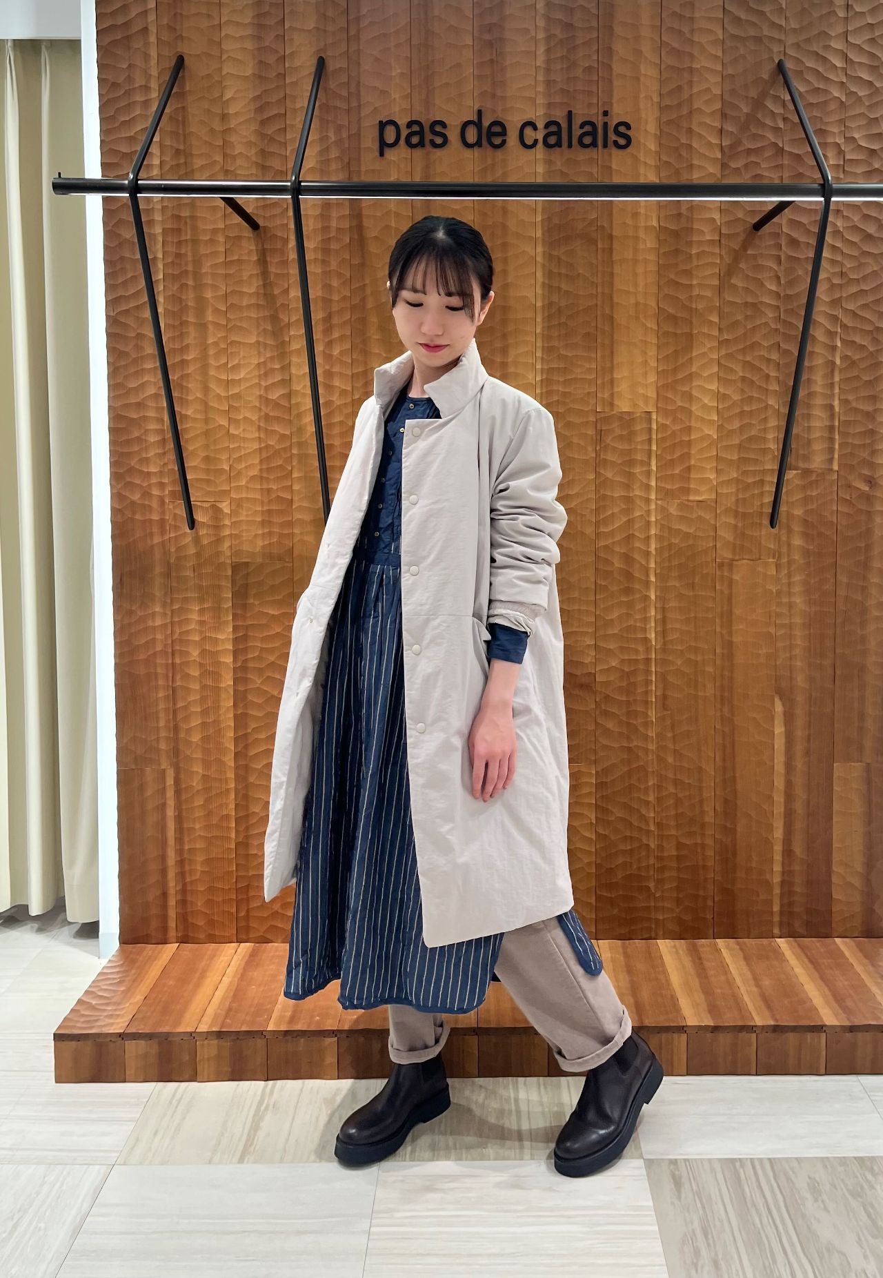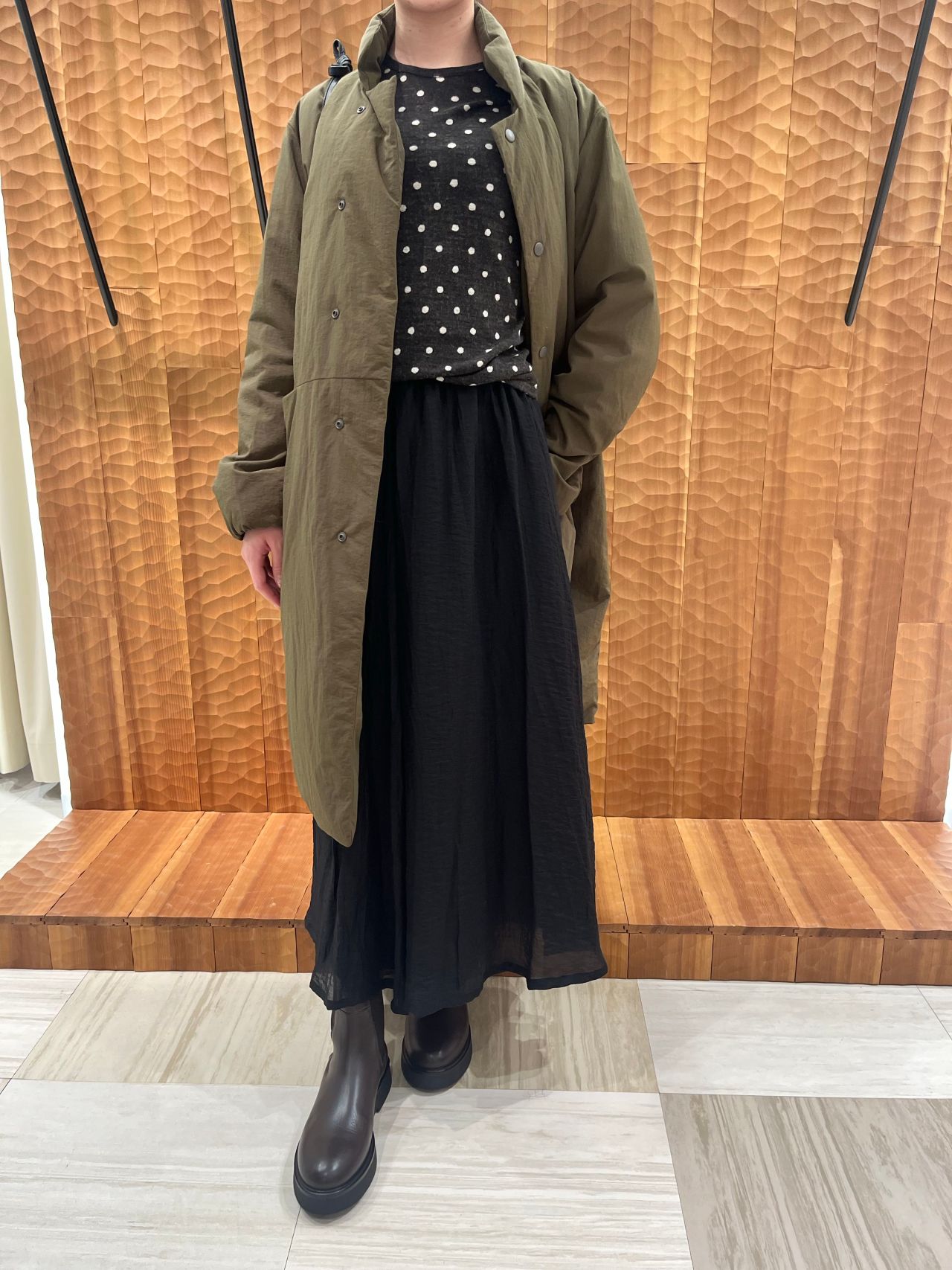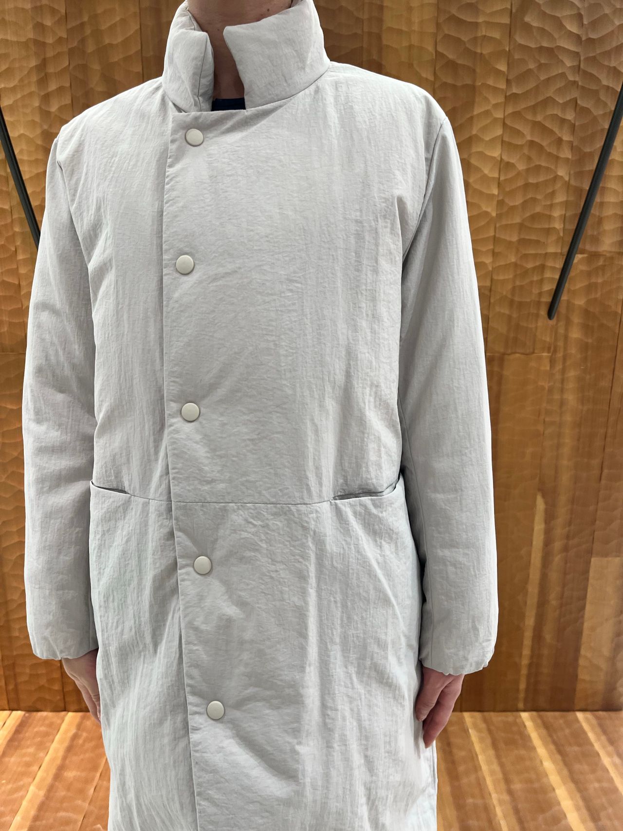 今期の新作ダウン、ロングタイプはスタンドの襟がマニッシュな印象。