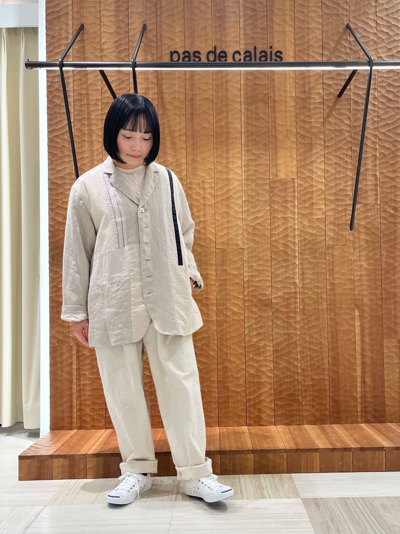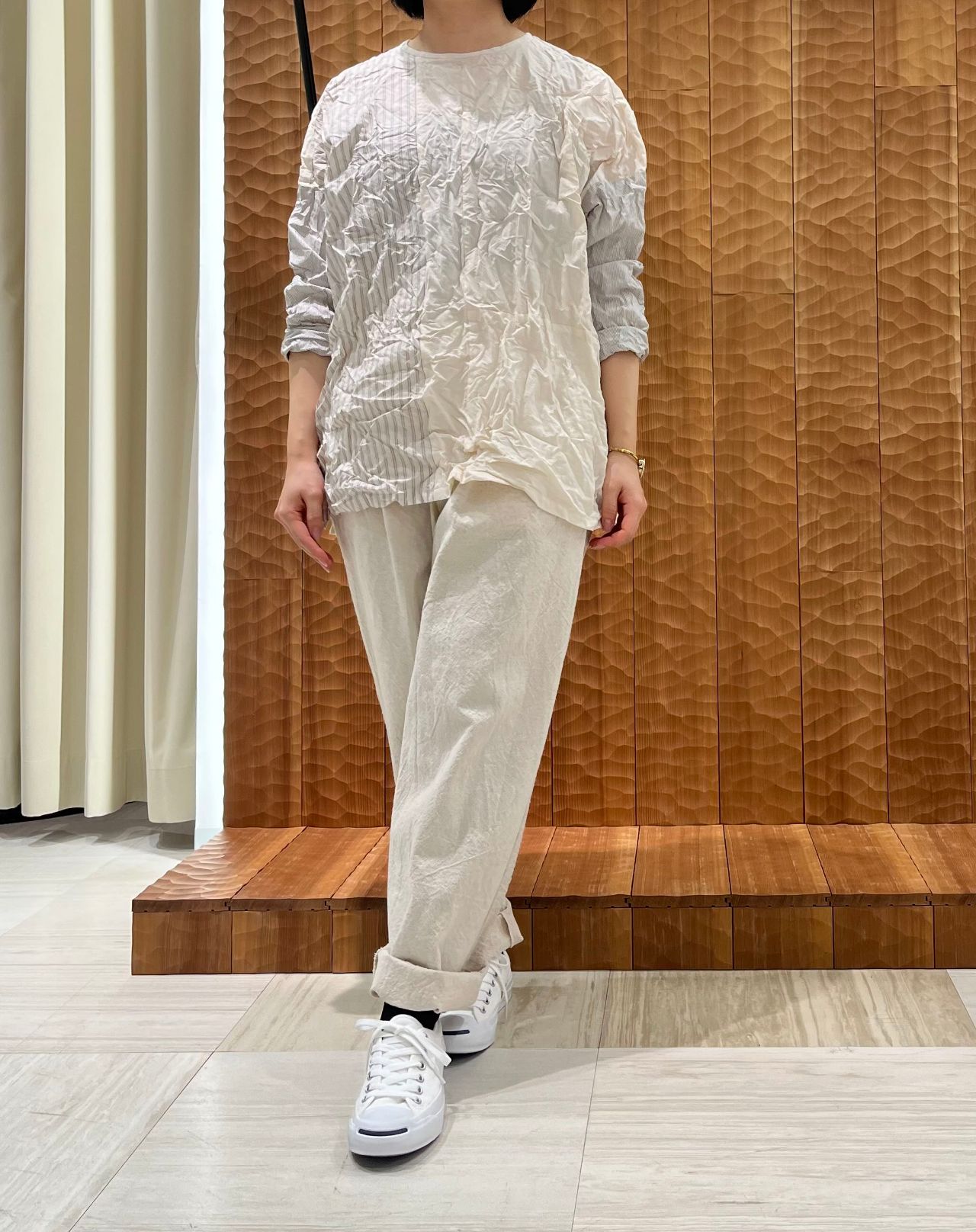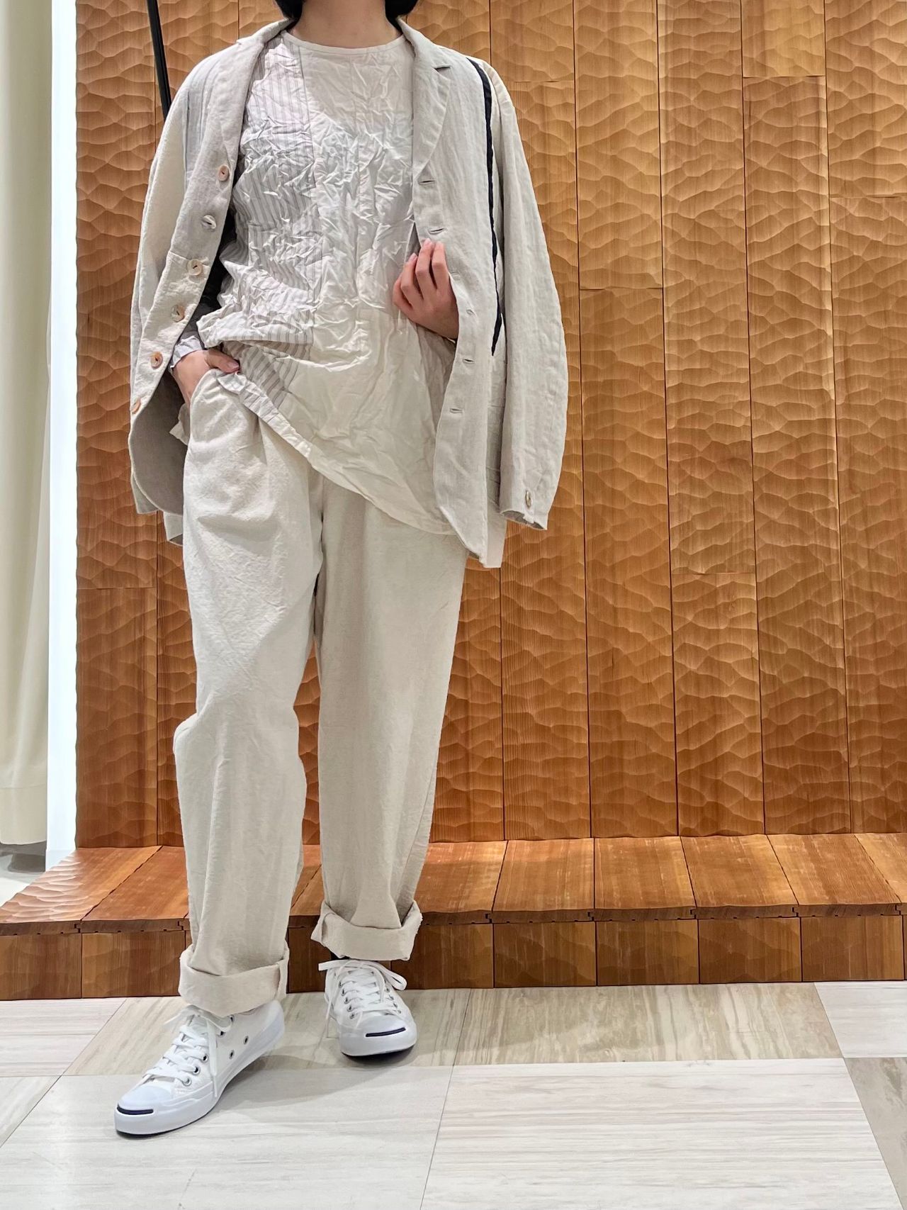 綿密に織られた素材なので春先にさらっと着られるアイテムです。