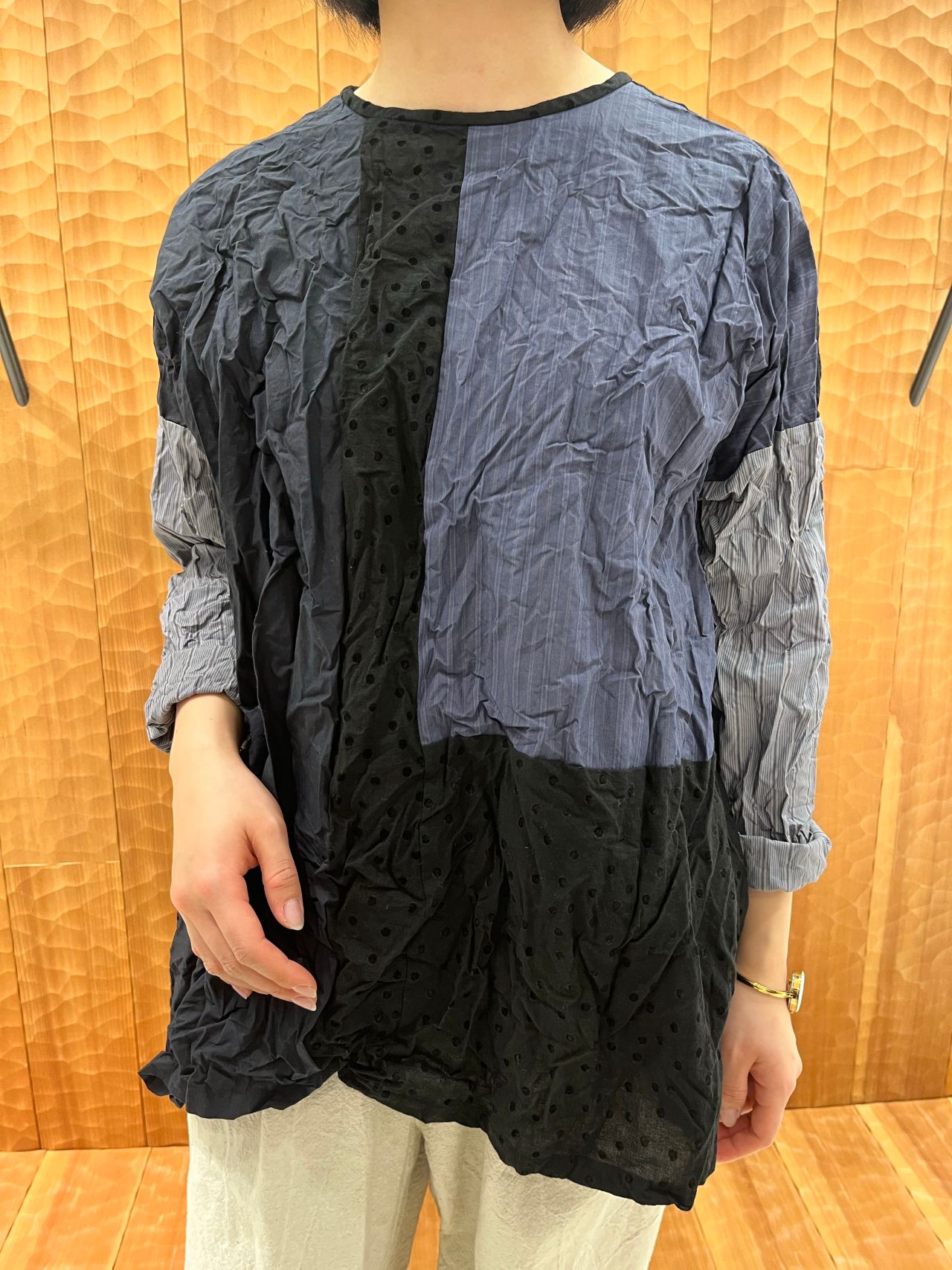 3パターンのストライプ生地とドットの生地をパッチワークでデザインしたオリジナリティ溢れる一枚。