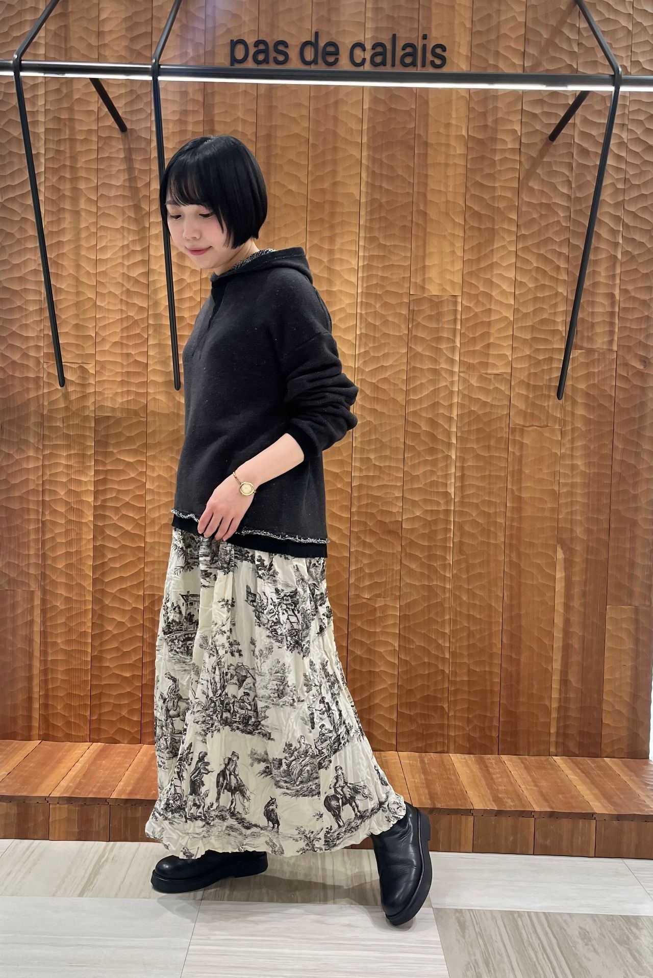 今回は新作のトワルドジュイプリントスカートと合わせてカジュアルスタイリングで。
