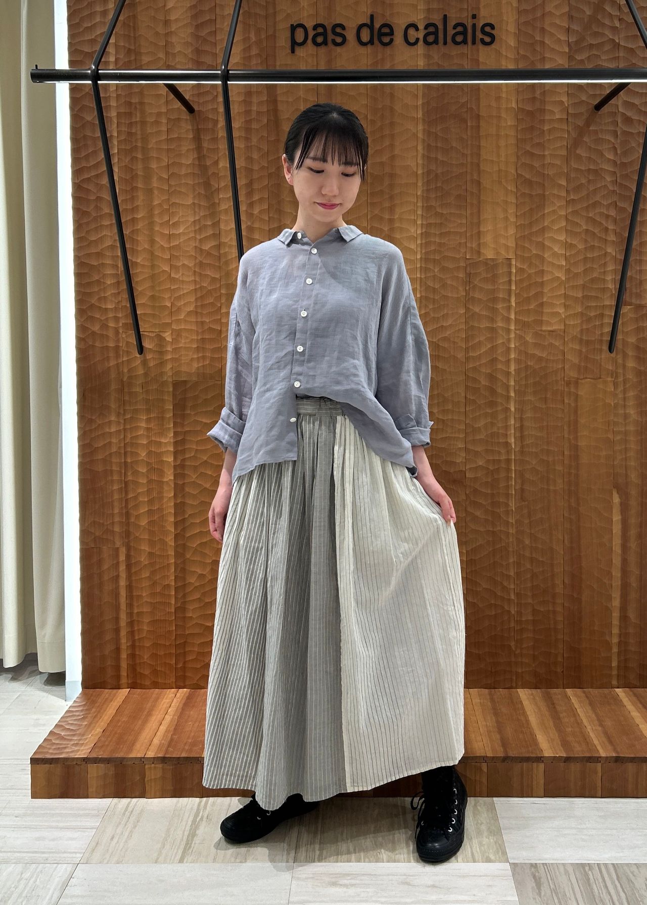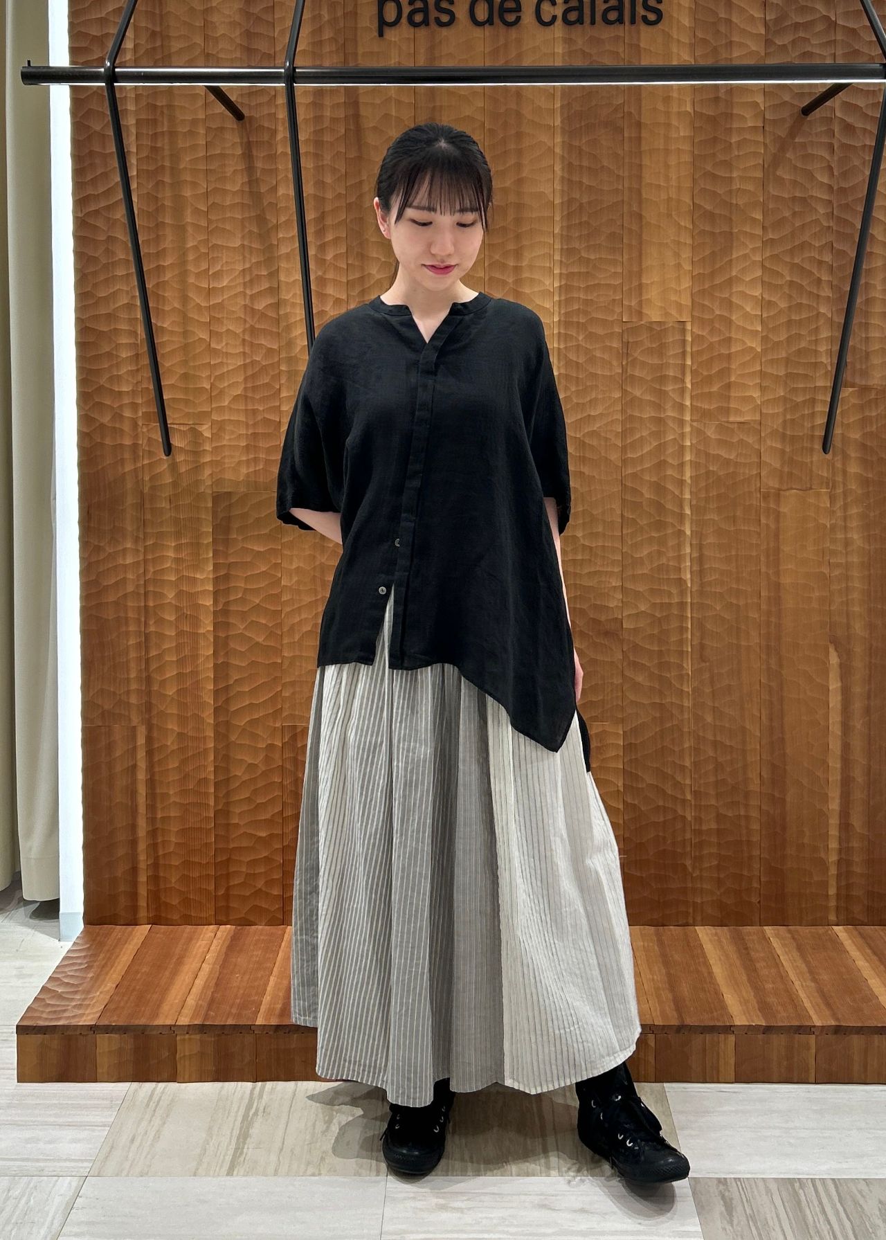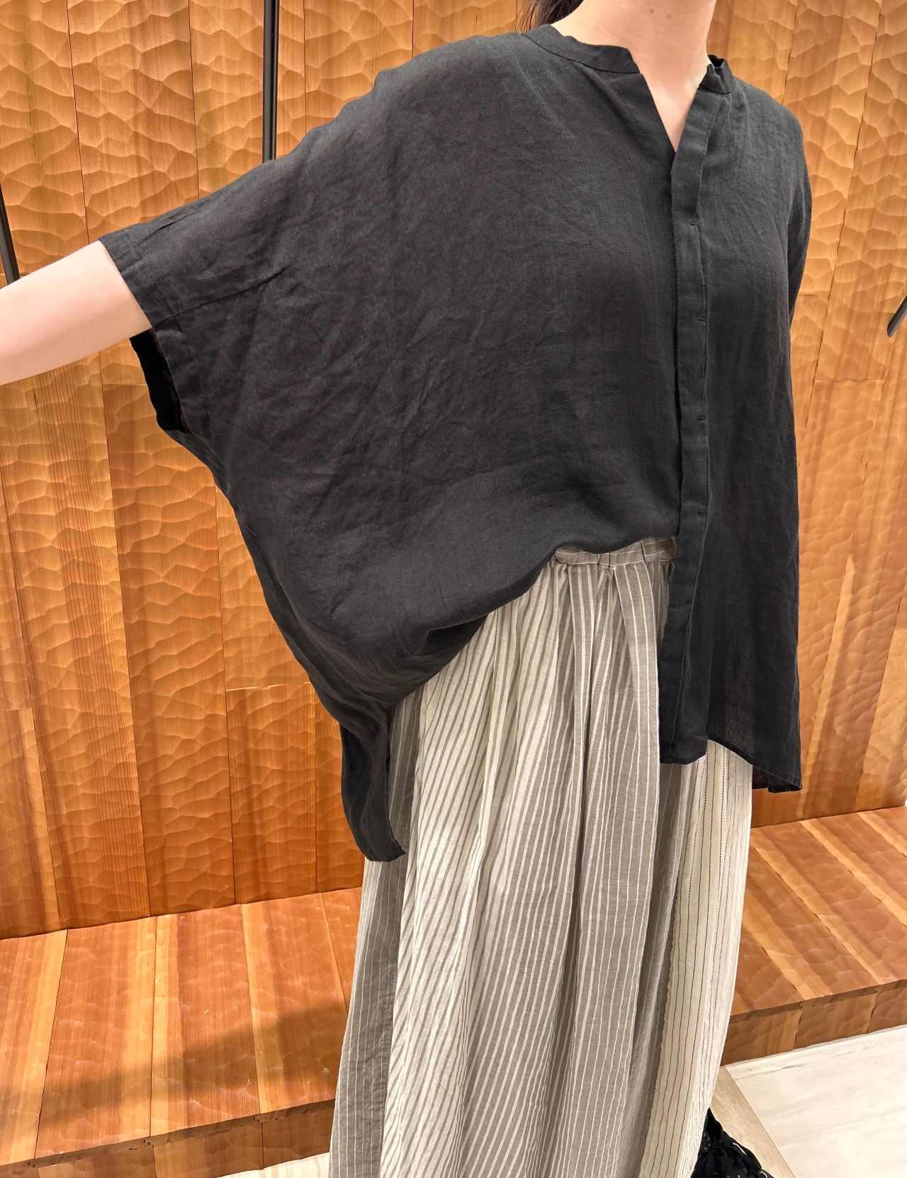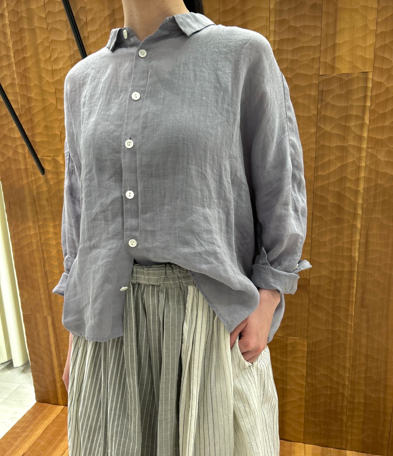 ラミーの光沢感と適度な透け感が綺麗なブラウスは、ゆったりとしたあまめの織りで柔らかな風合いです。