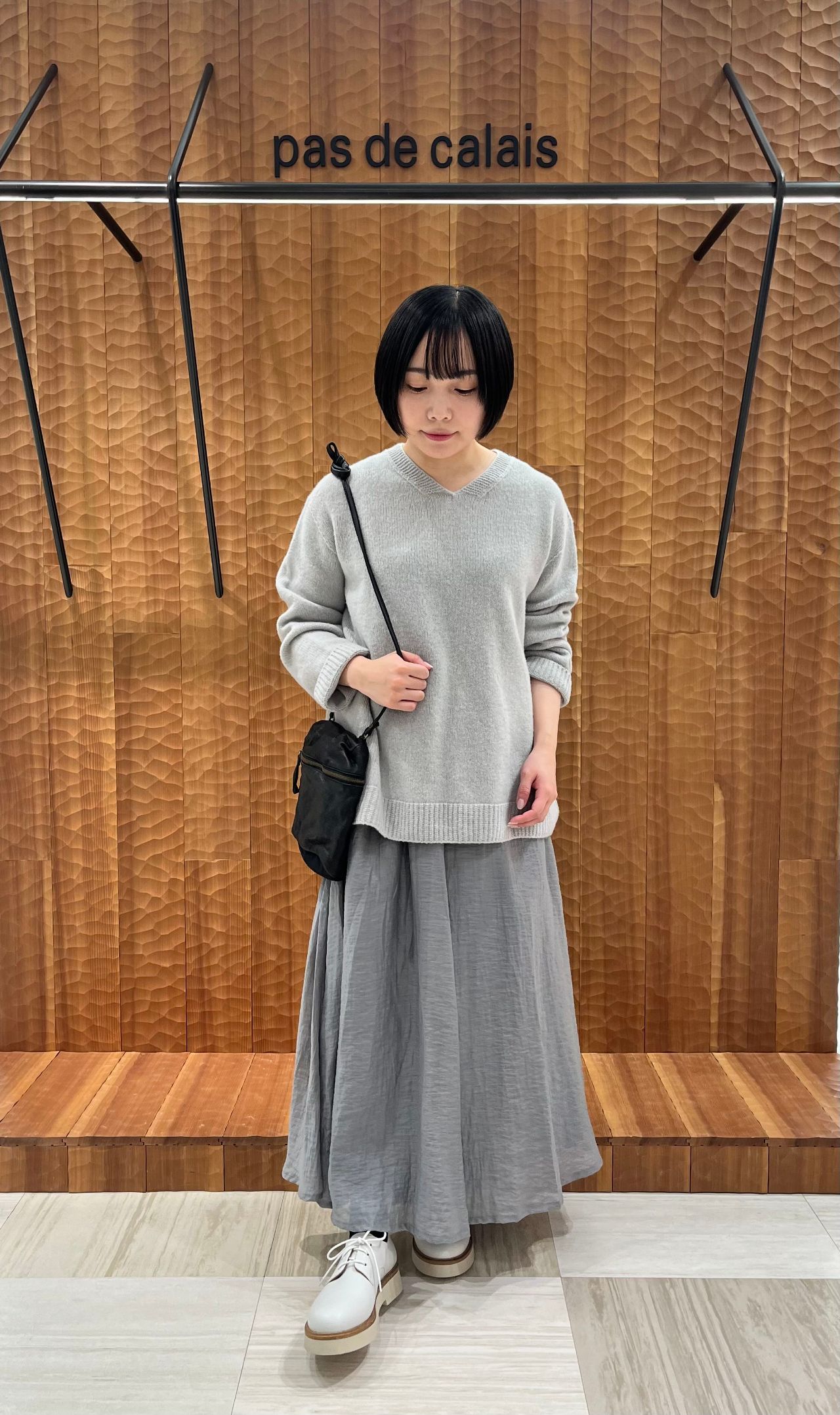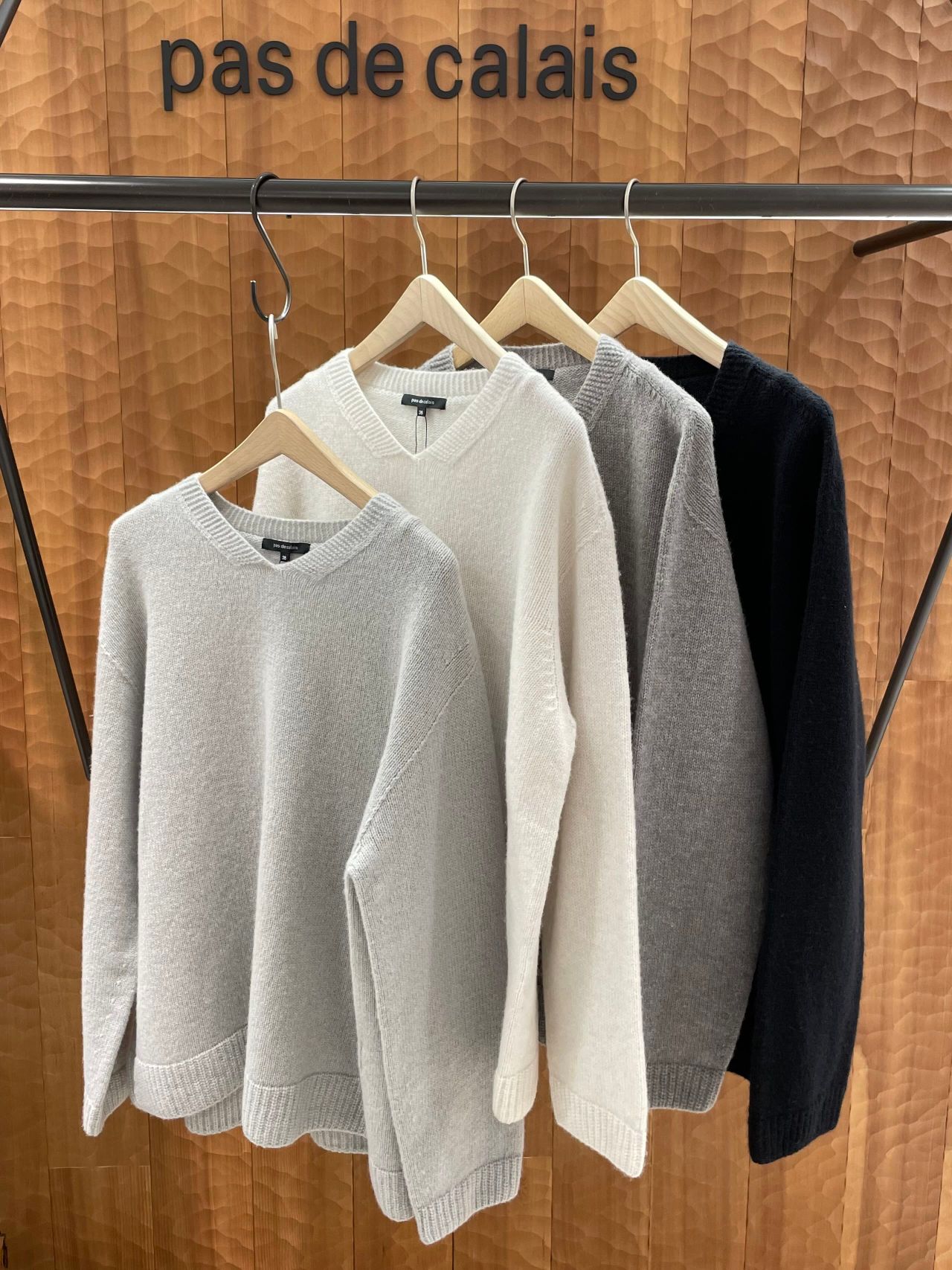 新作ニット、ラムズウールコットンブレンドに合わせて淡いカラースタイリングで。