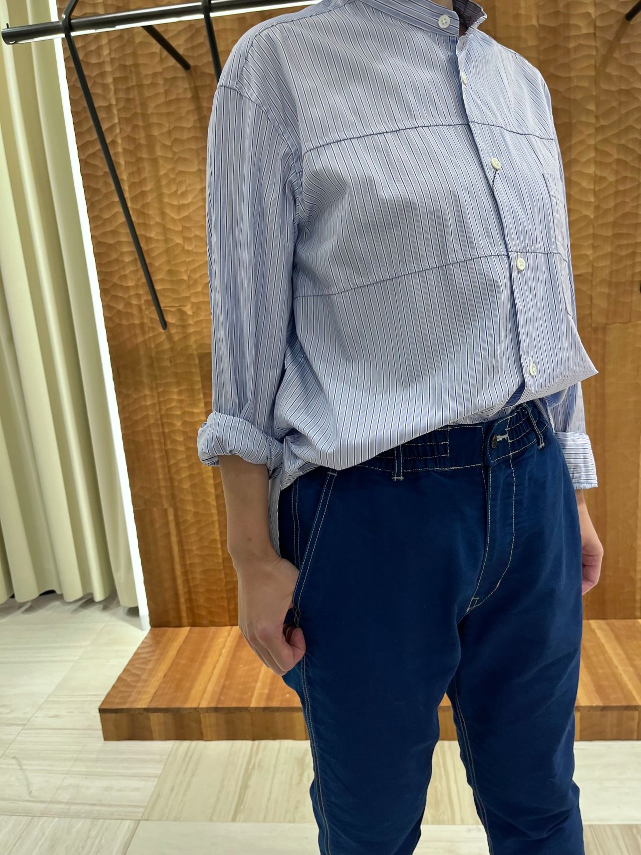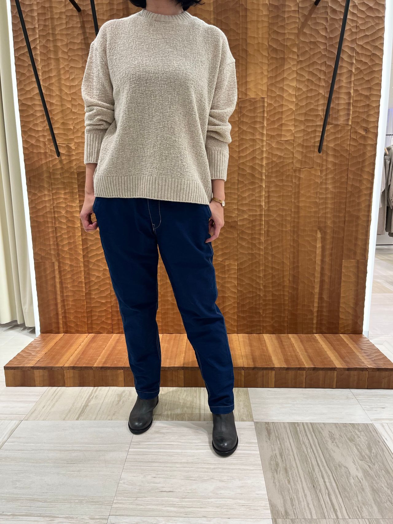 ボトムは、スタンダードなイージーテーパードパンツ。カラーステッチがアクセントに、ウエストにはゴム入りで楽ちんな穿き心地です。