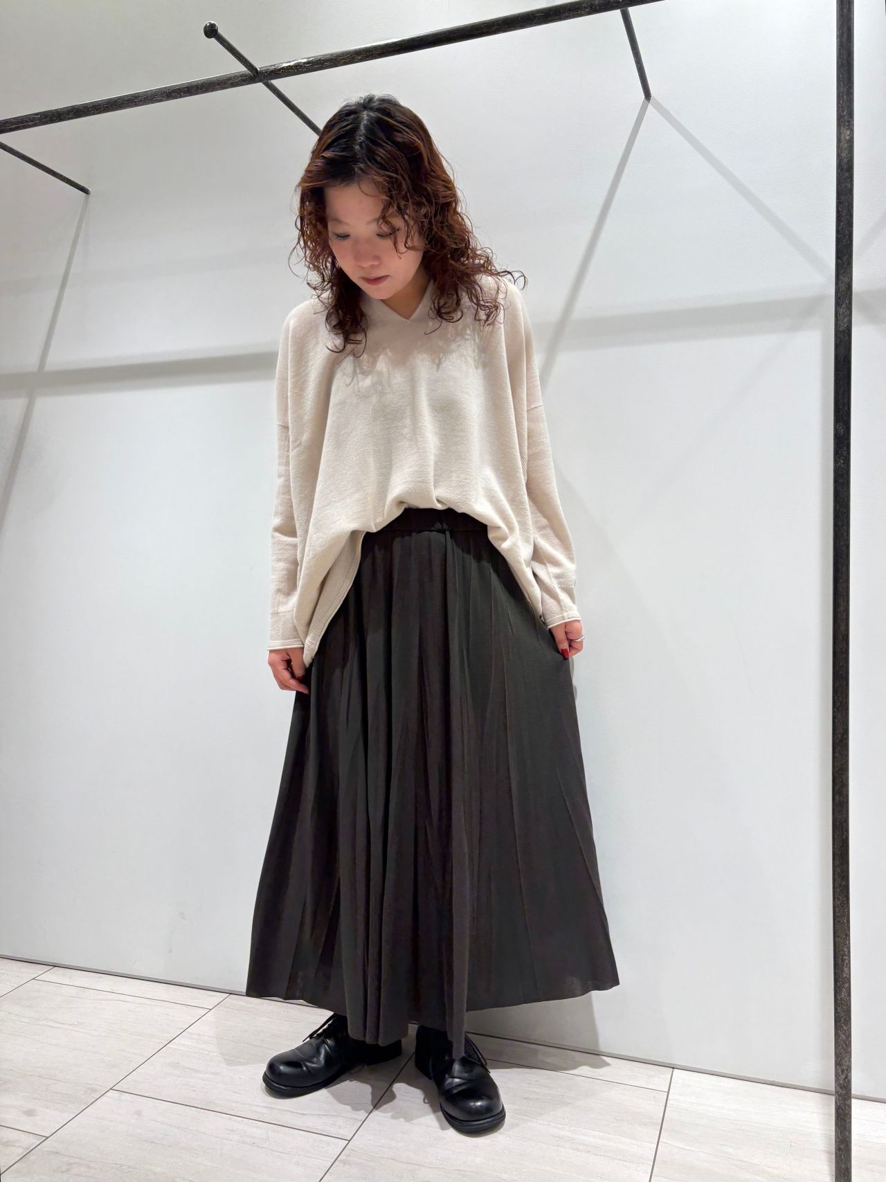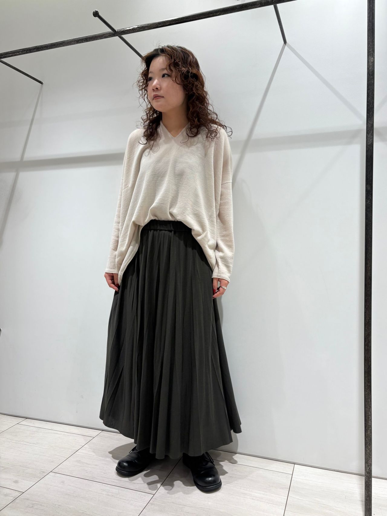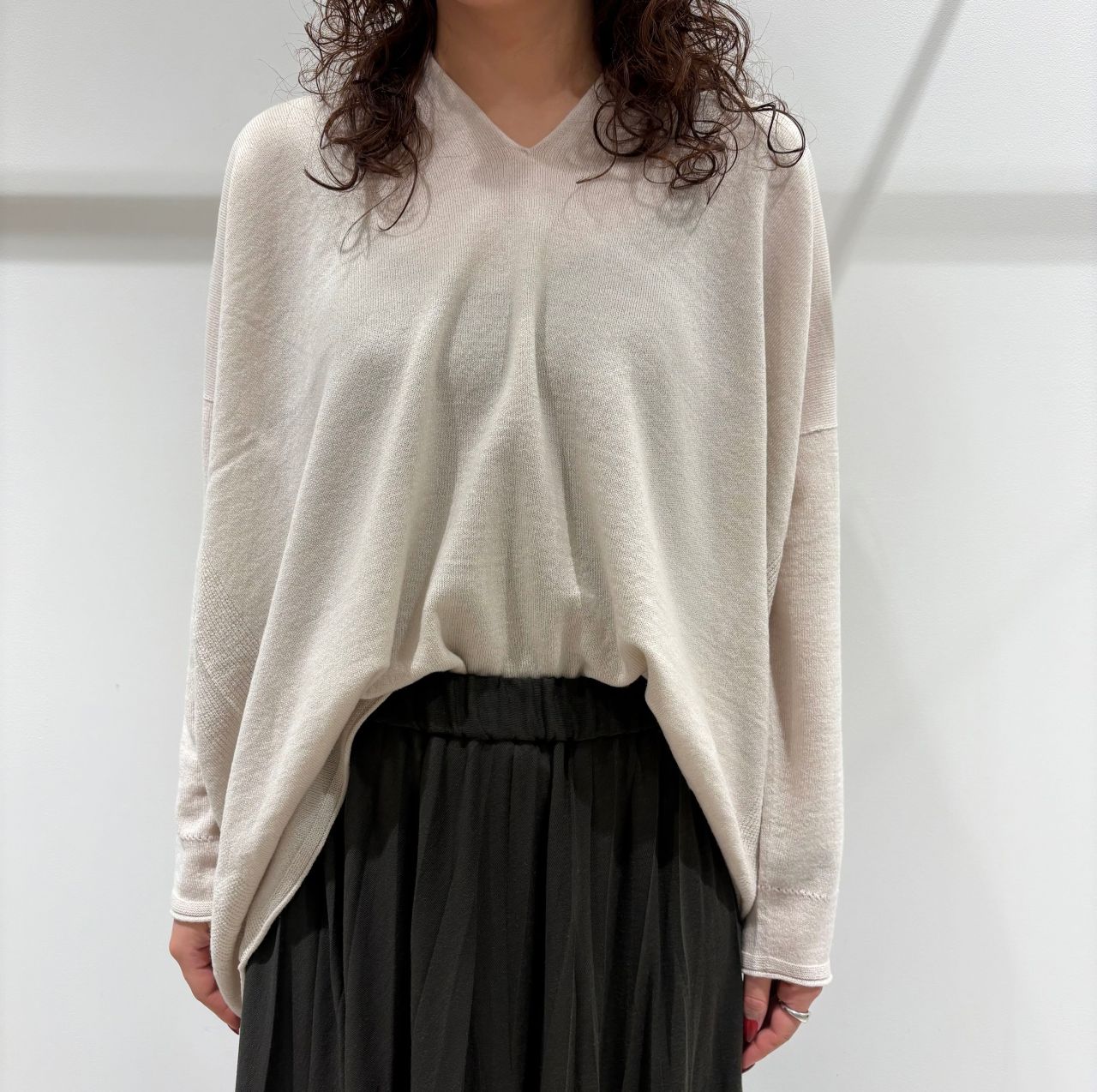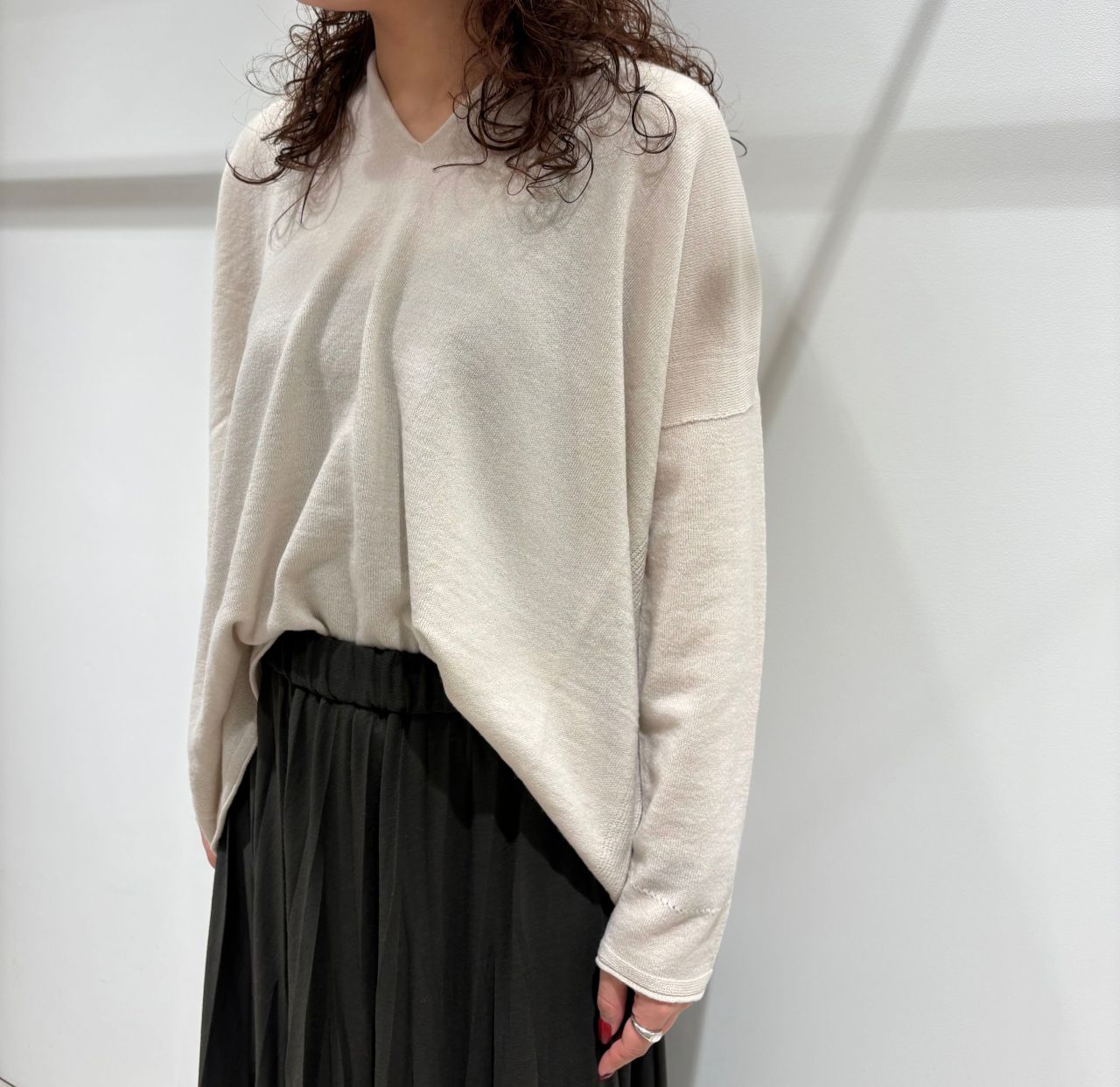 本日はチュニック丈のニットプルオーバーをご紹介いたします。縫い目の無い仕様で、肩も落ちている為、肩周りや上半身がとてもスッキリしたシルエットになります。腕周りにゆとりがある為、着心地もゆったりしているのでとても気持ちいいです。Vネックの開きも深すぎないので、ちょうどよく首元を綺麗に見せてくれます。