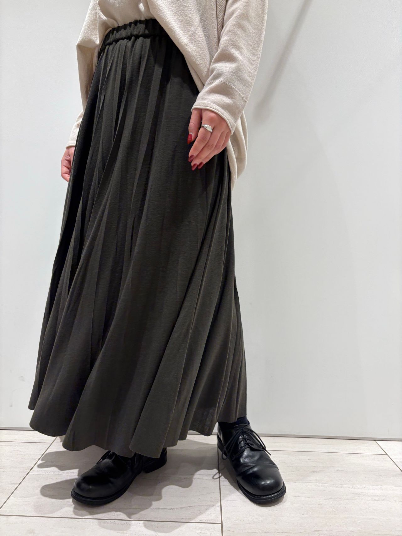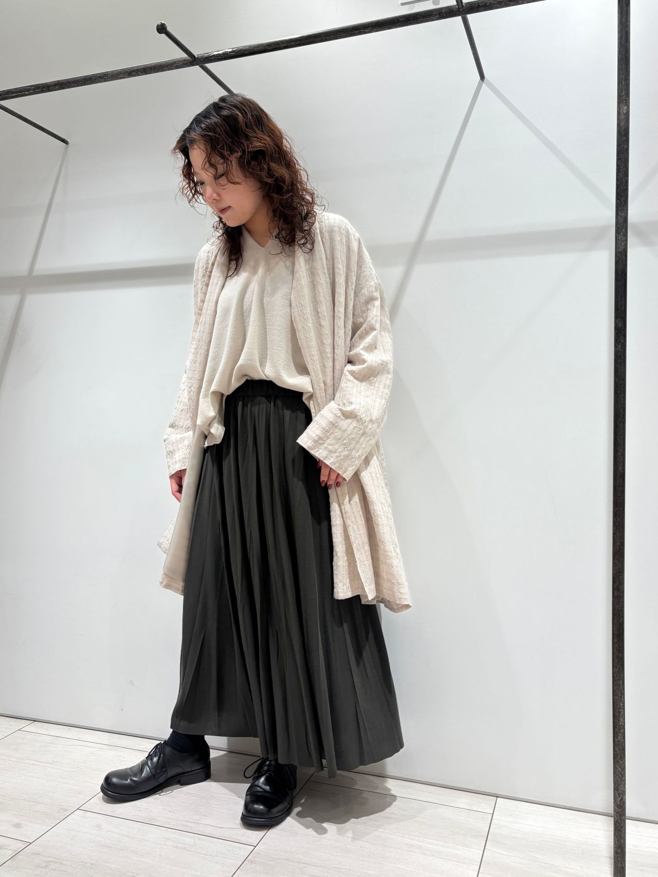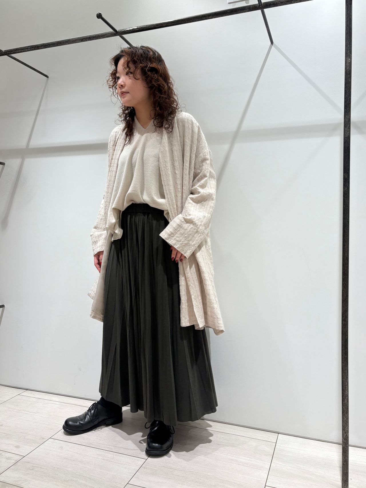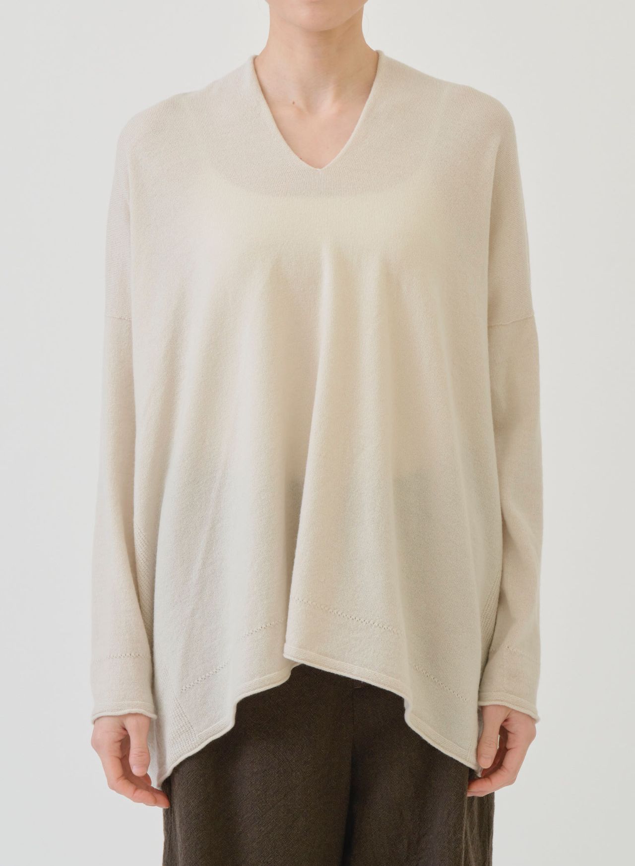 本日はチュニック丈のニットプルオーバーをご紹介いたします。縫い目の無い仕様で、肩も落ちている為、肩周りや上半身がとてもスッキリしたシルエットになります。腕周りにゆとりがある為、着心地もゆったりしているのでとても気持ちいいです。Vネックの開きも深すぎないので、ちょうどよく首元を綺麗に見せてくれます。