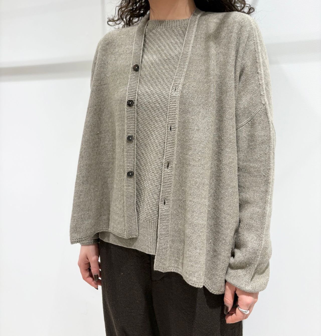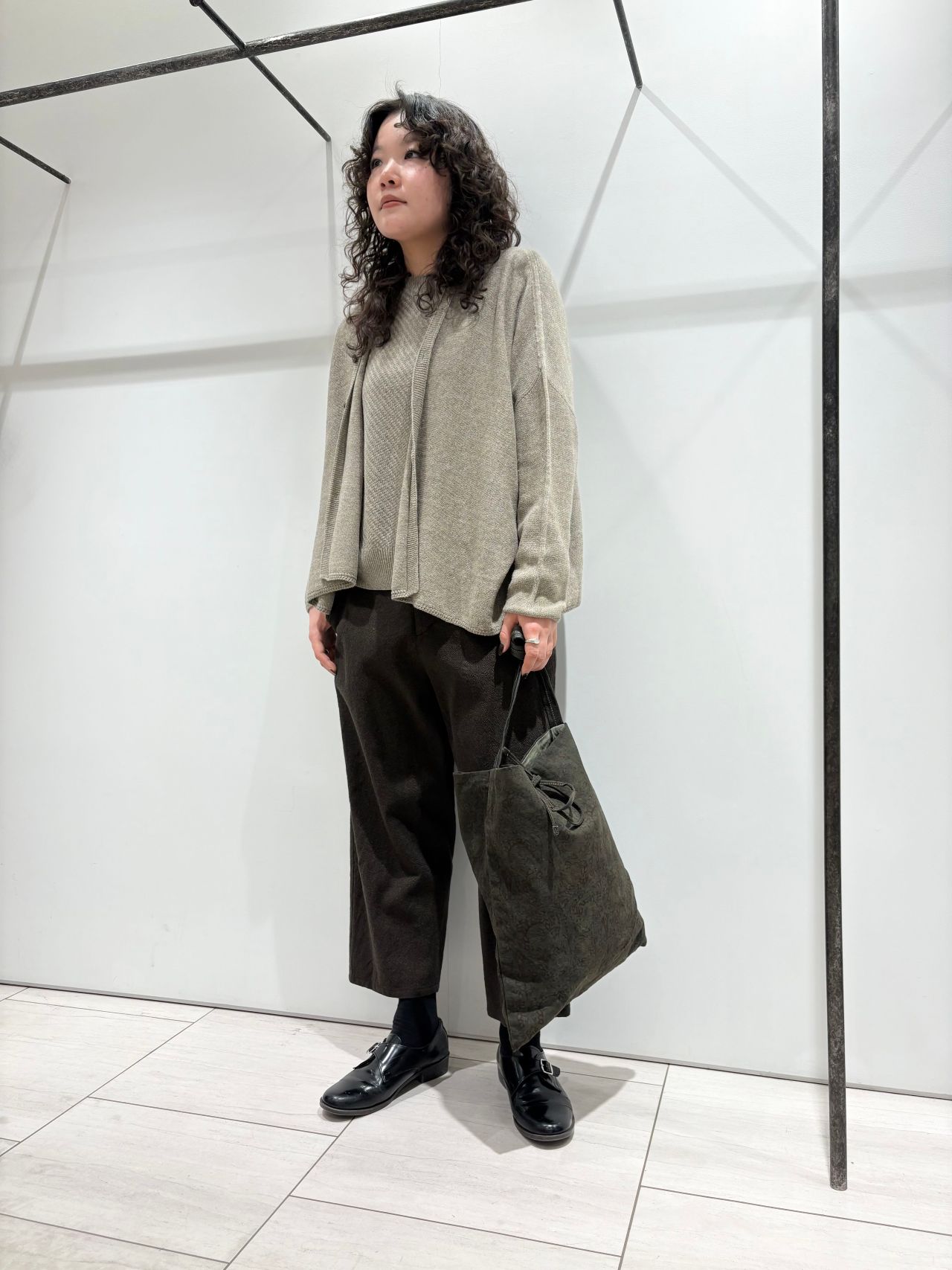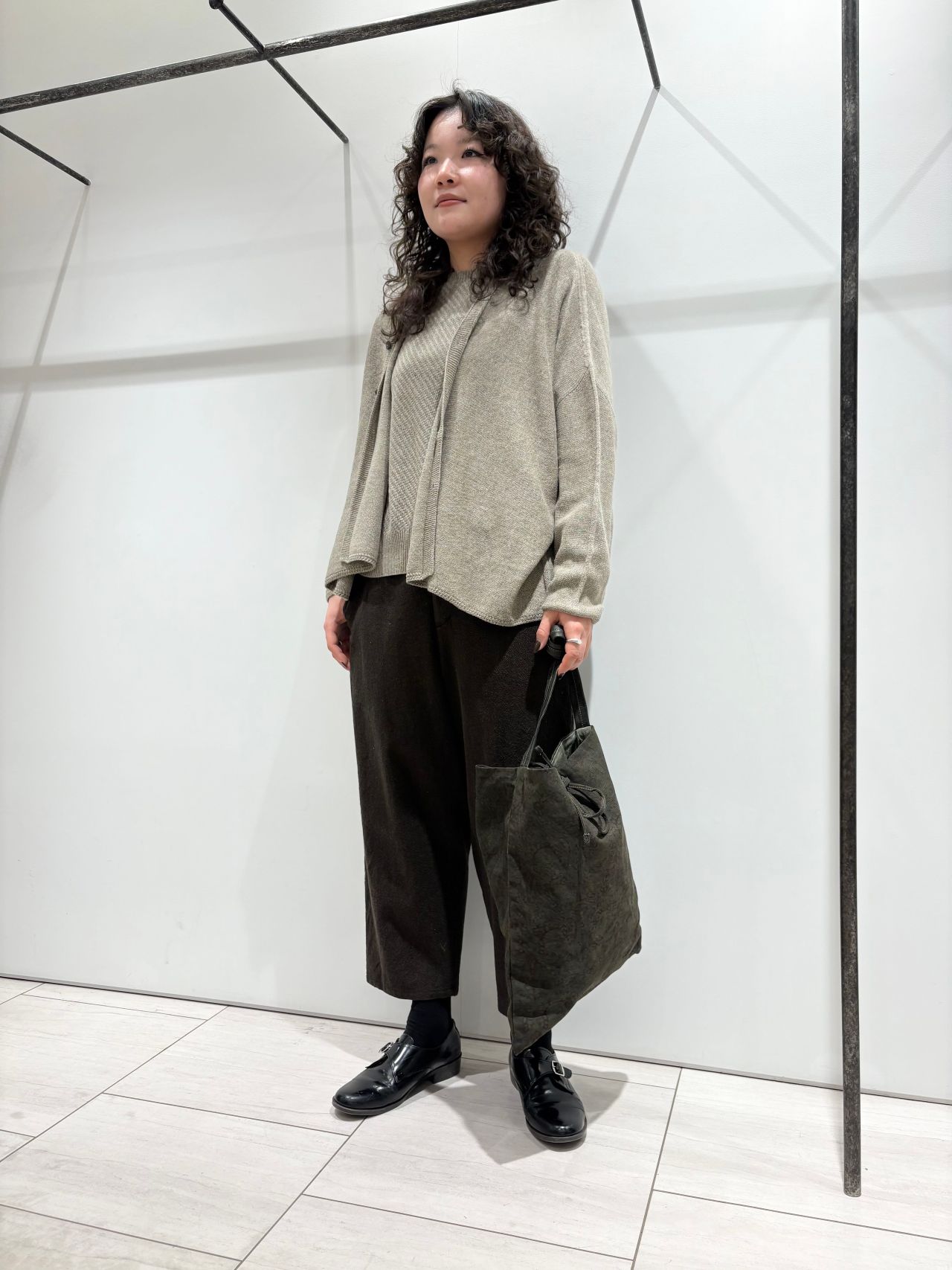 綿にウールをブレンドした、肌触りの良い素材。保温性の中に軽さもあるので、アンサンブルでの着用もおすすめです。製品染めを行なっている為、深みのあるカラーも、コーディネートのワンポイントになります。