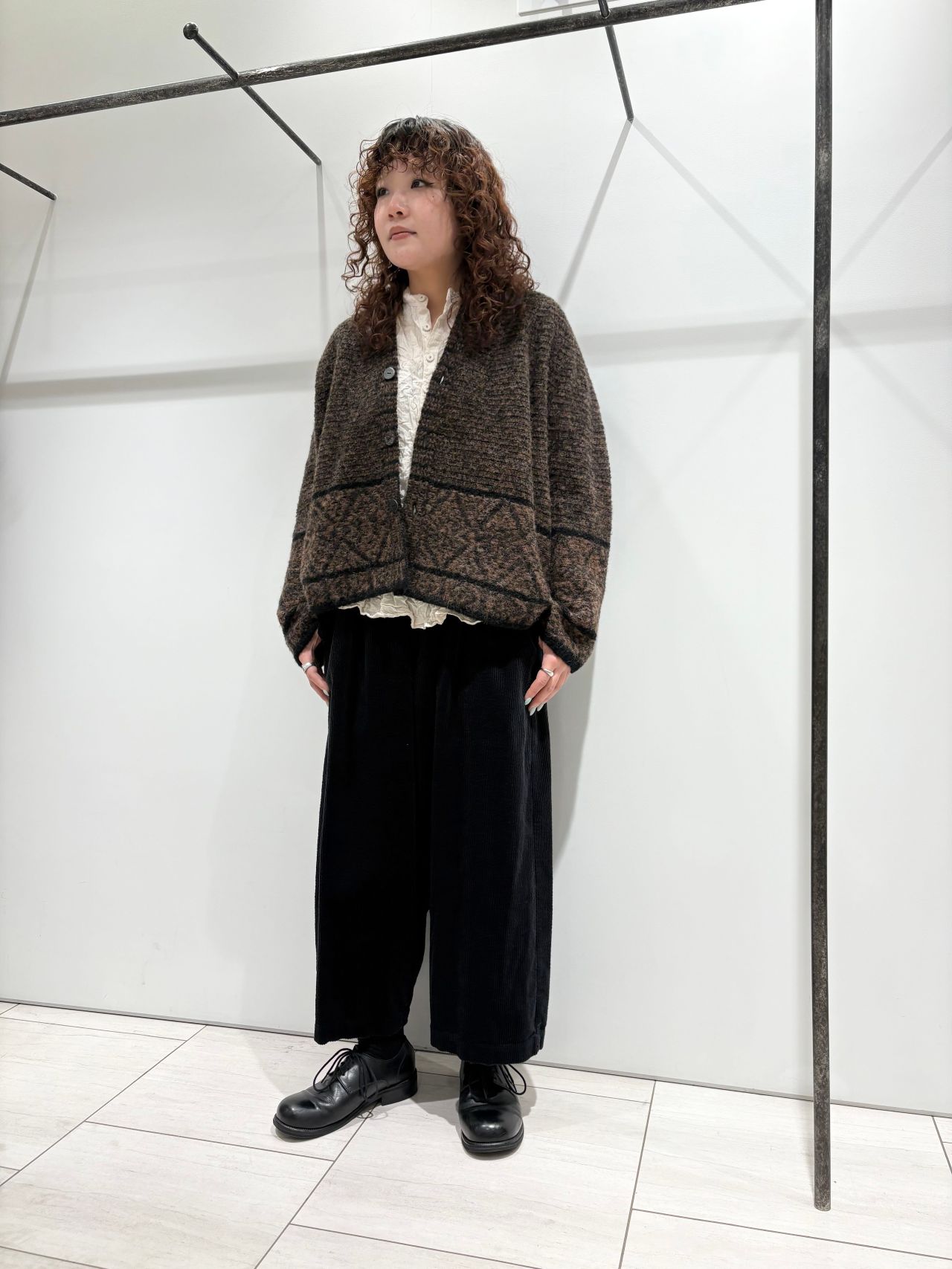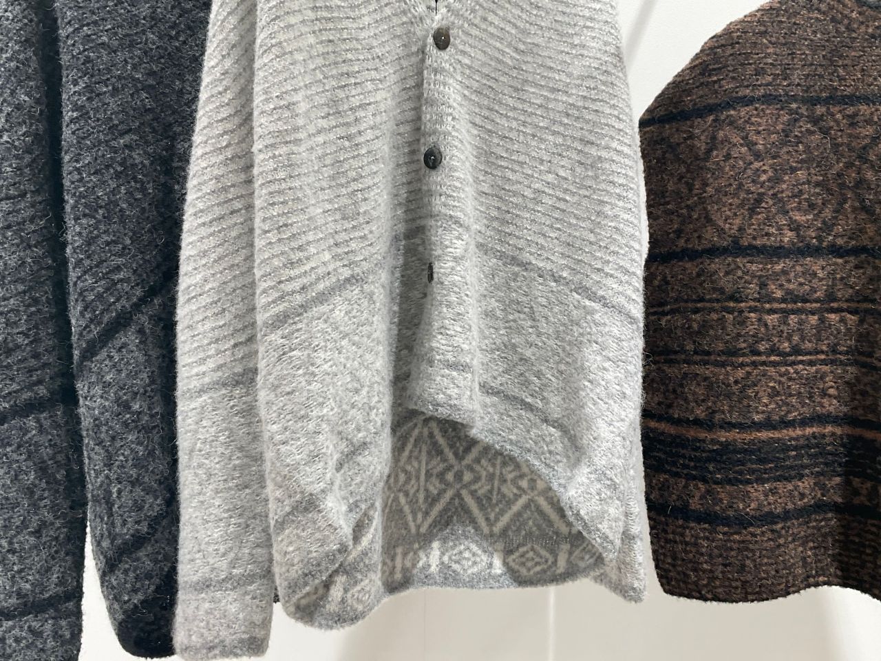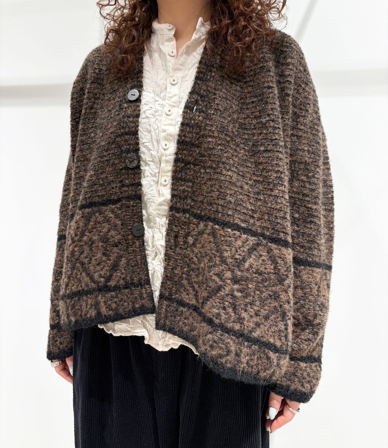 幾何学模様のジャガードニット。丈感もコンパクトなので、アウターの下に着てもかさばらず、ボリューム感のあるボトムスとも相性抜群です。シンプルめなスタイリングに一癖加えてくれるアイテムです。アルパカとウールのMIXで、暖かさもありつつとても軽いカーディガンなので気軽に羽織っていただけます。