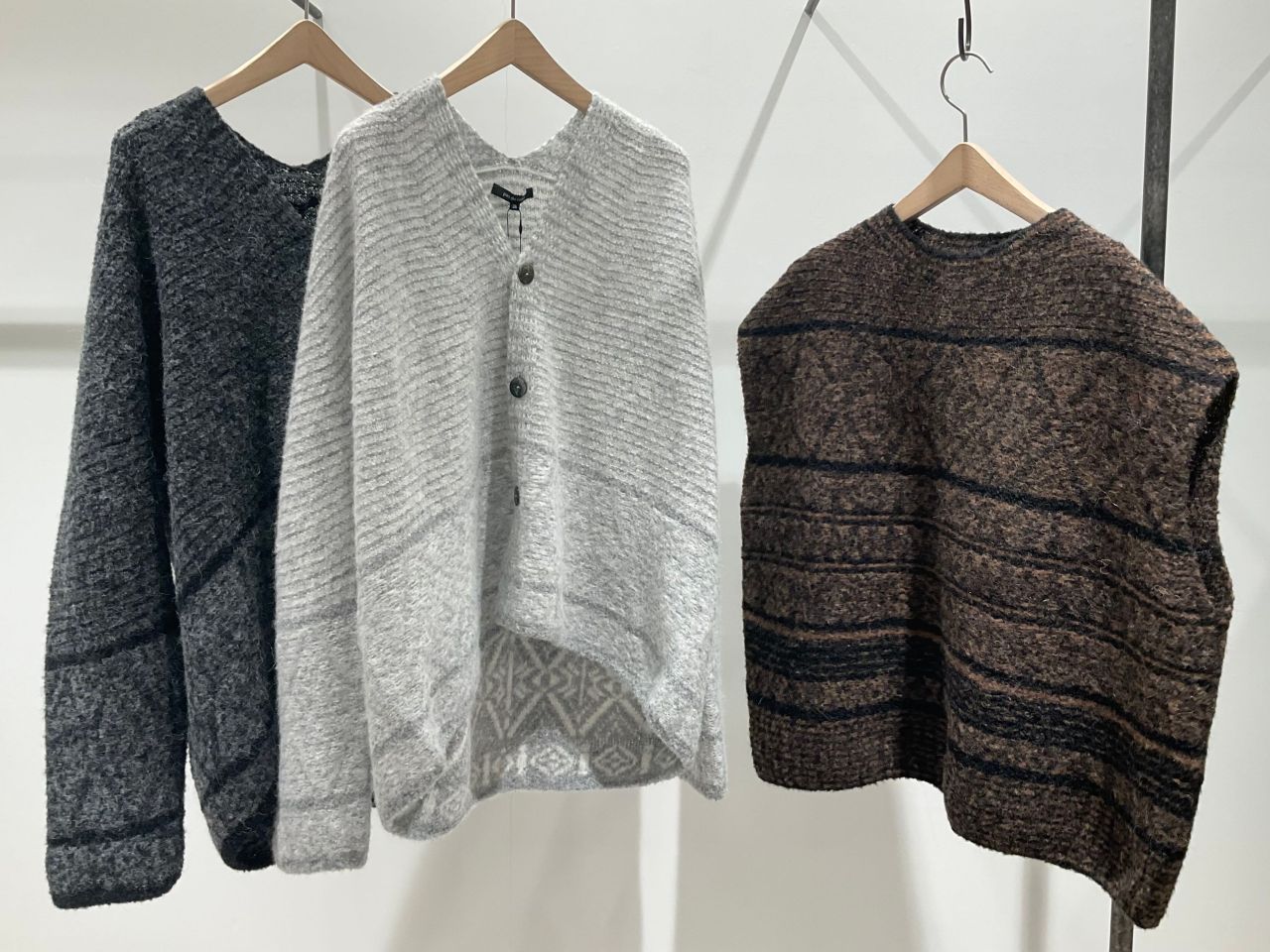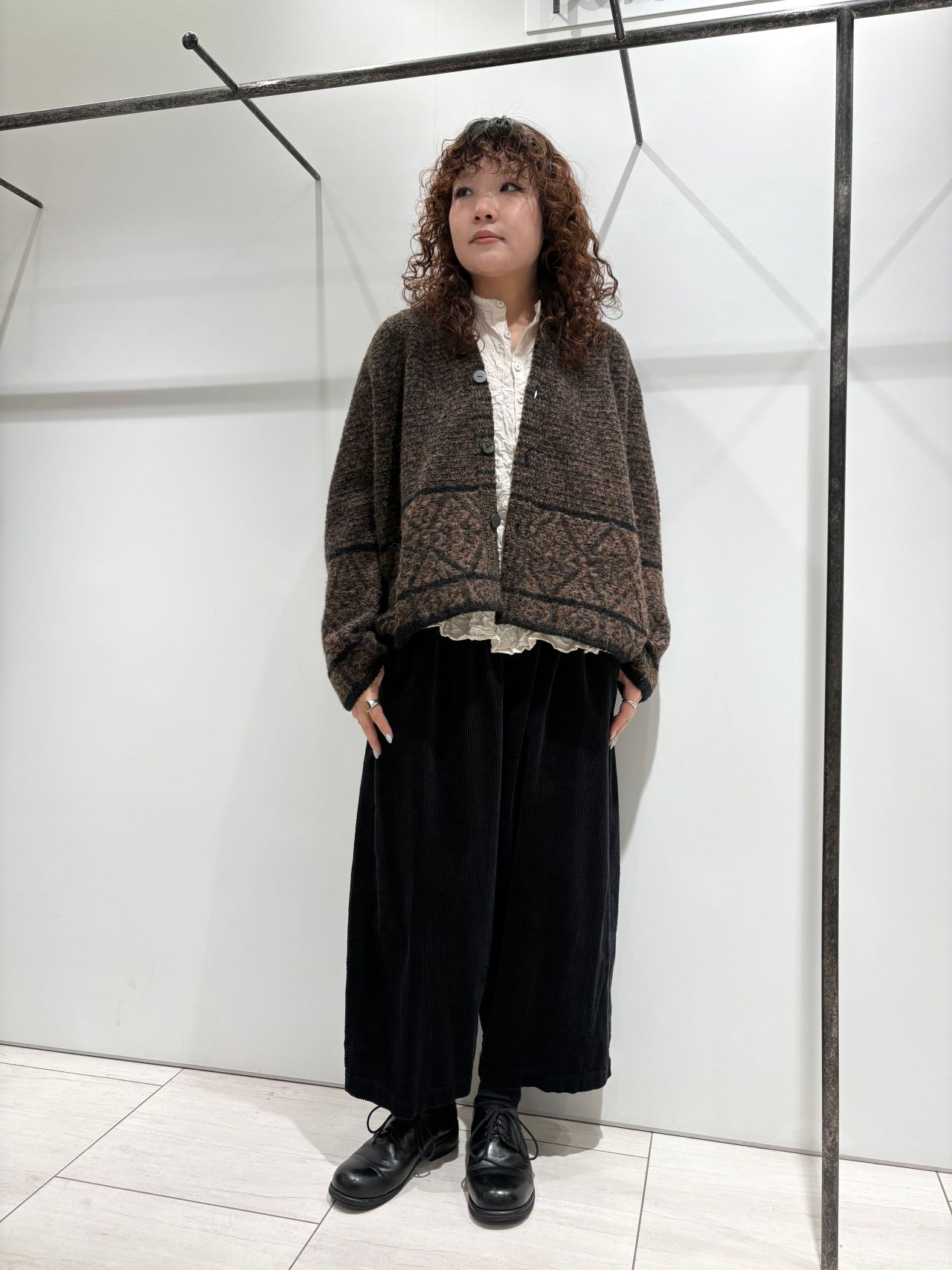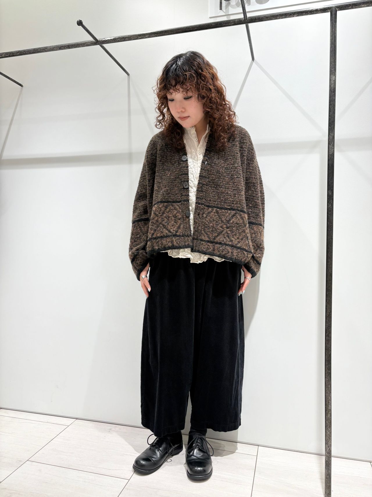 幾何学模様のジャガードニット。丈感もコンパクトなので、アウターの下に着てもかさばらず、ボリューム感のあるボトムスとも相性抜群です。シンプルめなスタイリングに一癖加えてくれるアイテムです。アルパカとウールのMIXで、暖かさもありつつとても軽いカーディガンなので気軽に羽織っていただけます。