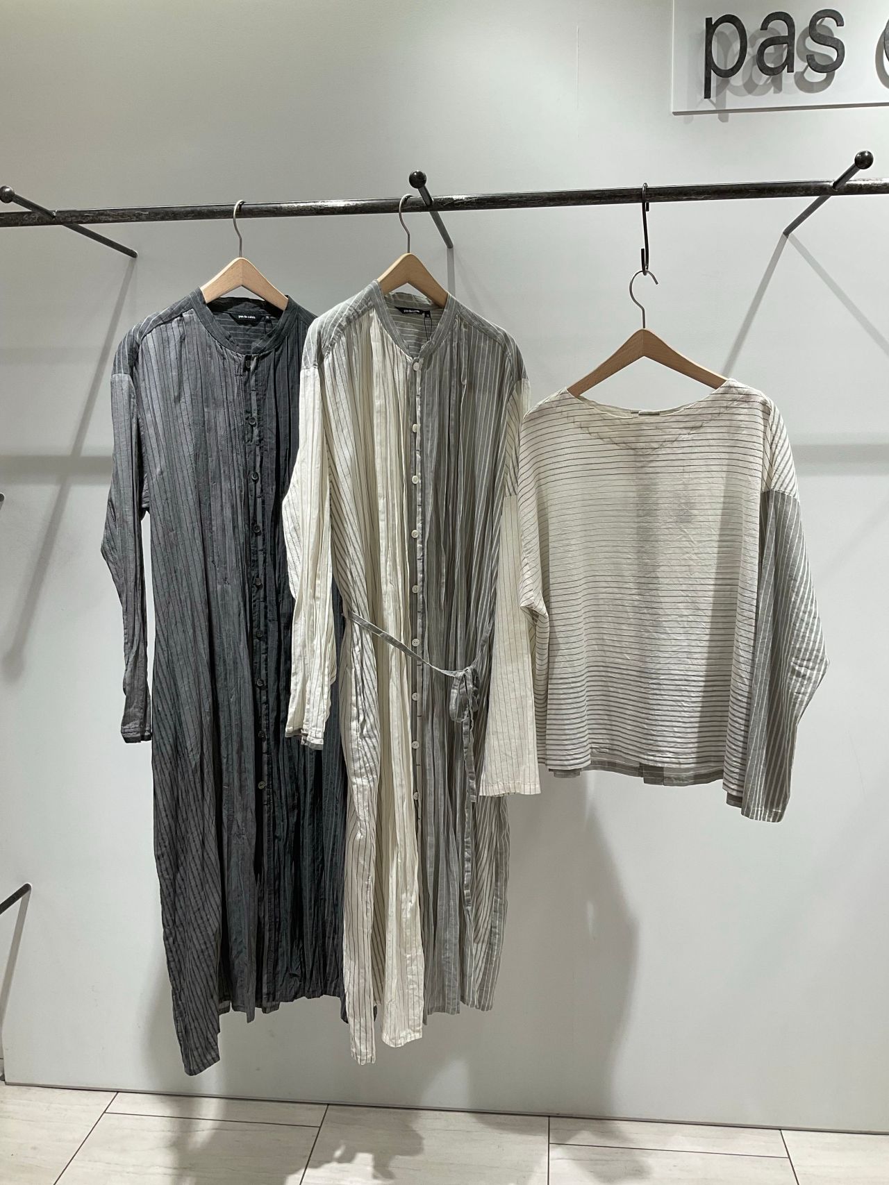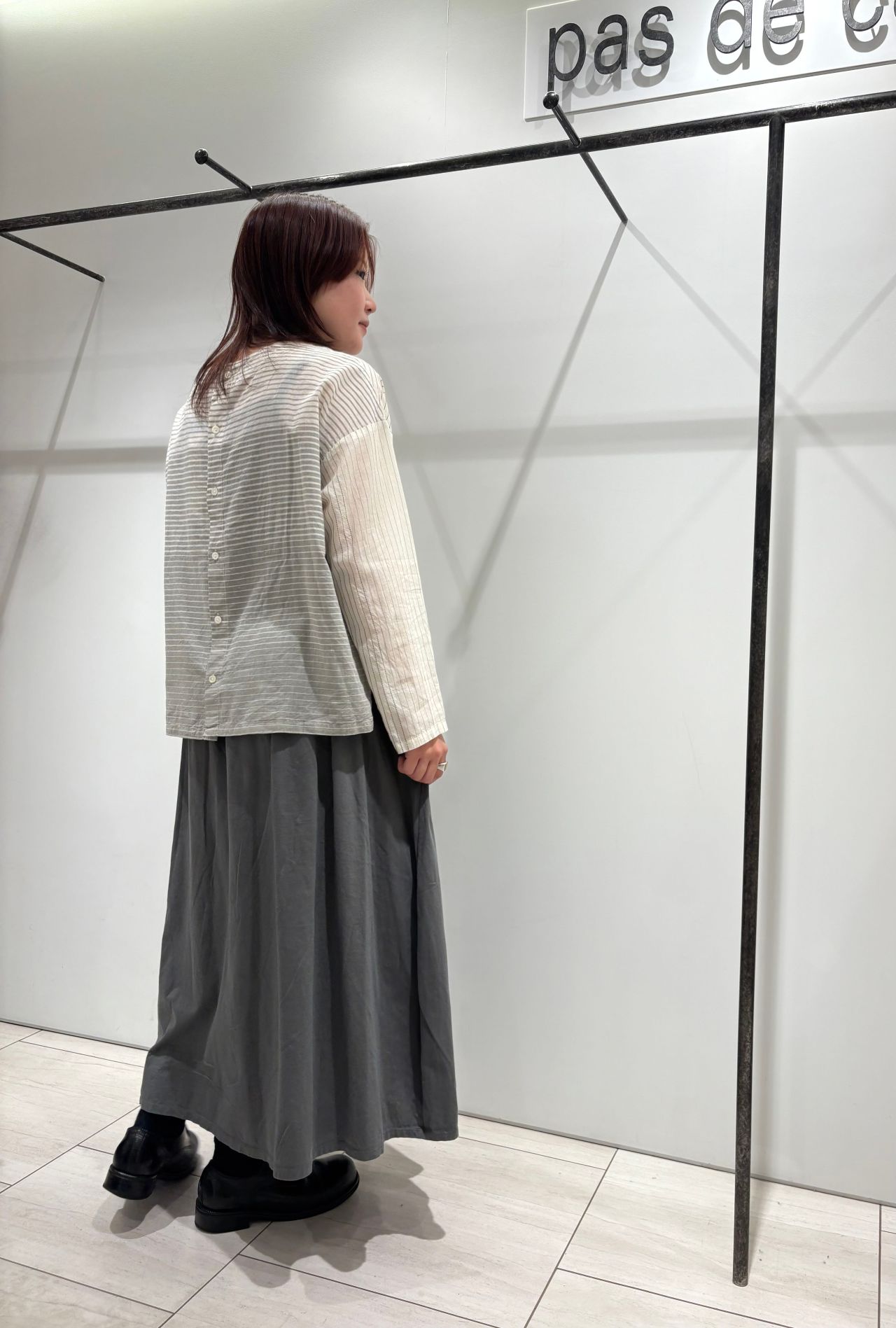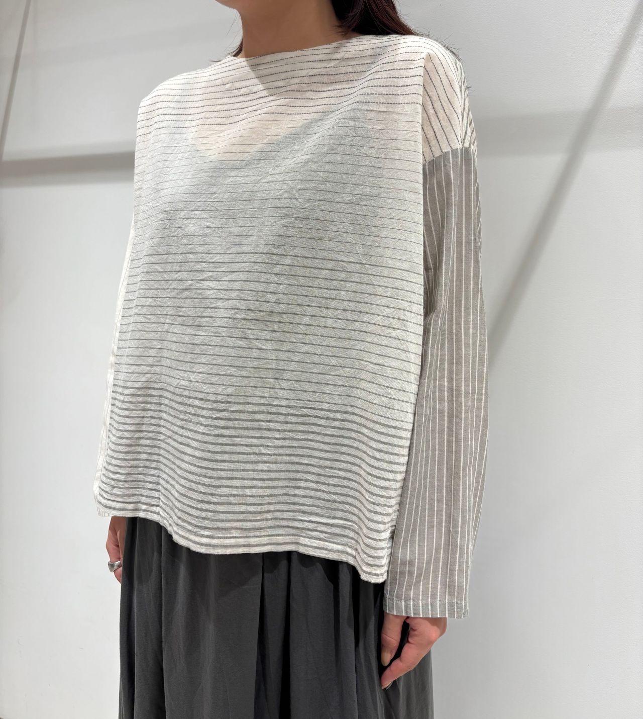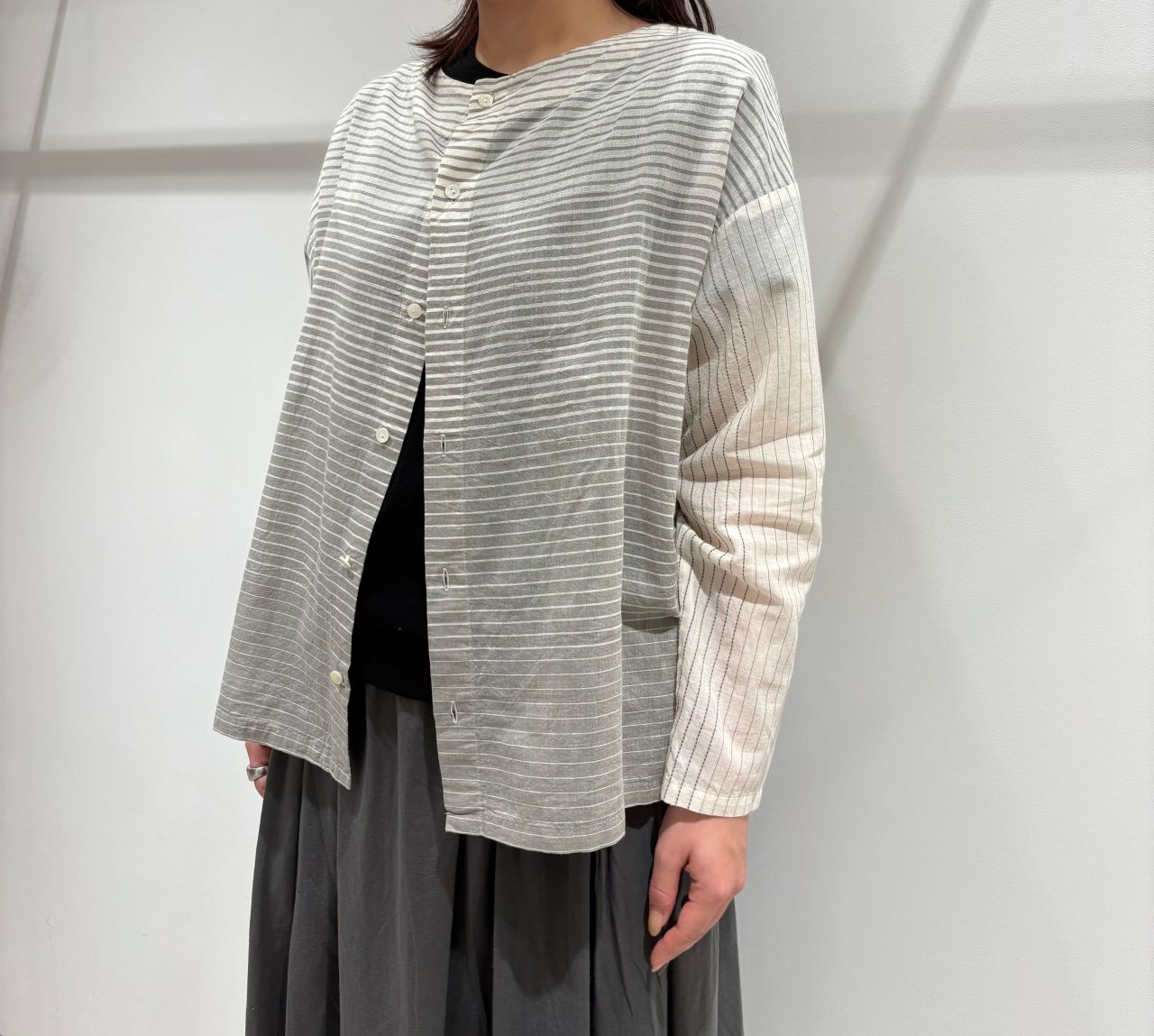 生地の左右で印象が変わるように、先染ストライプとドビーを組み合わせ部分的に巾の違うストライプをグラデーションのように配した。インド生地ならではの配色で、生地の耳を使用している。