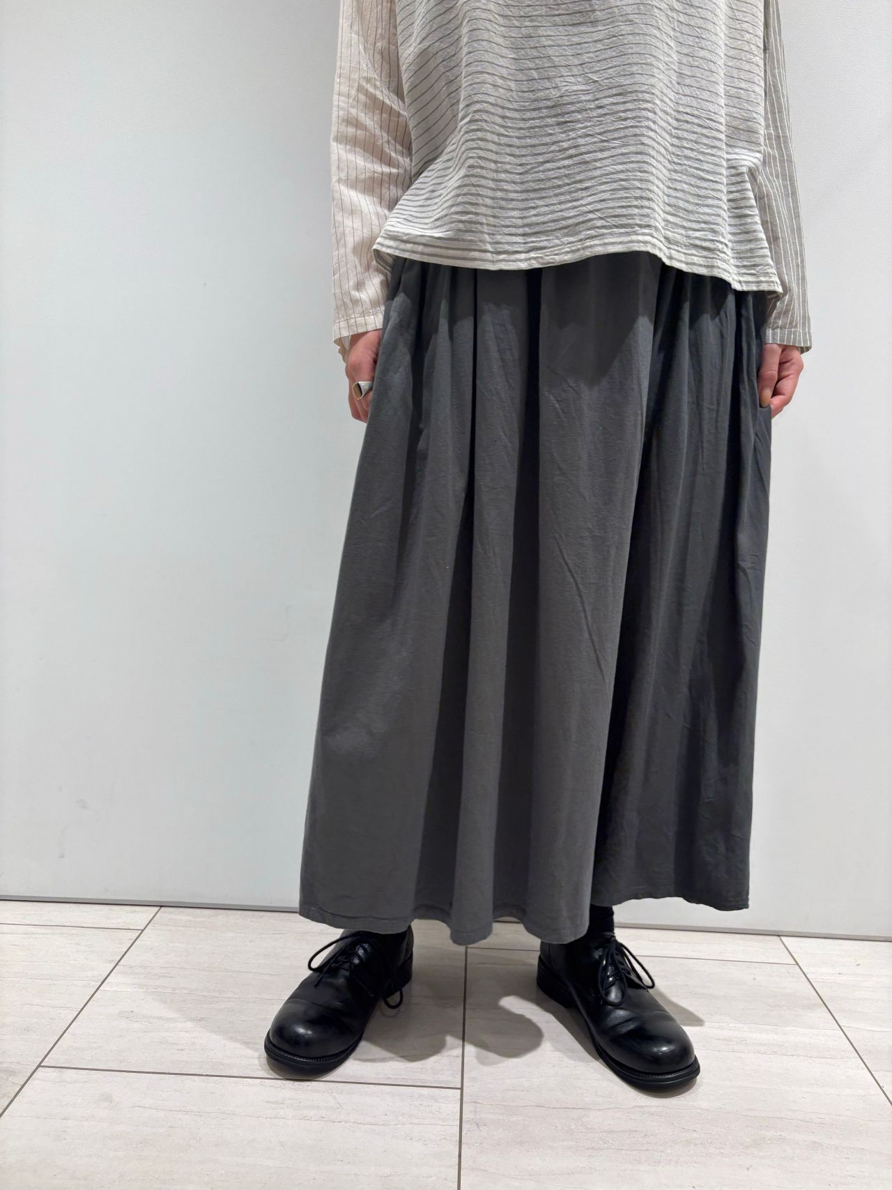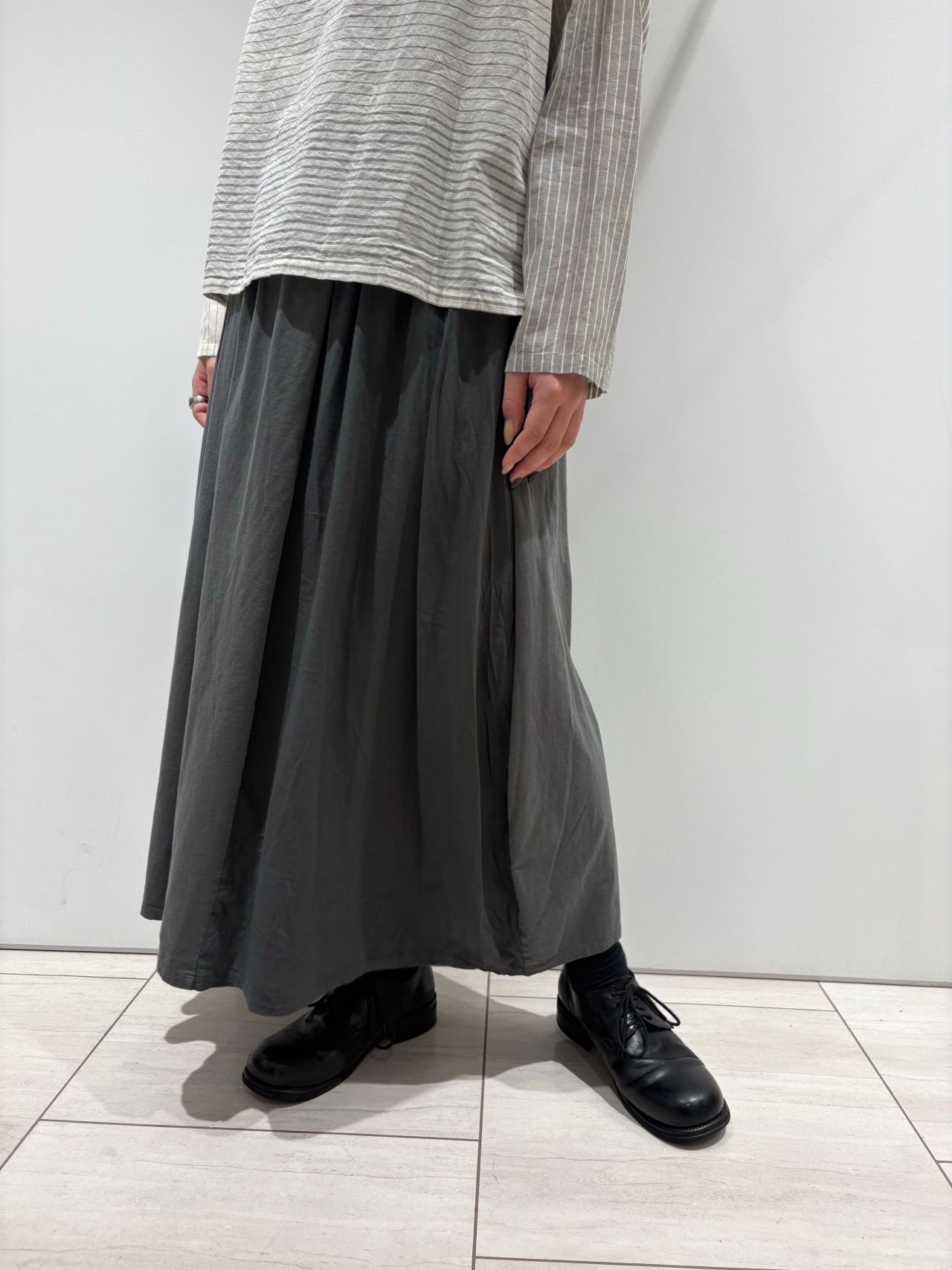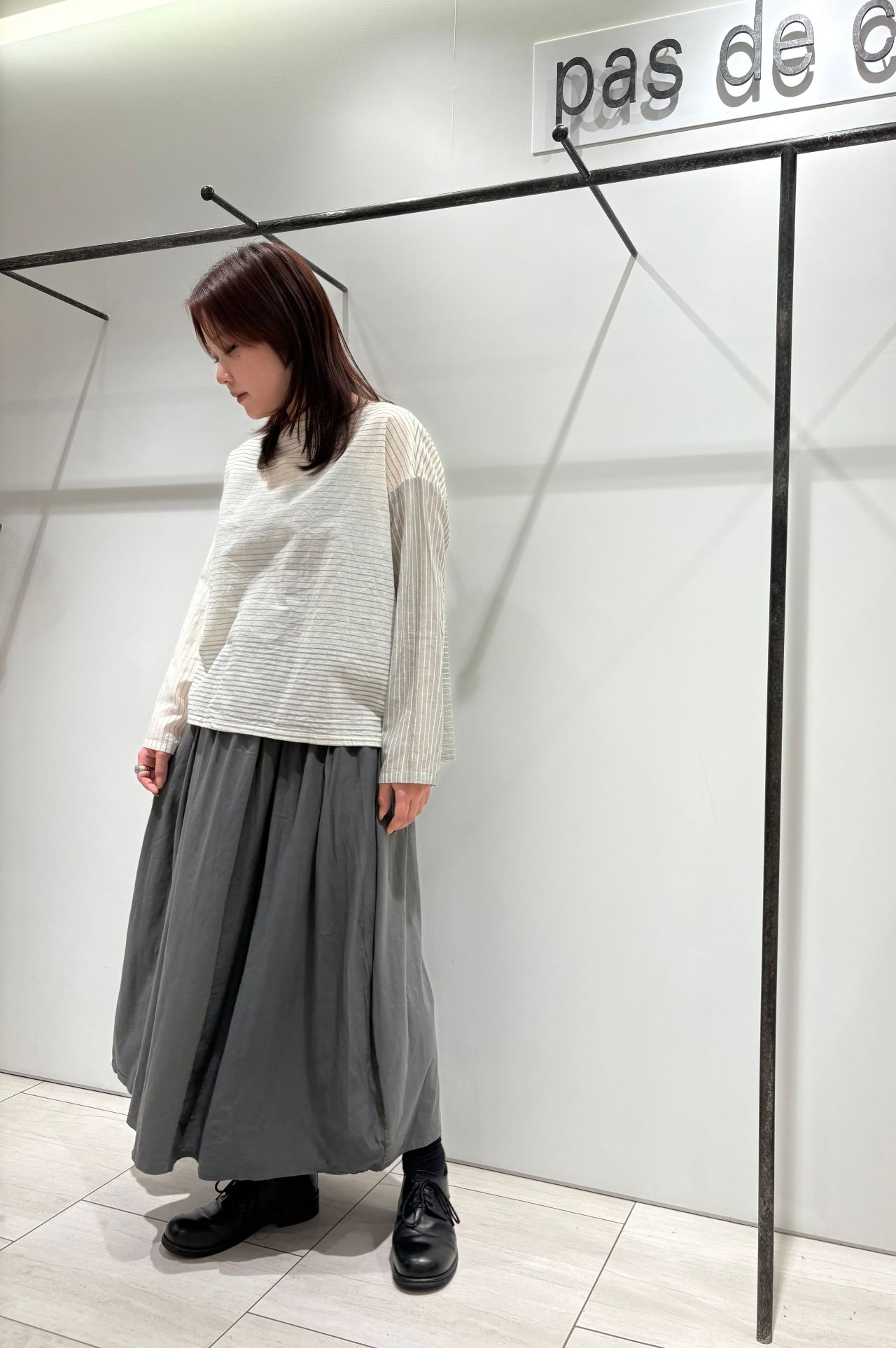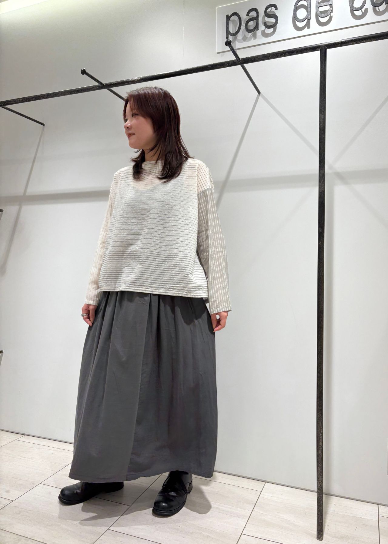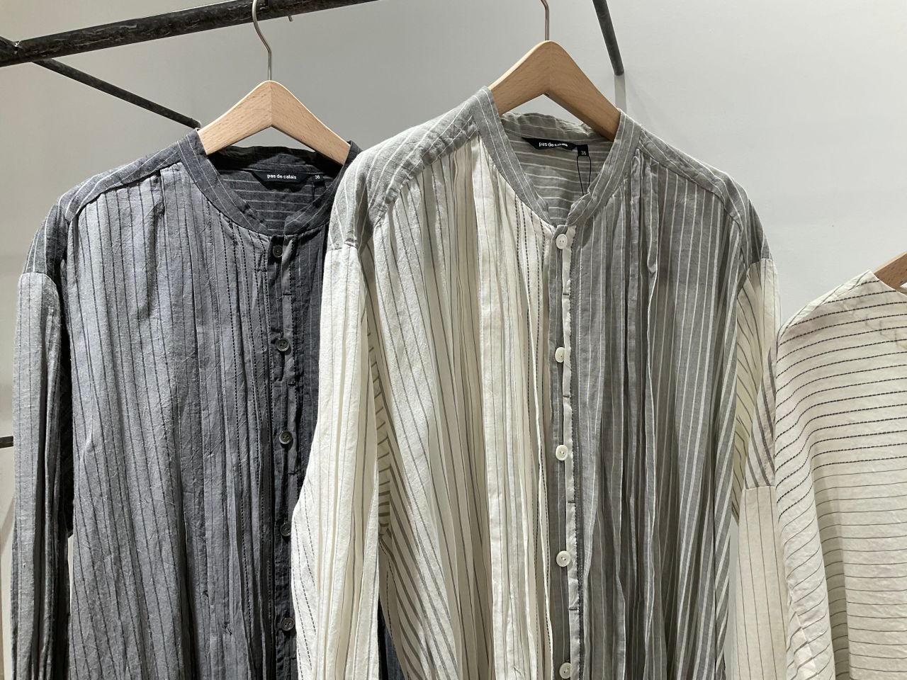 生地の左右で印象が変わるように、先染ストライプとドビーを組み合わせ部分的に巾の違うストライプをグラデーションのように配した。インド生地ならではの配色で、生地の耳を使用している。