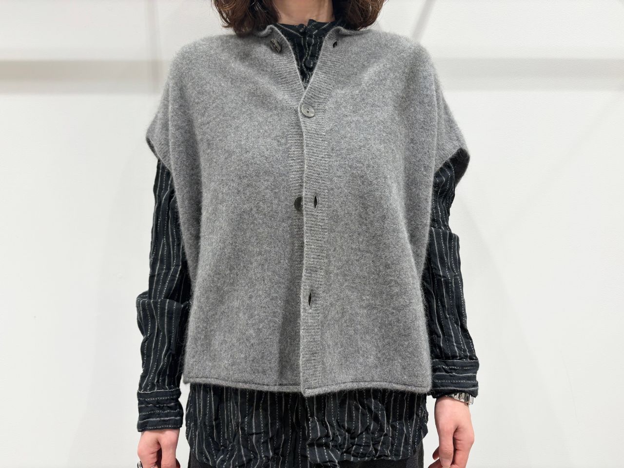 軽く保温性に優れ、柔らかいタッチのチャイニーズ・ラクーンを使用。毛足が出ており、ファーのような素材感のニットです。柔らかさと高級感のある見た目で、軽くて心地よい肌触りです。