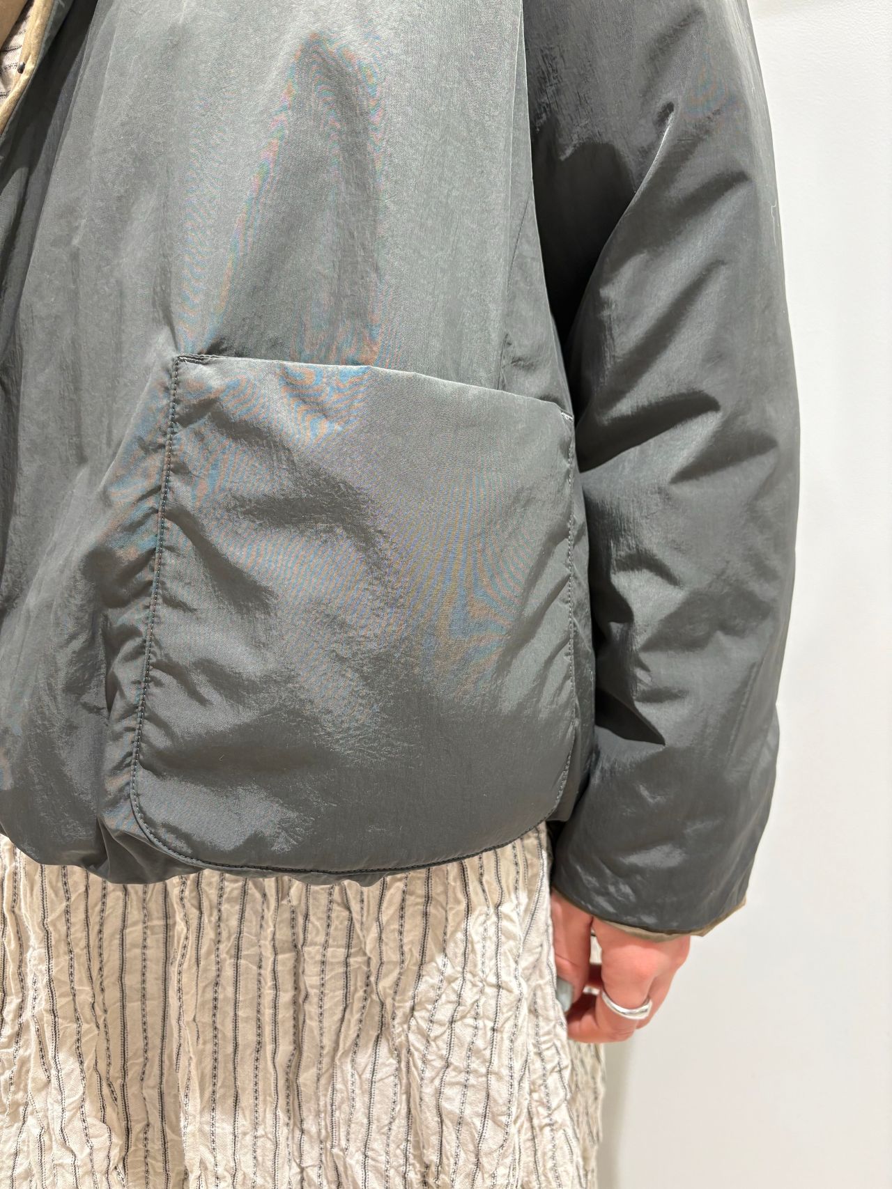 リバーシブル仕様のダウンジャケット。体を包むような丸みのある形ですが、軽さもありすっきりとしたシルエットです。ドローストリングで裾を絞って、自分好みに形を調節できます。リバーシブルで表情も変わるので、様々なコーディネートでお楽しみいただけます。