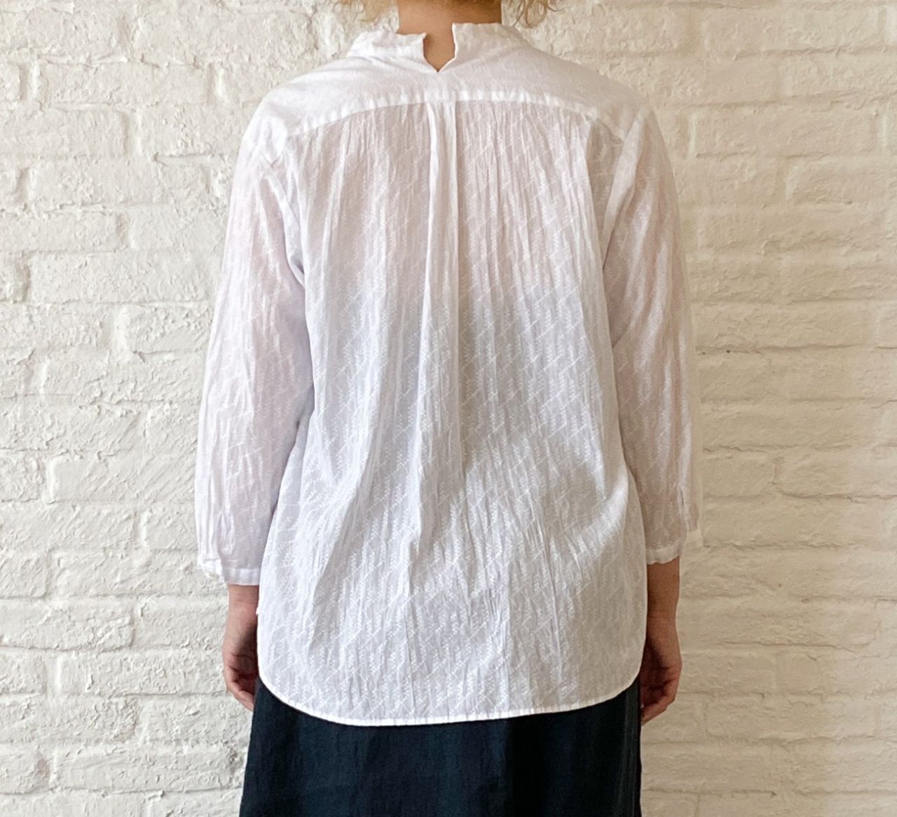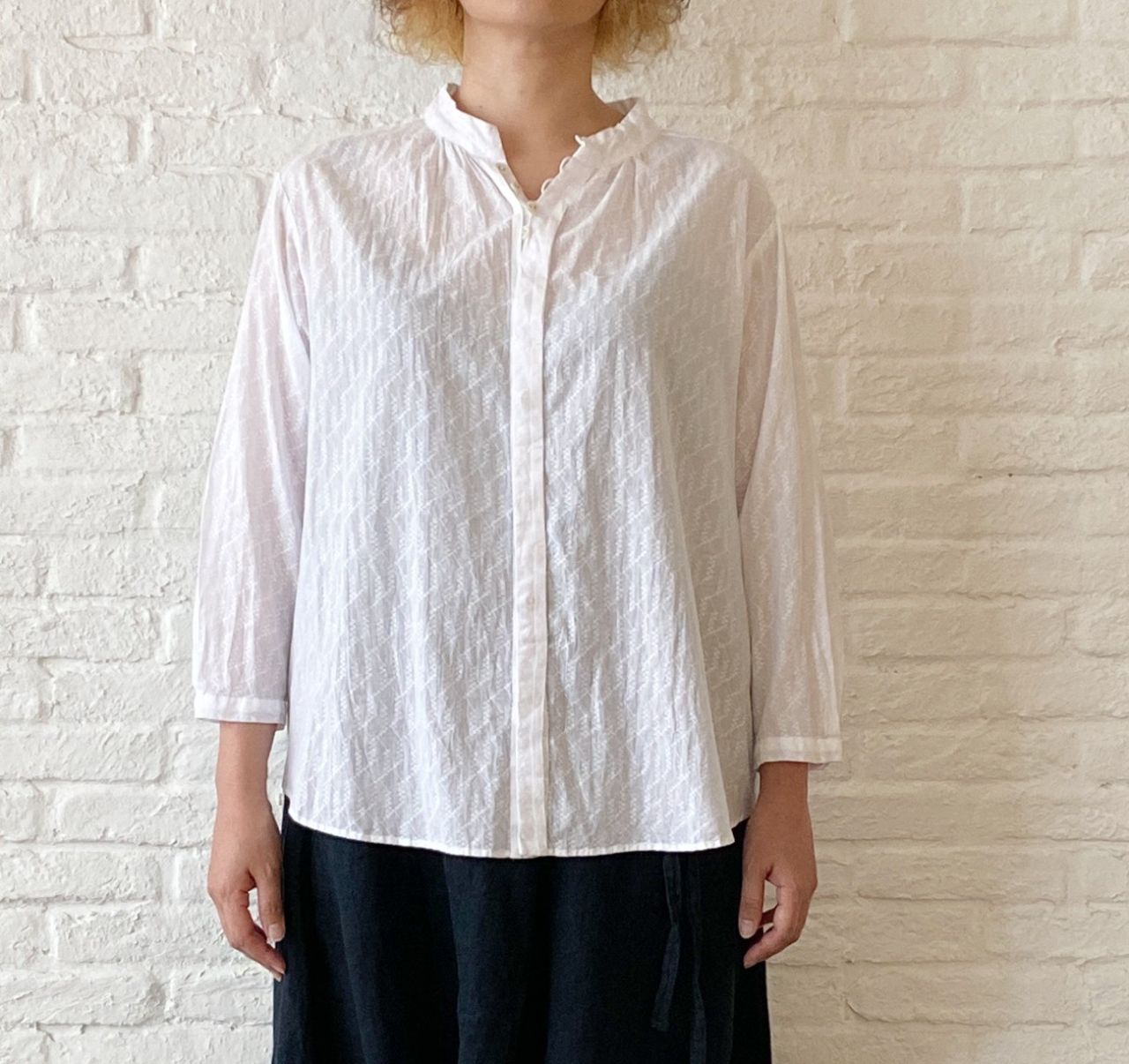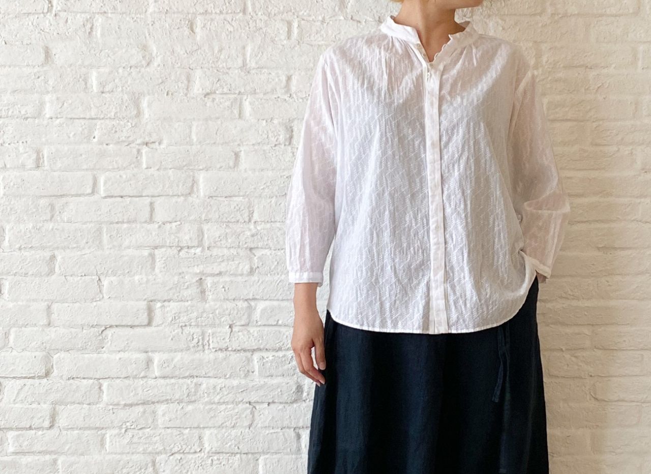 刺繍したような生地を使用したコットンブラウス。