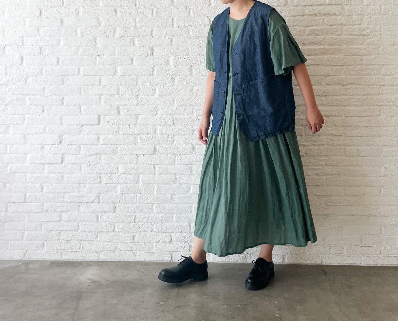 落ち着いたペールグリーンは、デニムとの相性も◎。