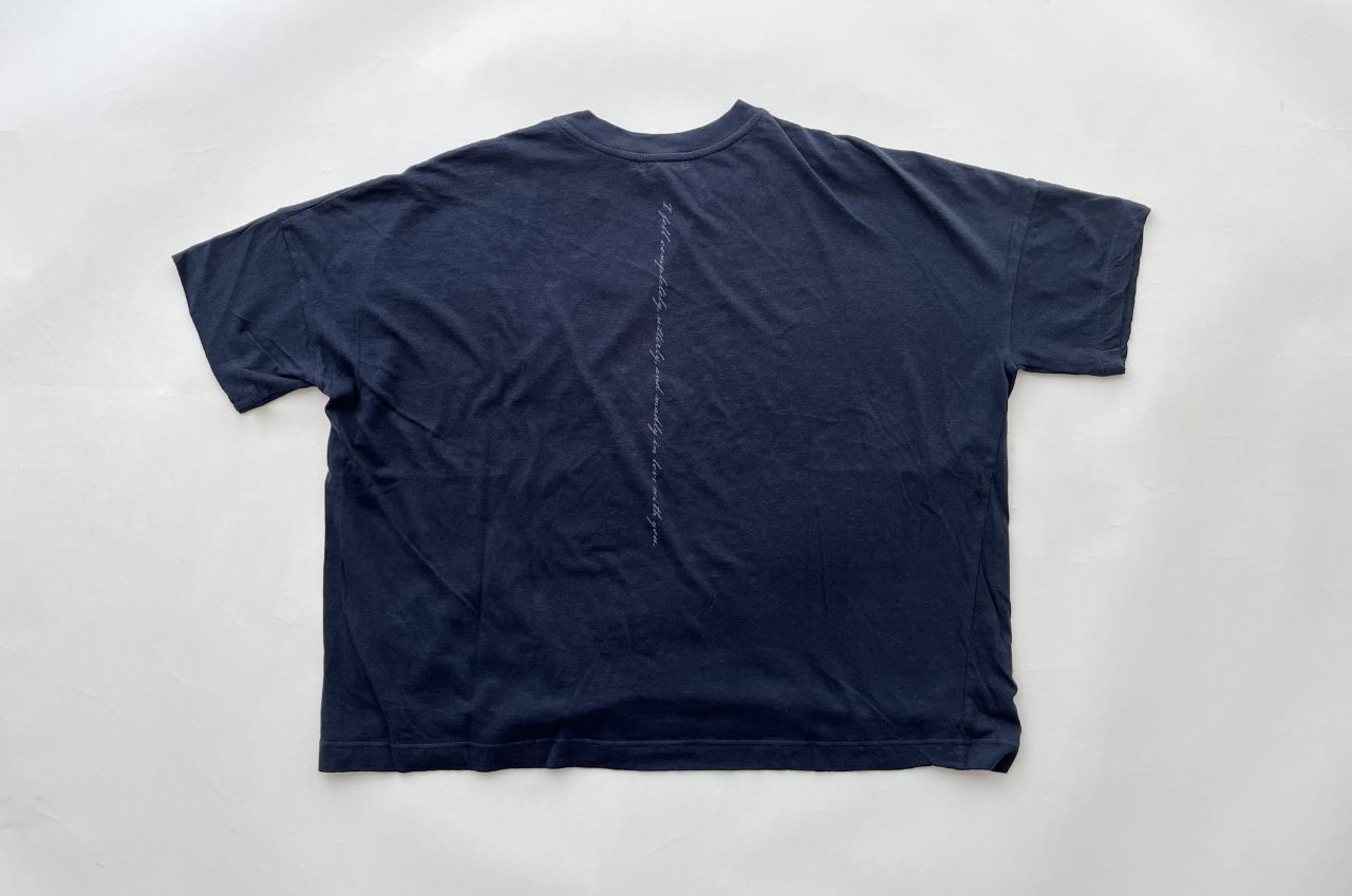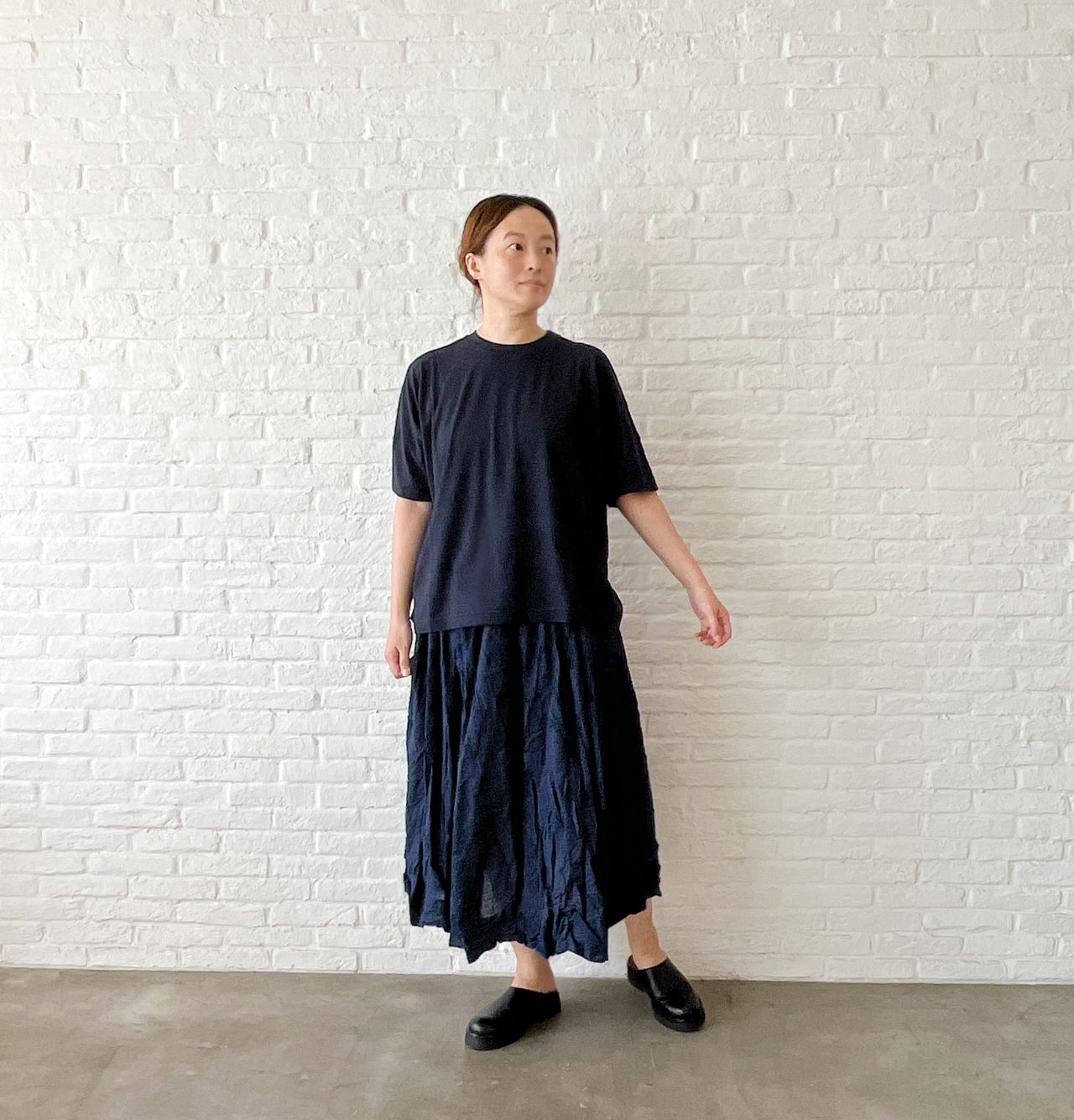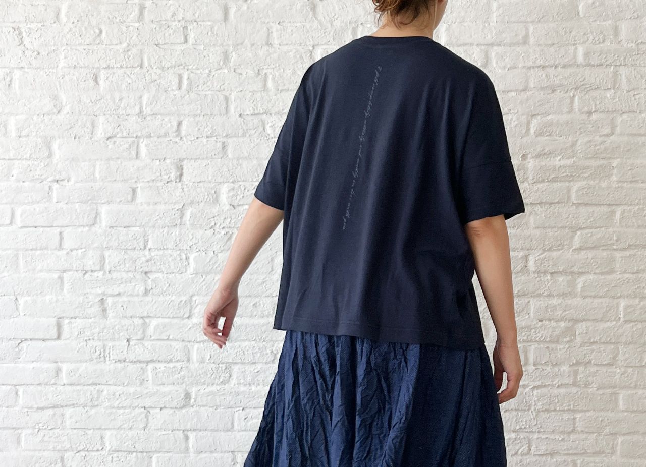 ネイビーのTシャツで『青の世界』を意識しましたが、ホワイト・グレー・クロのモノトーン、ボルドー、ベージュ系と合わせていただいても◎。