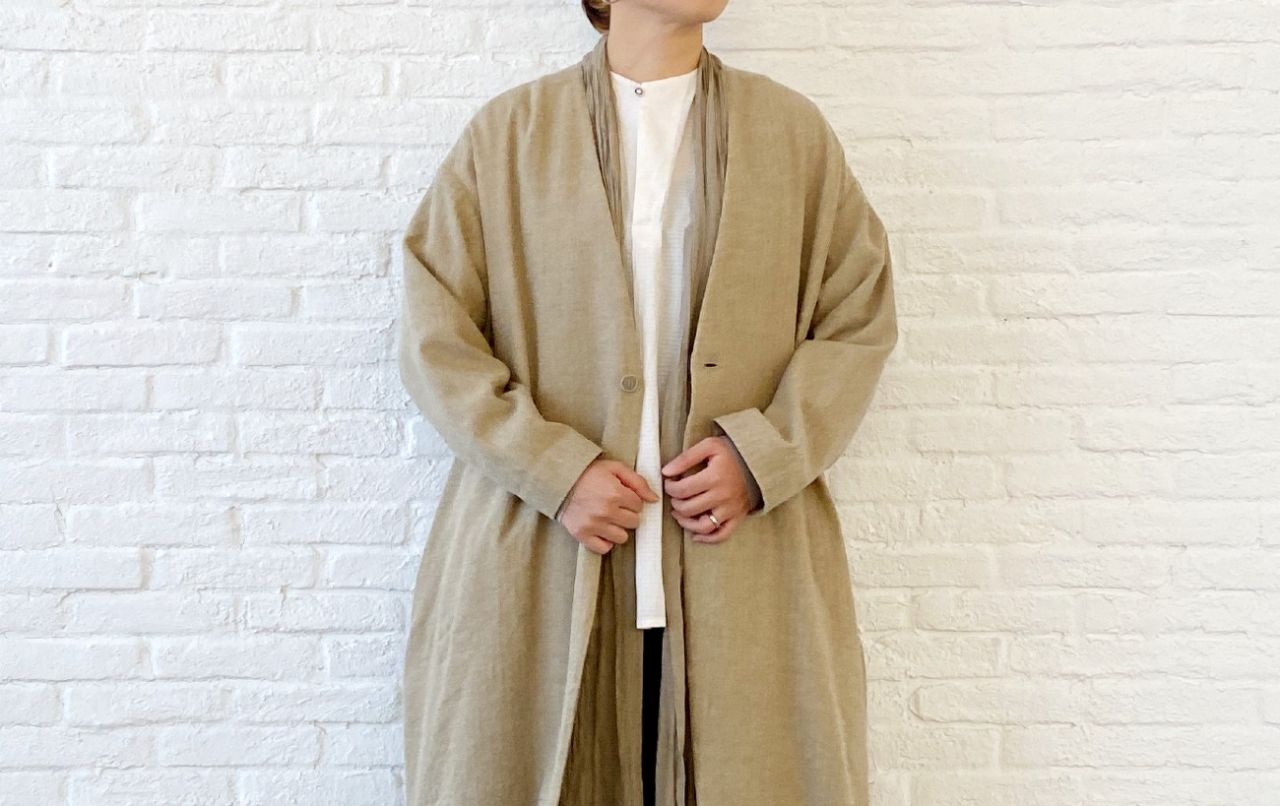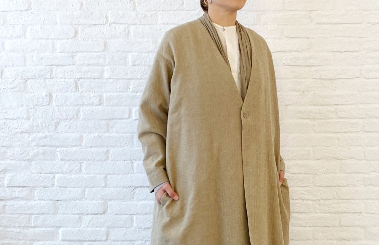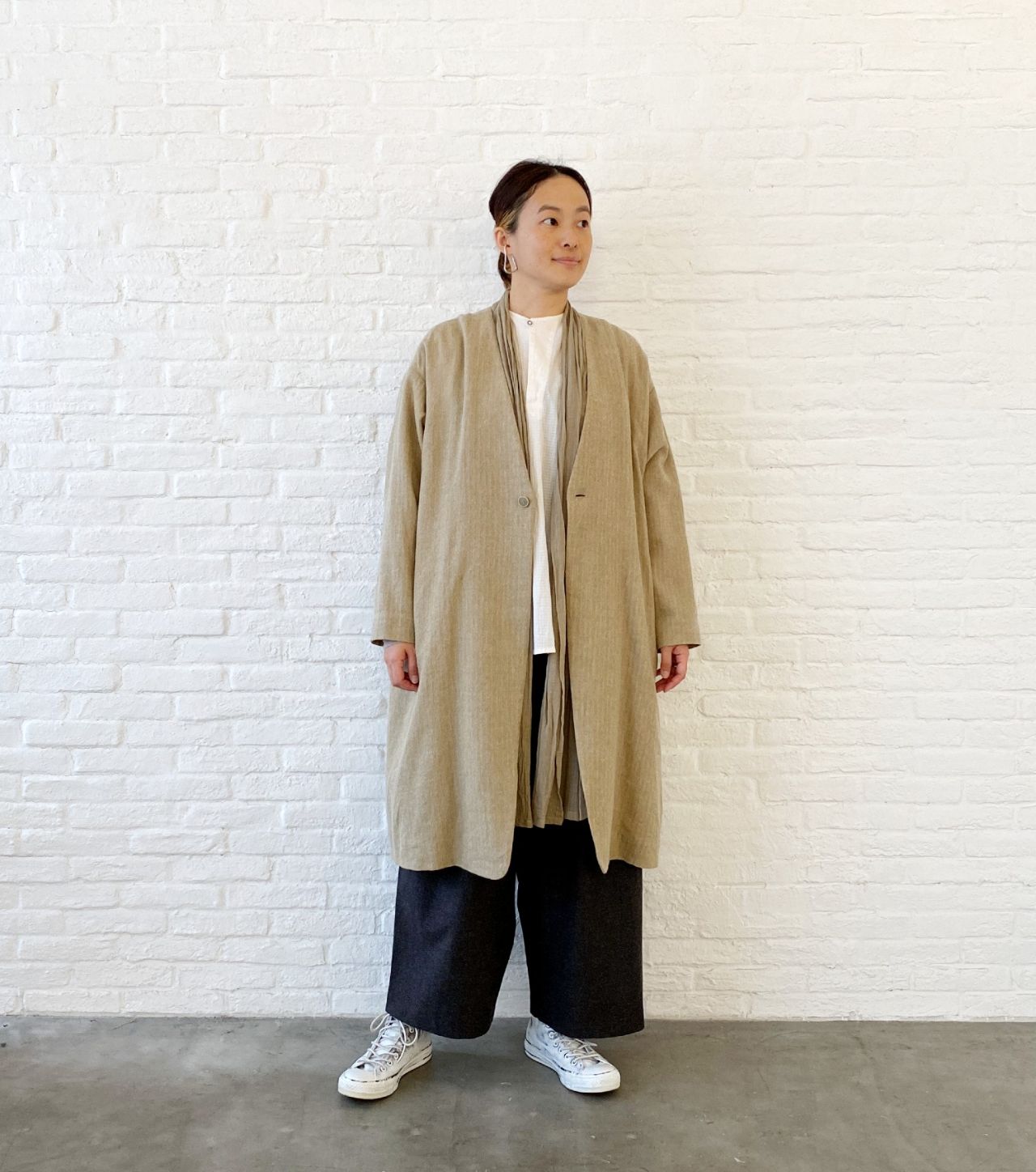 中のライナーはアウターと同じ位の長さ。襟ぐりや裾からチラッと見えた重ね着感が素敵です。
