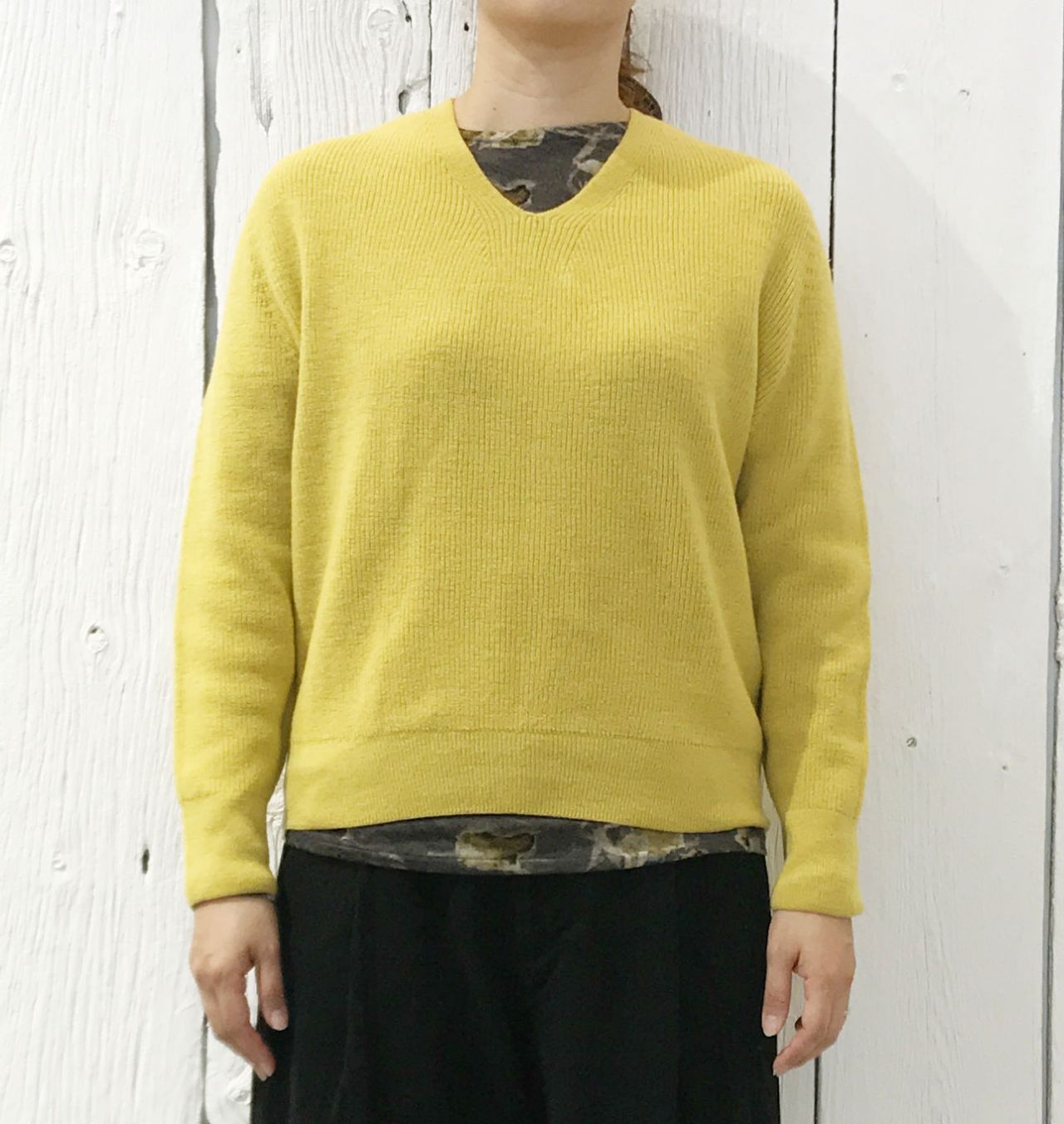柄の中にあるイエローに合わせて、イエローのニットとの重ね着スタイル。