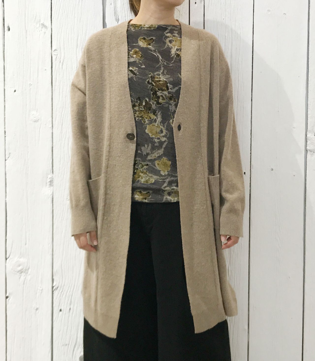 袖も身頃もゆったりしているので、中にスウェットや薄手のジャケットなどを着ていただける、ロングカーディガン。