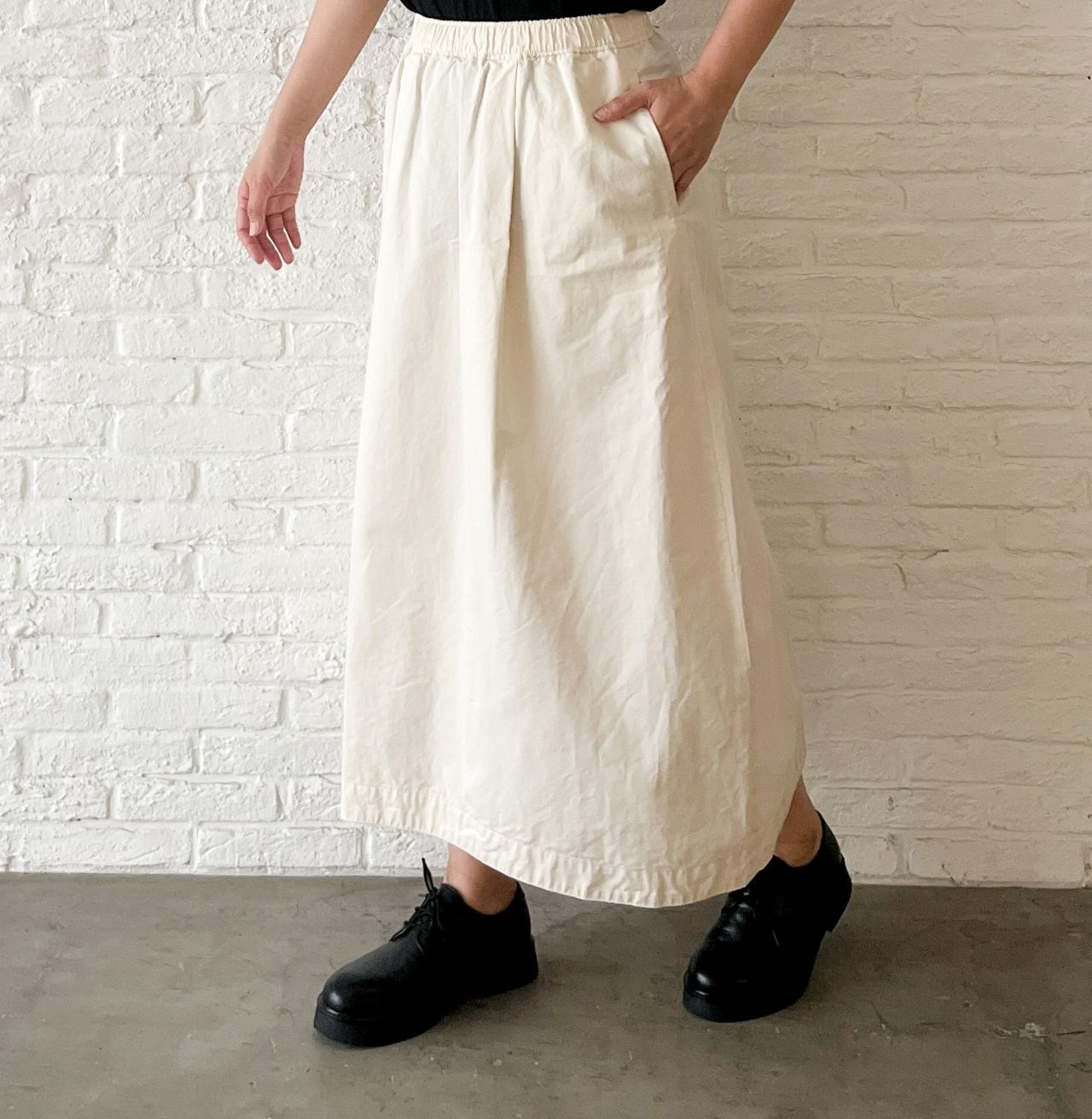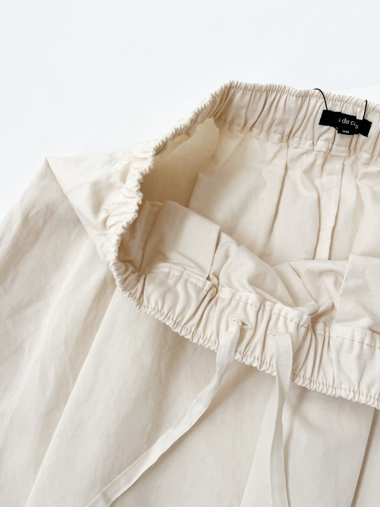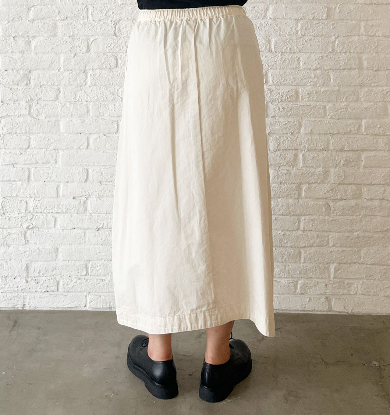 ウエストがゴム+紐で調節できる、コクーンシルエットのスカート。