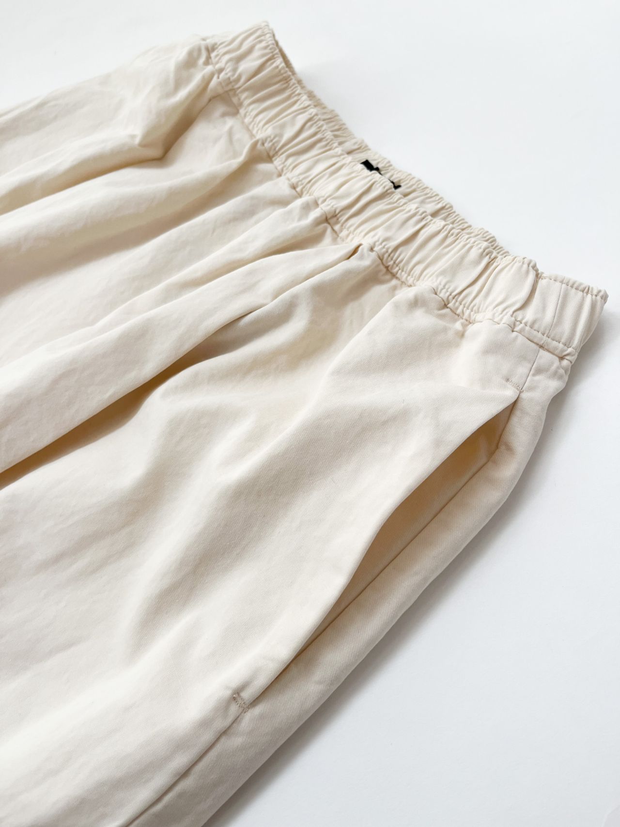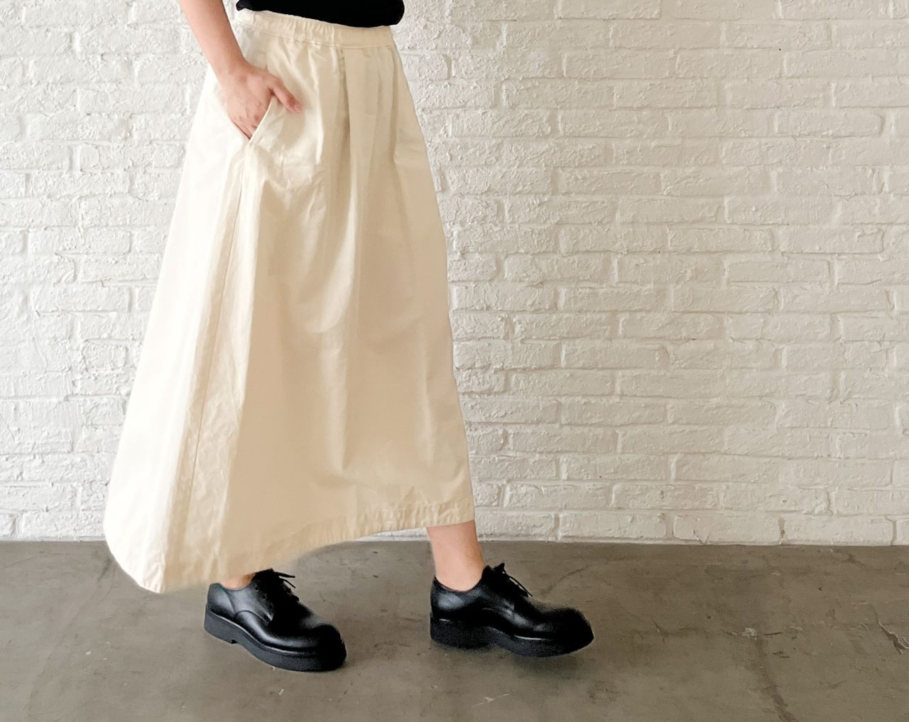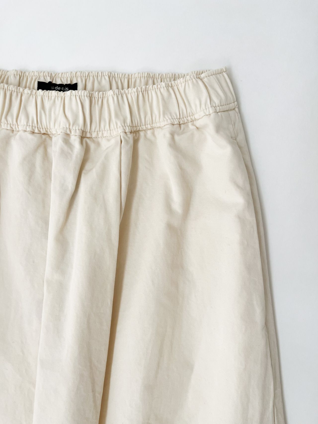 ウエストがゴム+紐で調節できる、コクーンシルエットのスカート。