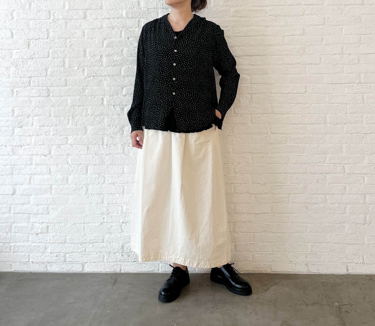 ブラウスやTシャツ、秋冬のニットの下にも合わせられ、裾がチラリと出た重ね着スタイルが◎。