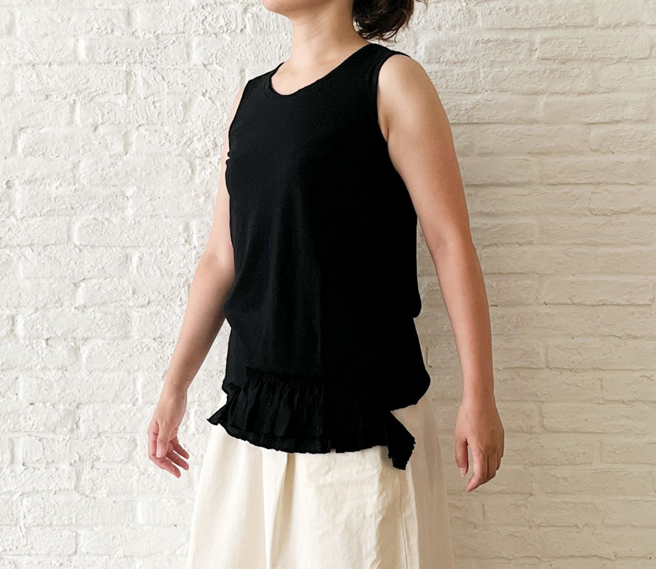 パドカレ定番の 裾にレースをつけたタンクトップ。