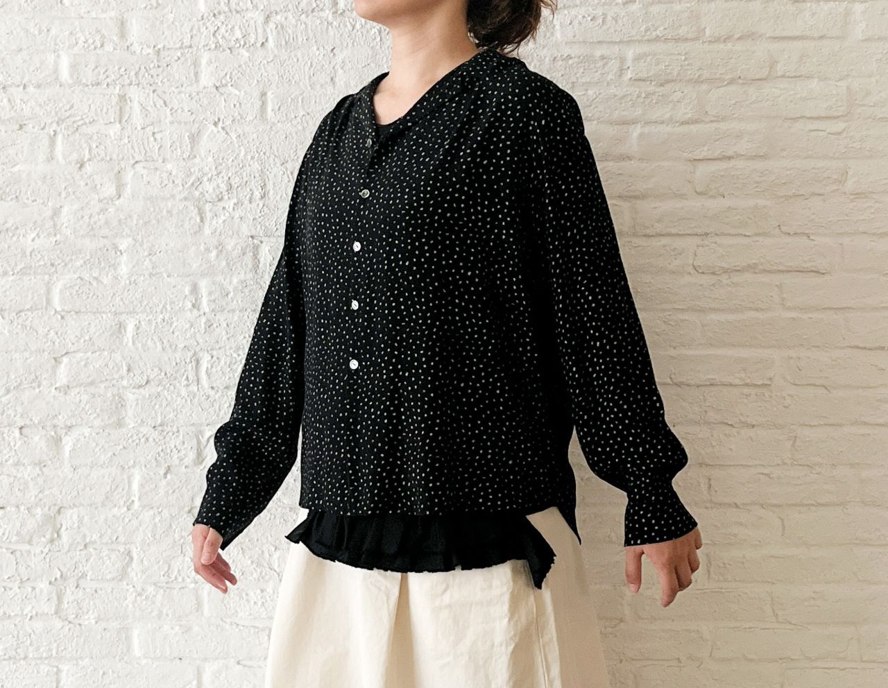 テロッとしたレーヨン素材で作った開襟ブラウス。