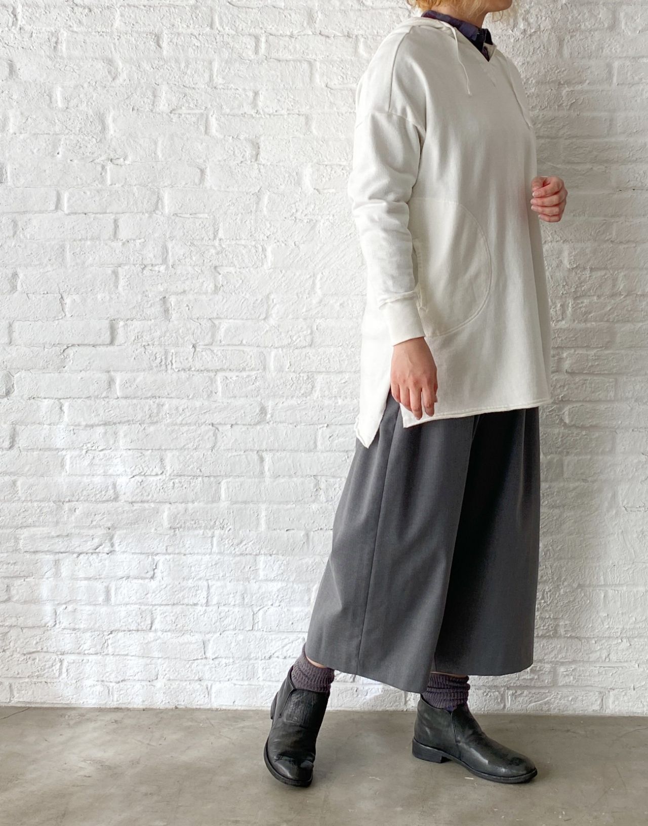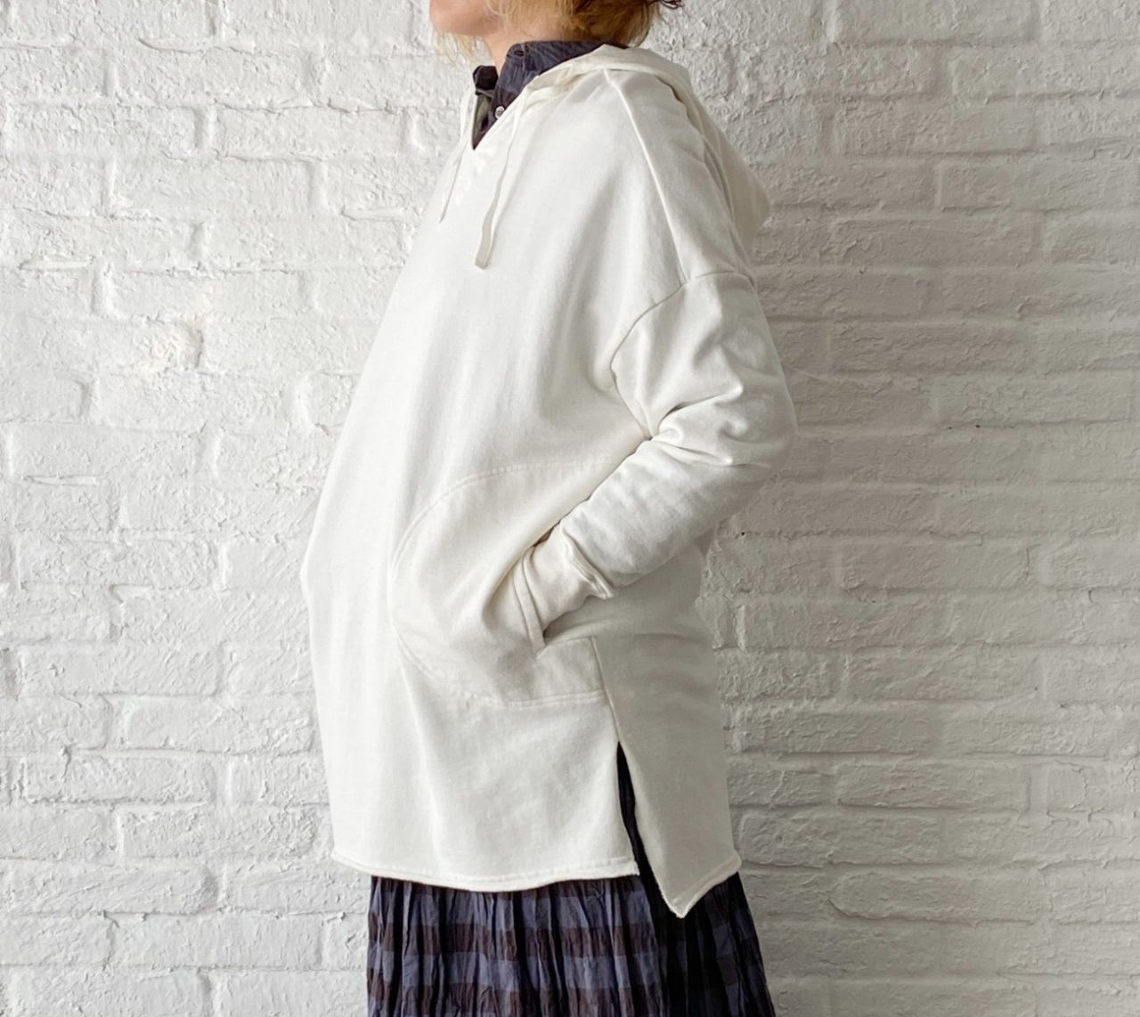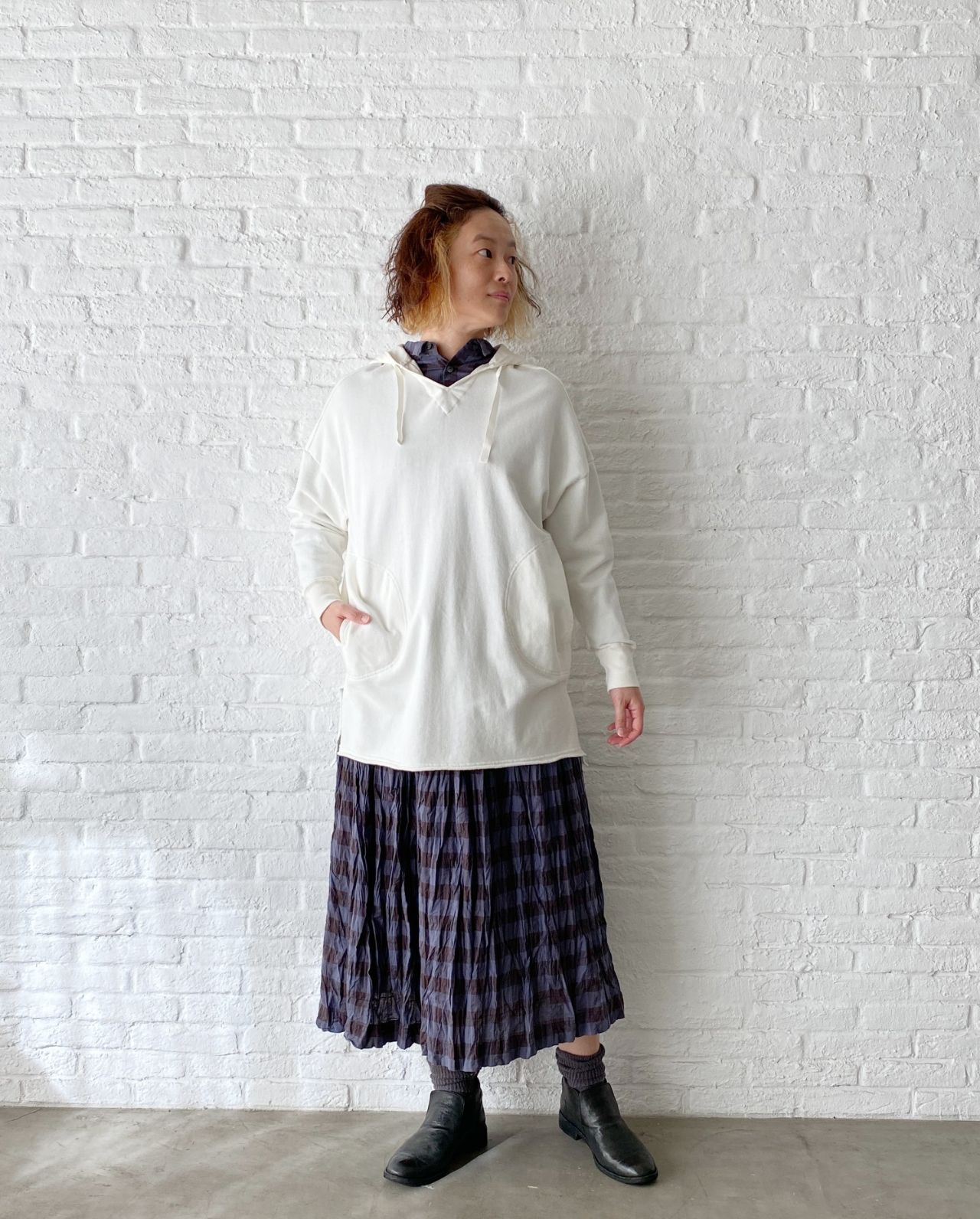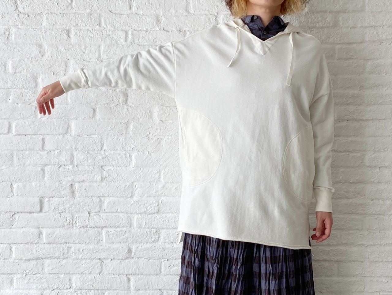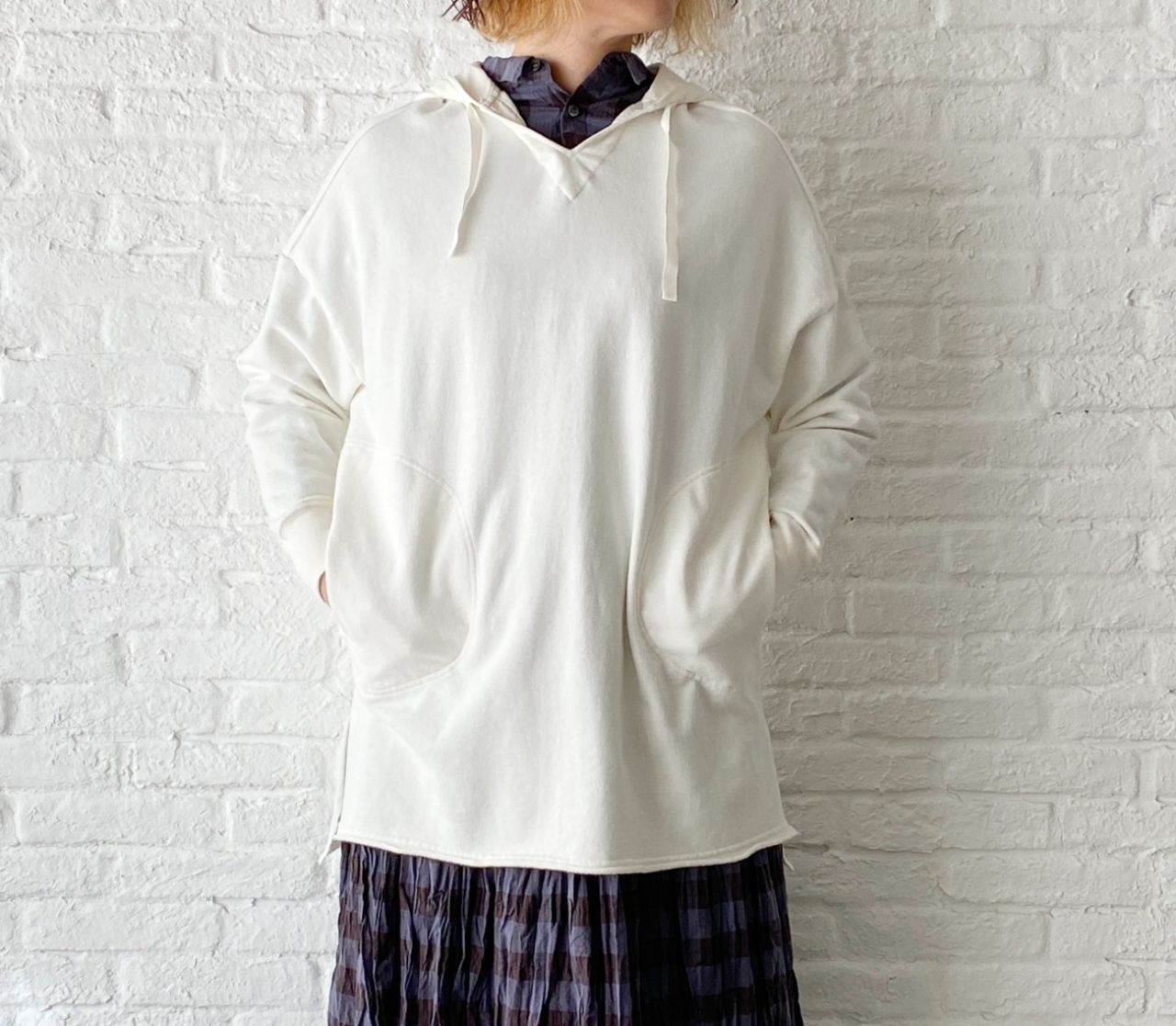 チェックのブラウスは脱いでパーカーだけで着ていただいても、襟の開きは小さいのでバランス良く着ていただけます。