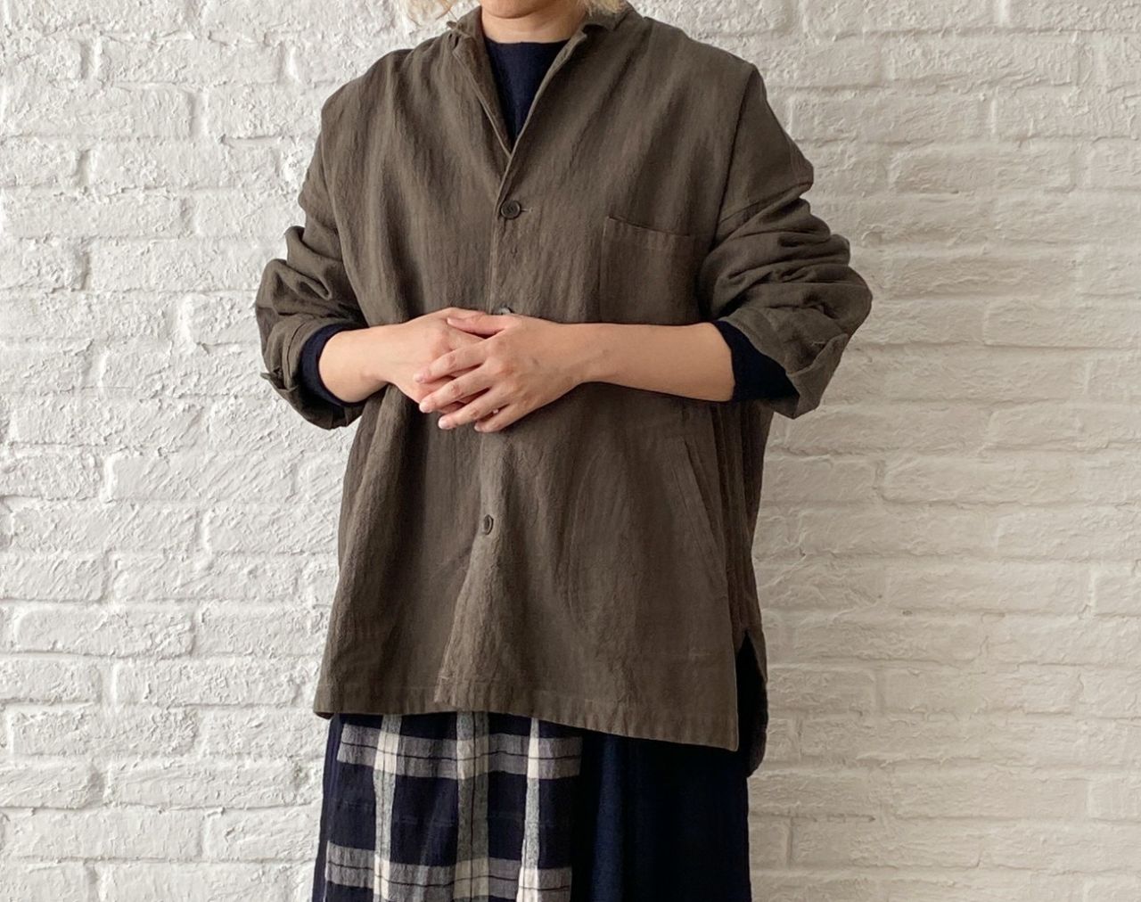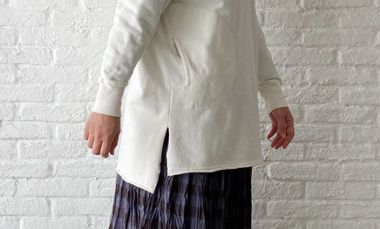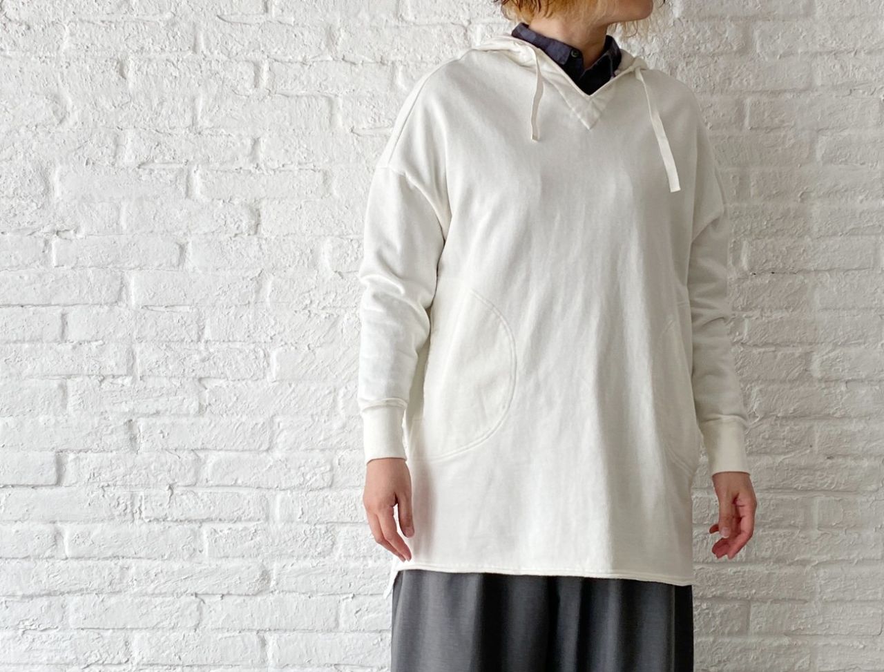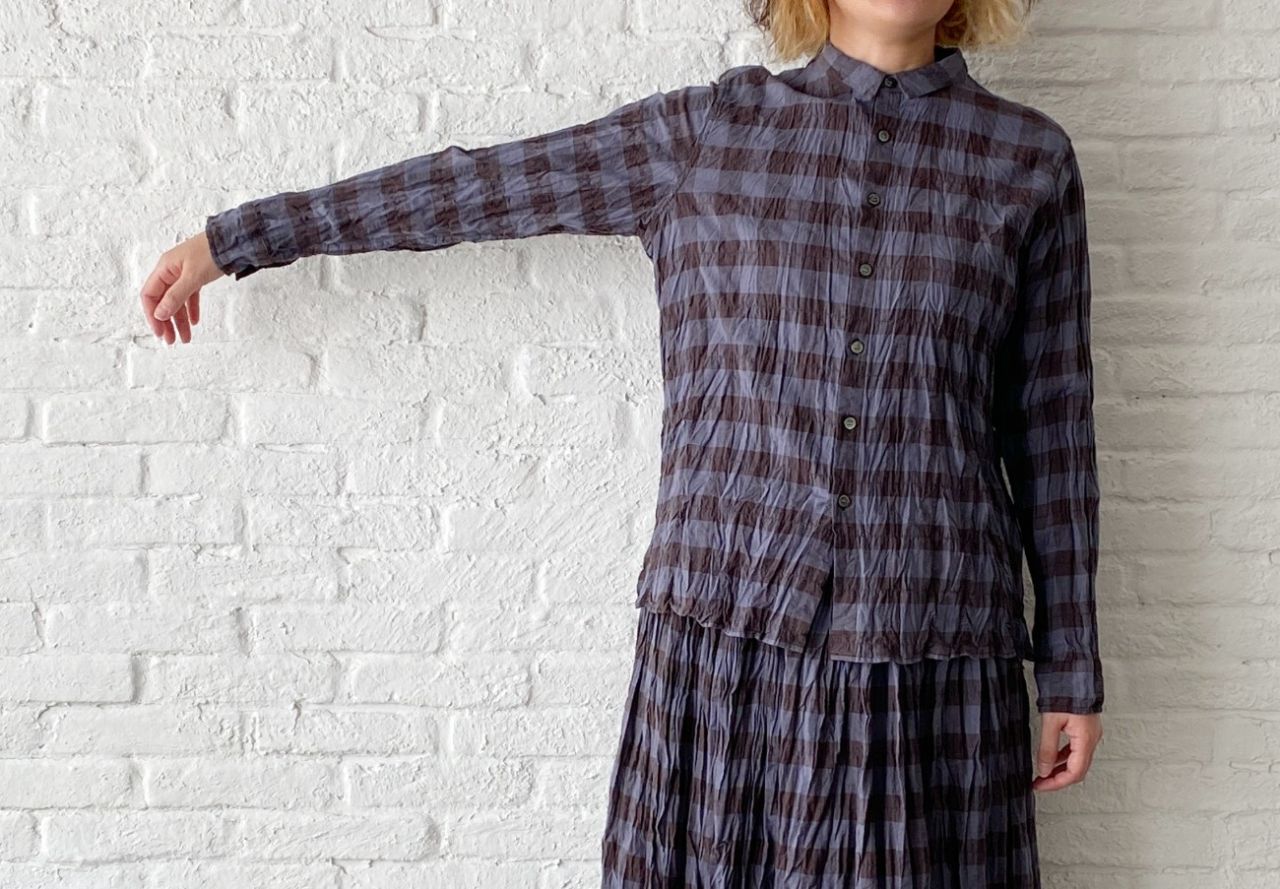 チェックのブラウスは脱いでパーカーだけで着ていただいても、襟の開きは小さいのでバランス良く着ていただけます。