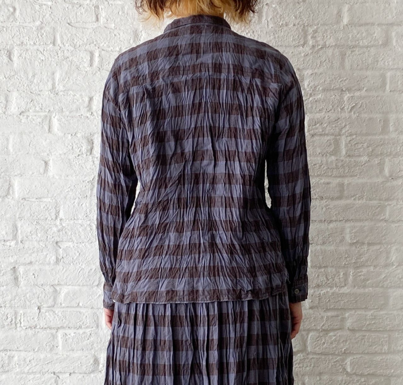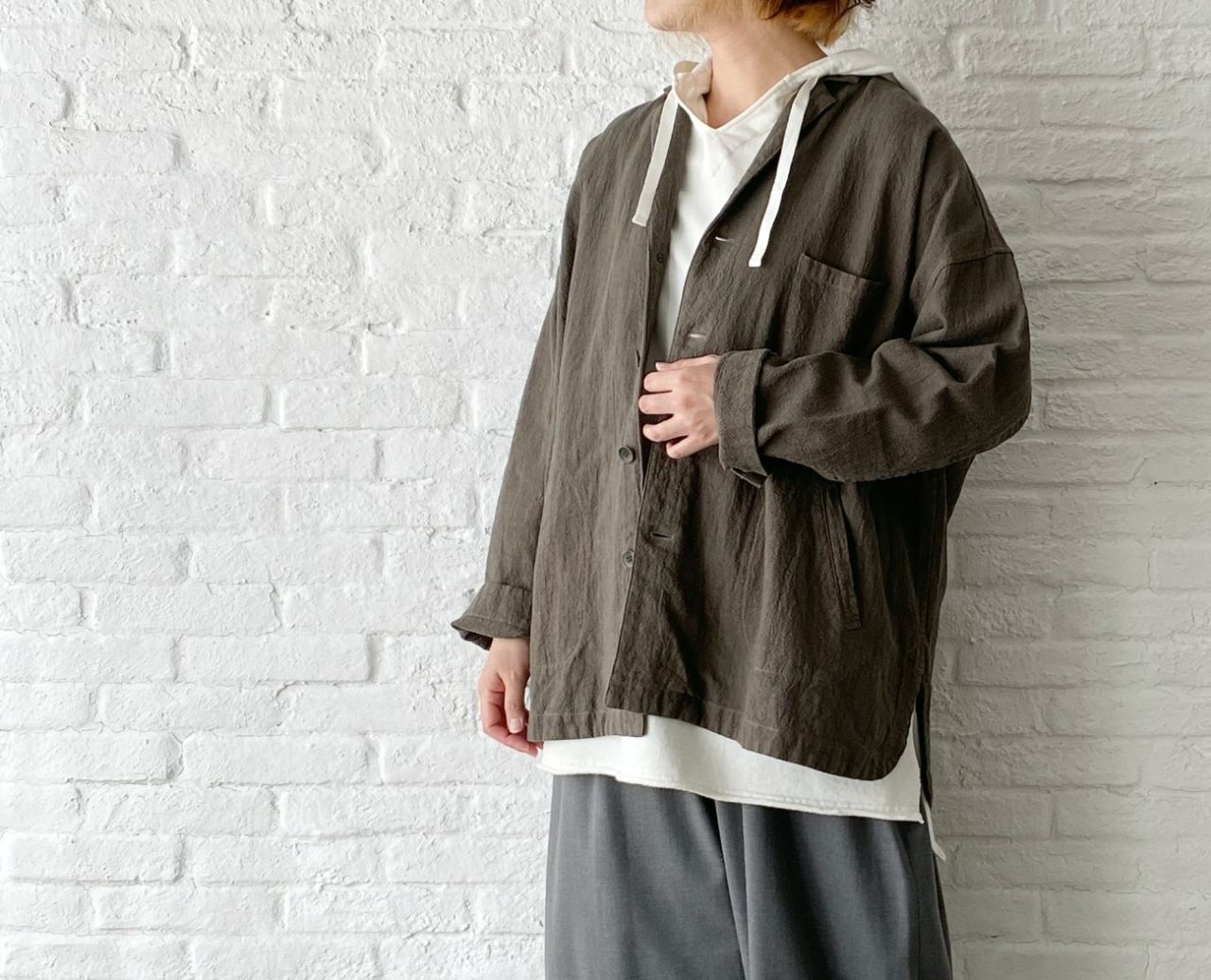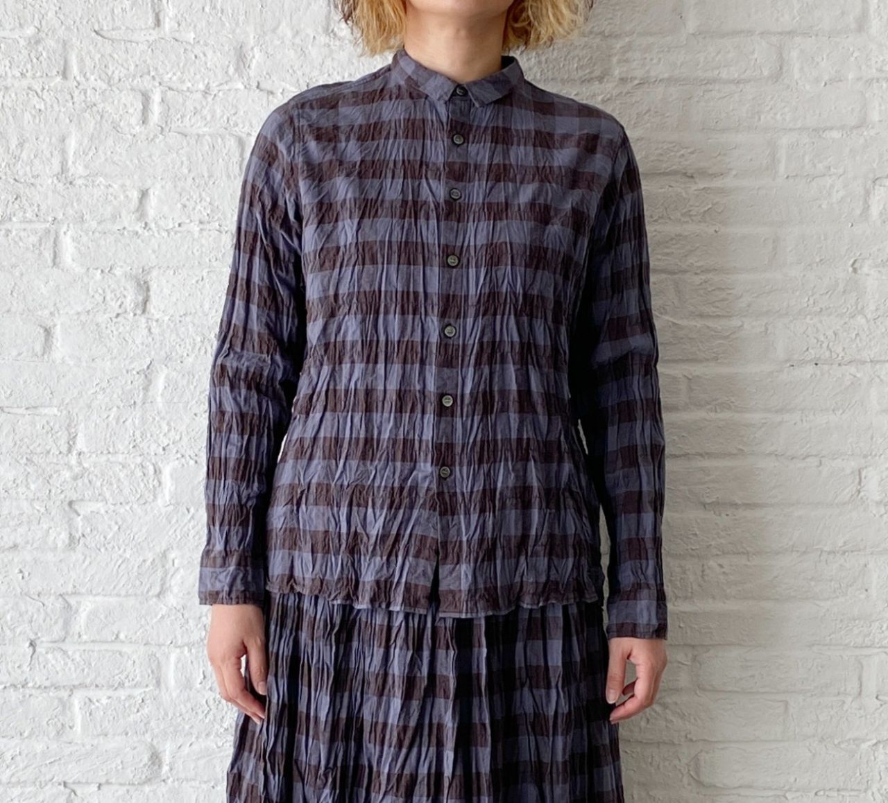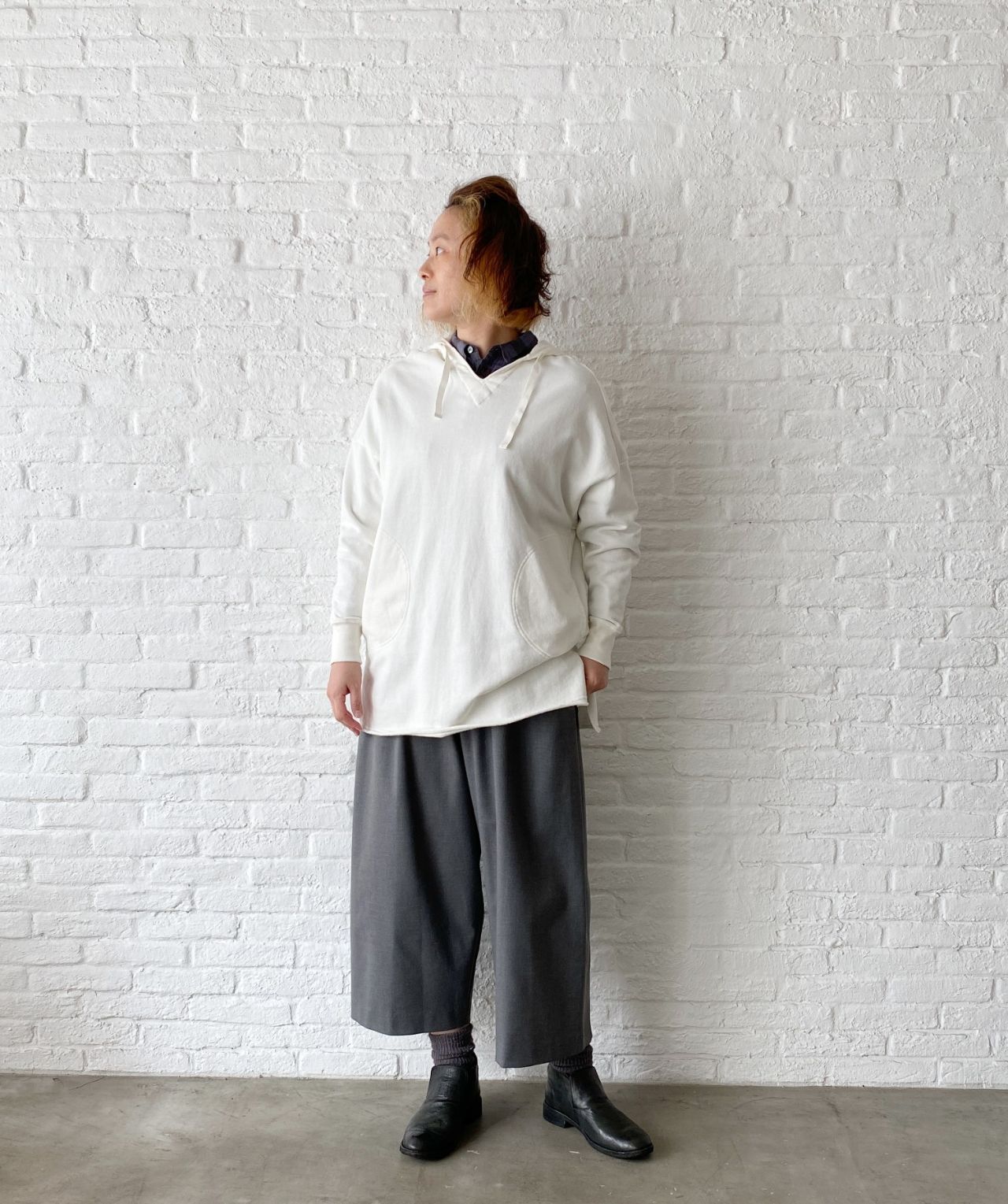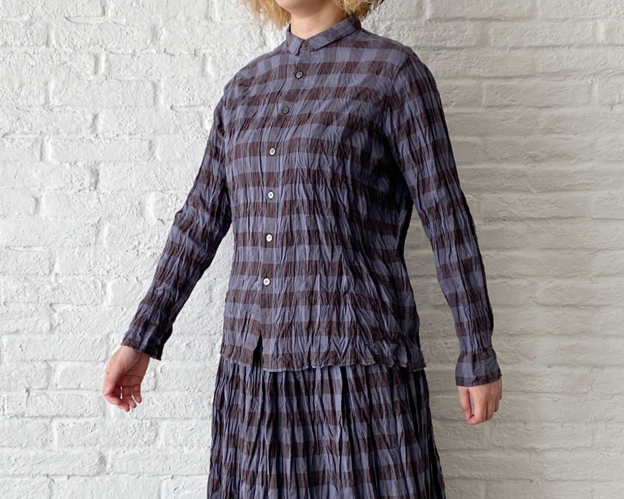 チェックのブラウスは脱いでパーカーだけで着ていただいても、襟の開きは小さいのでバランス良く着ていただけます。