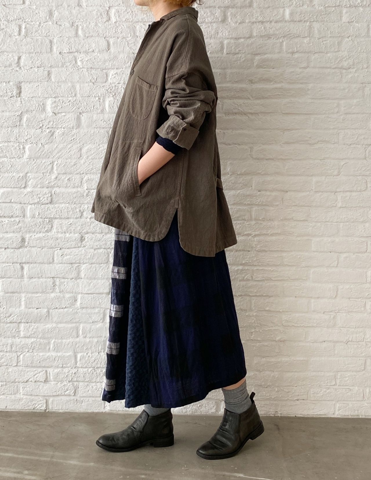 ブラウスは中にタートルカットソーを着て、冬の着こなしを楽しんでいただいても。