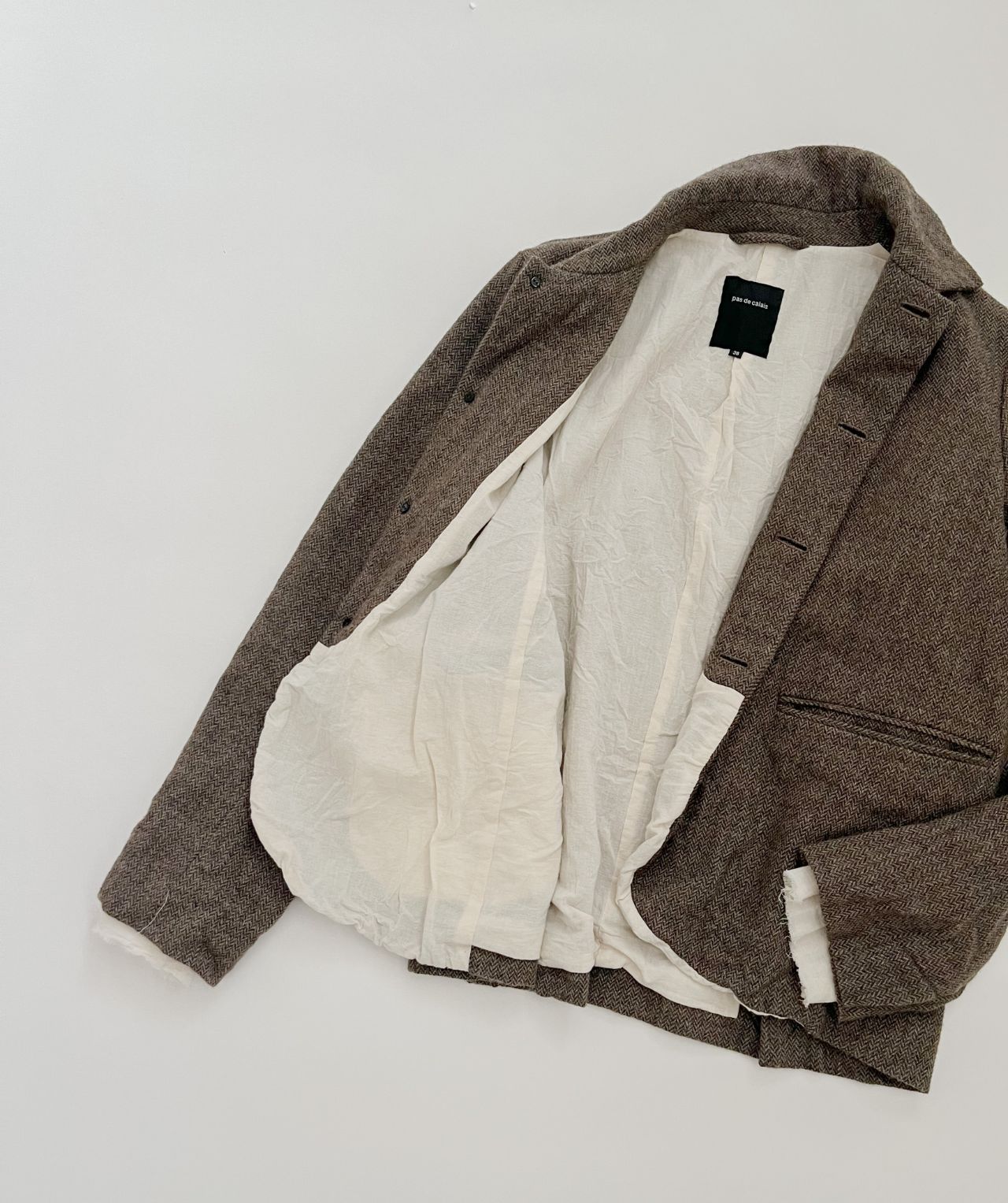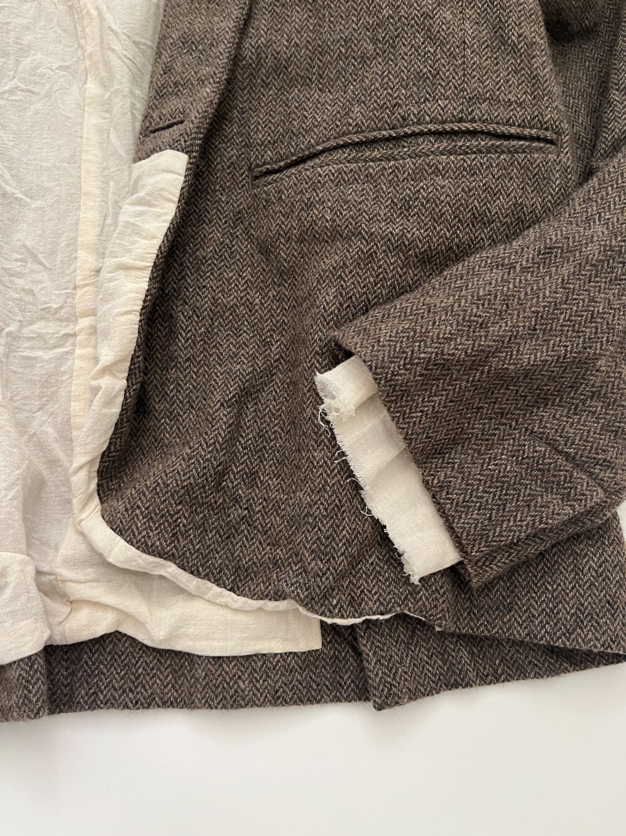 袖口からカットオフした綿麻ボイルの裏地がちらり、丸みを出した裾から裏地がちらり。