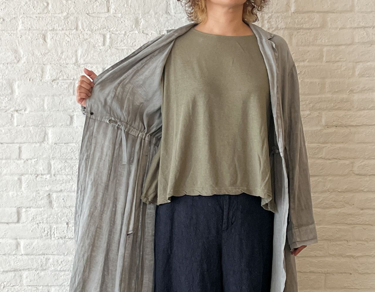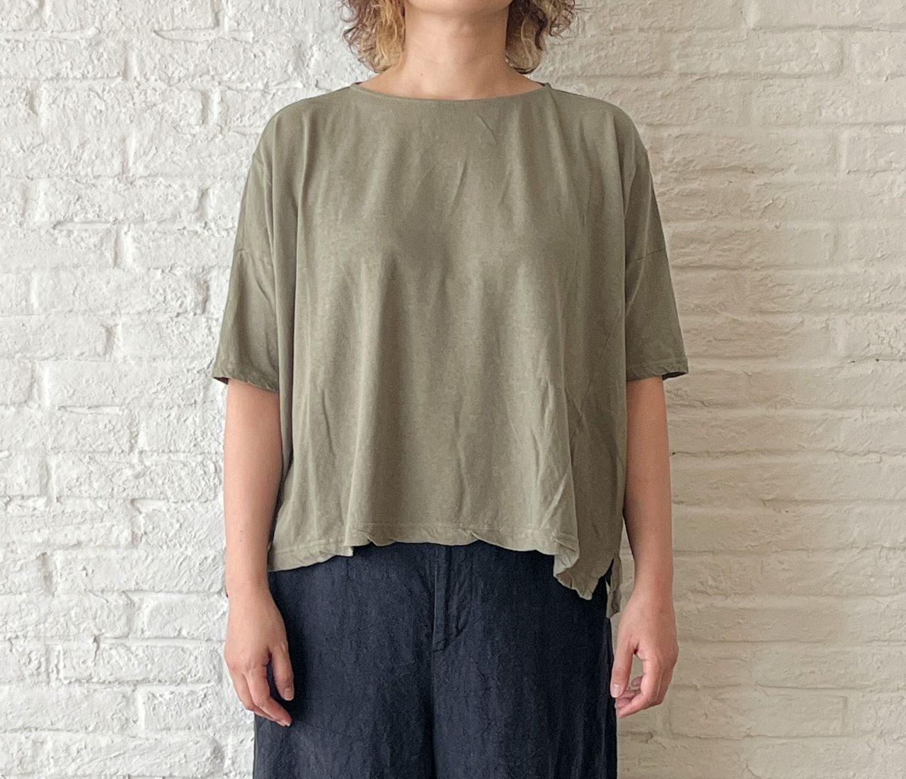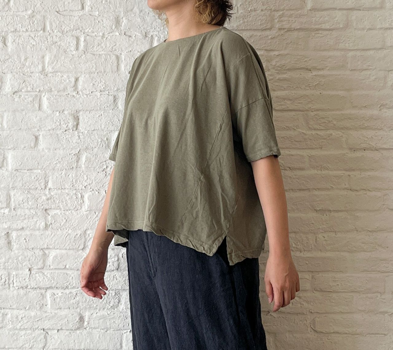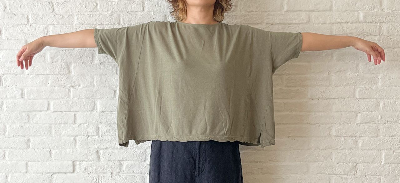 バスト140cmを超えるゆったりしたワイドタイプですが、着るとゆとり分が落ちて左右が長くなるシルエットに。