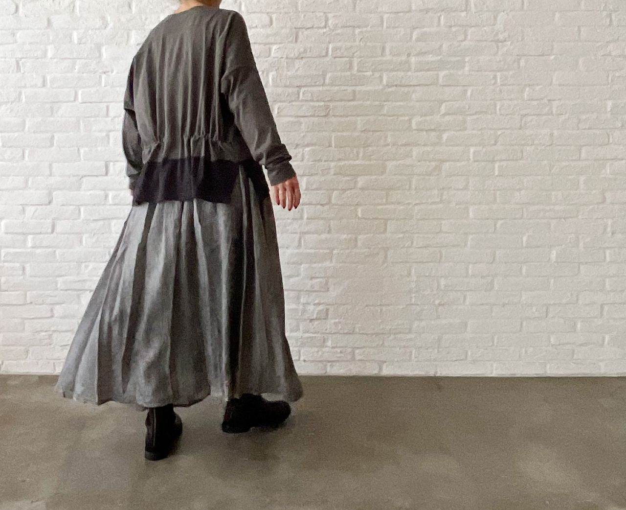 後ろのウエスト部分にだけ紐を通して、絞っても、そのままストンとでも着ていただけるデザインです。