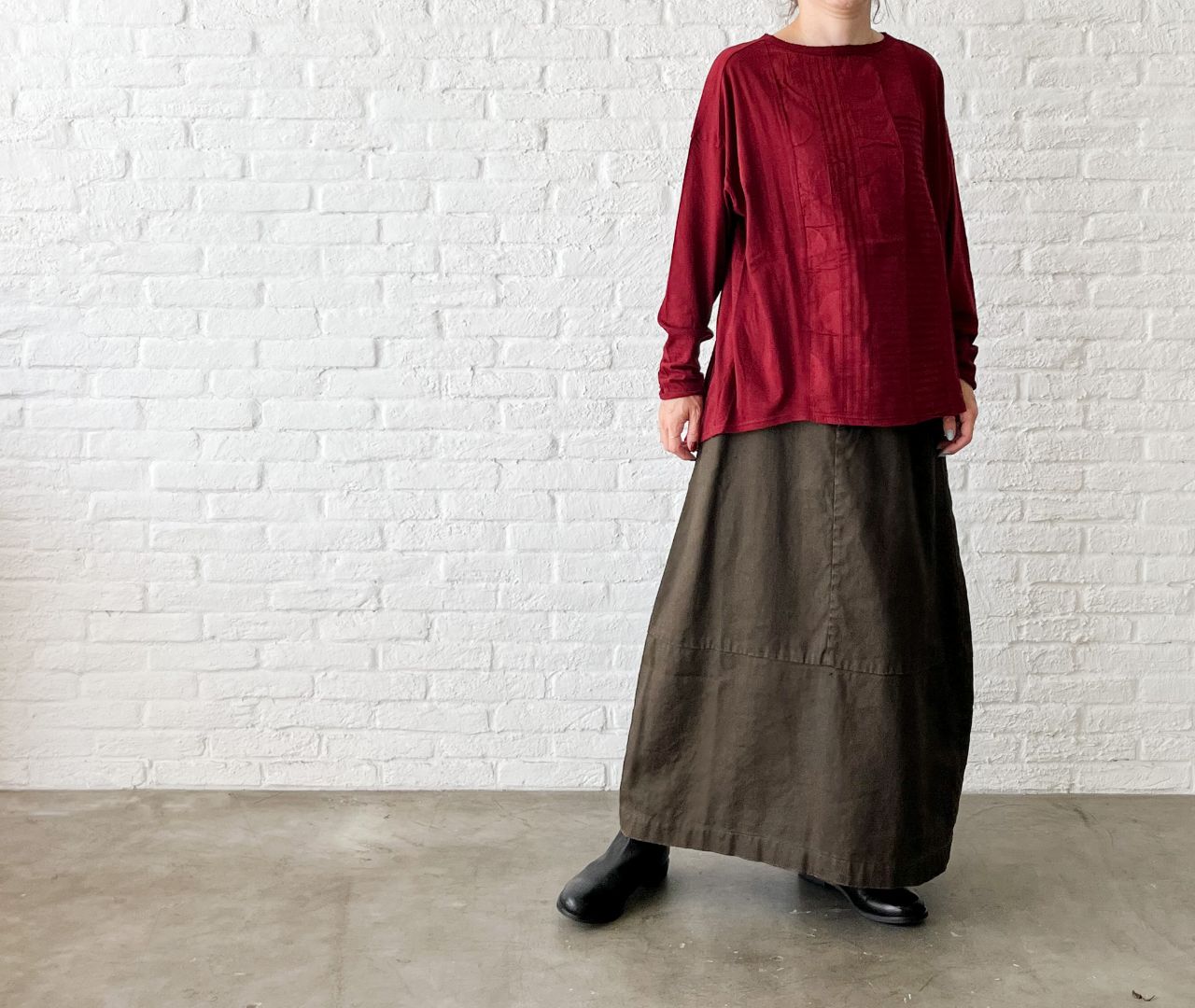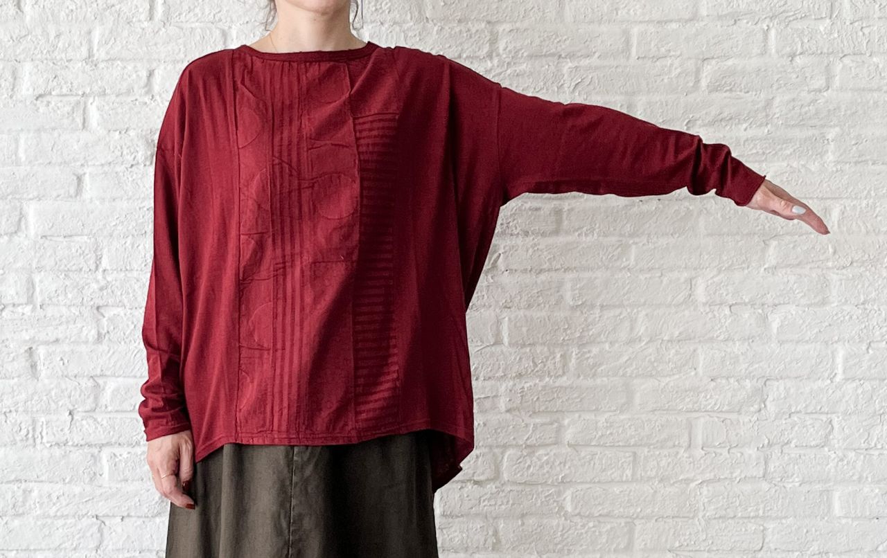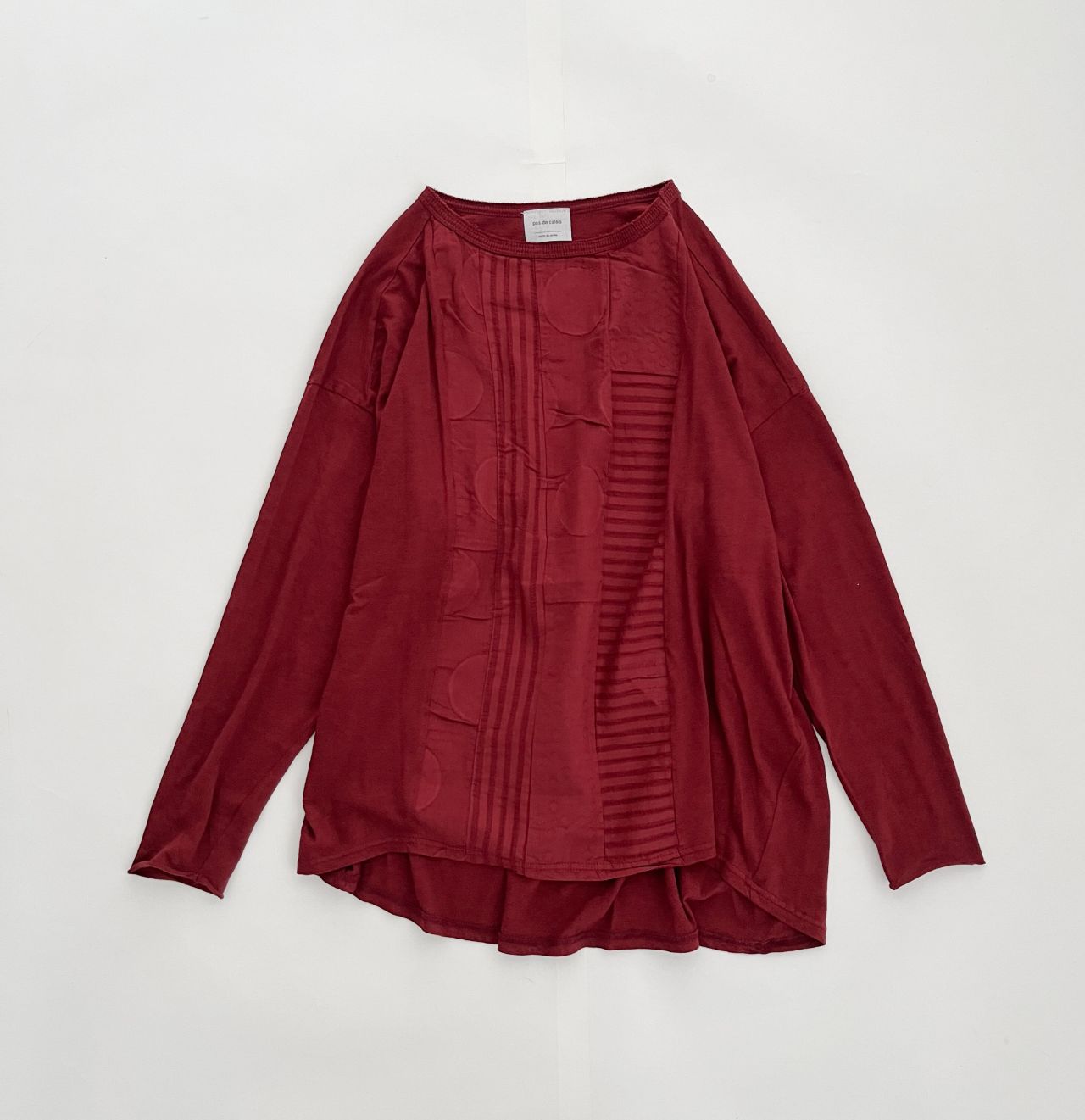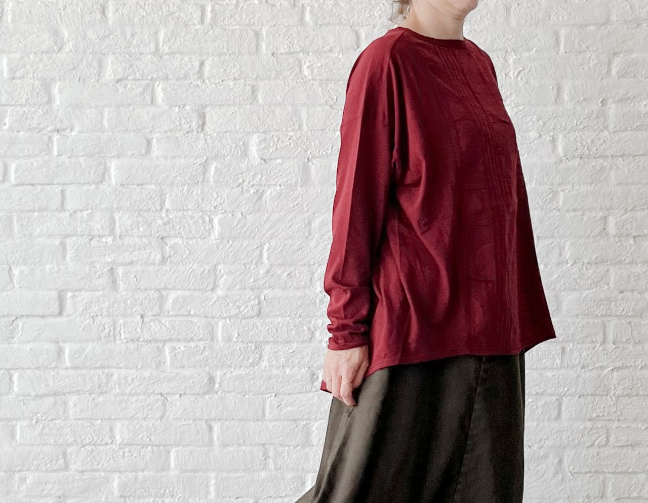 カットソー素材の前身頃に何種類かの素材を切替えてポイントにしていて、1枚で主役になるデザインです。