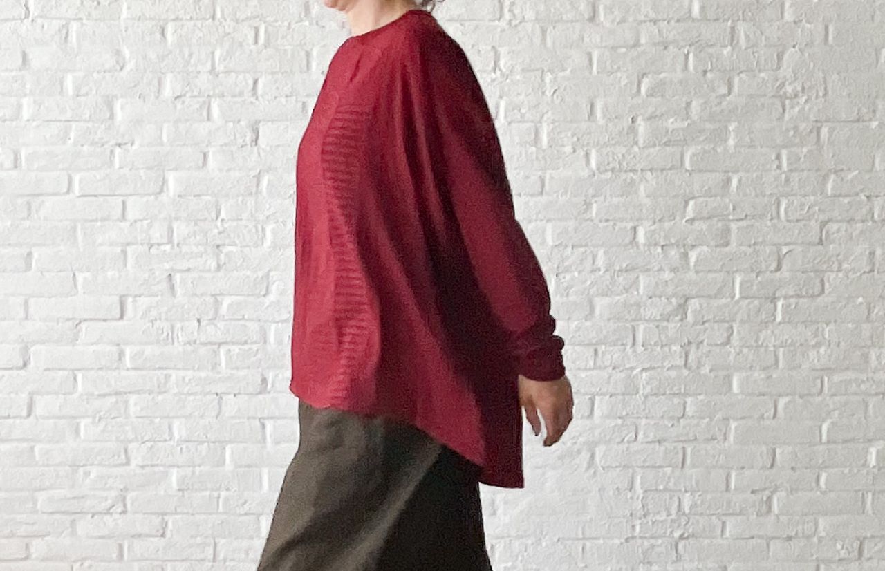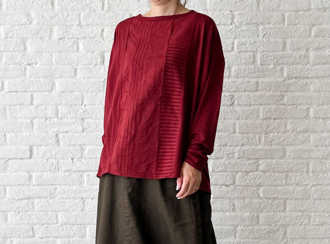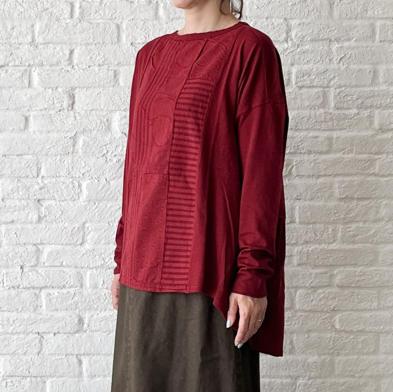 カットソー素材の前身頃に何種類かの素材を切替えてポイントにしていて、1枚で主役になるデザインです。